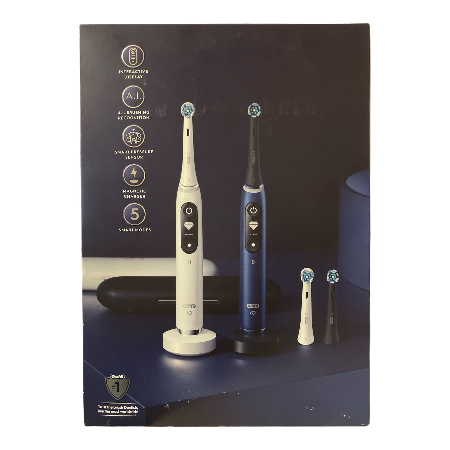 Oral-B iO Series 7 Electric Toothbrush, Sapphire Blue & White Alabaster (2 Pack) The Oral-B iO Series Rechargeable Toothbrush is the perfect choice for anyone looking for a professional clean feeling every day. With five Smart Modes, interactive display, and AI recognition, this toothbrush has everything you need to get a great brushing experience.