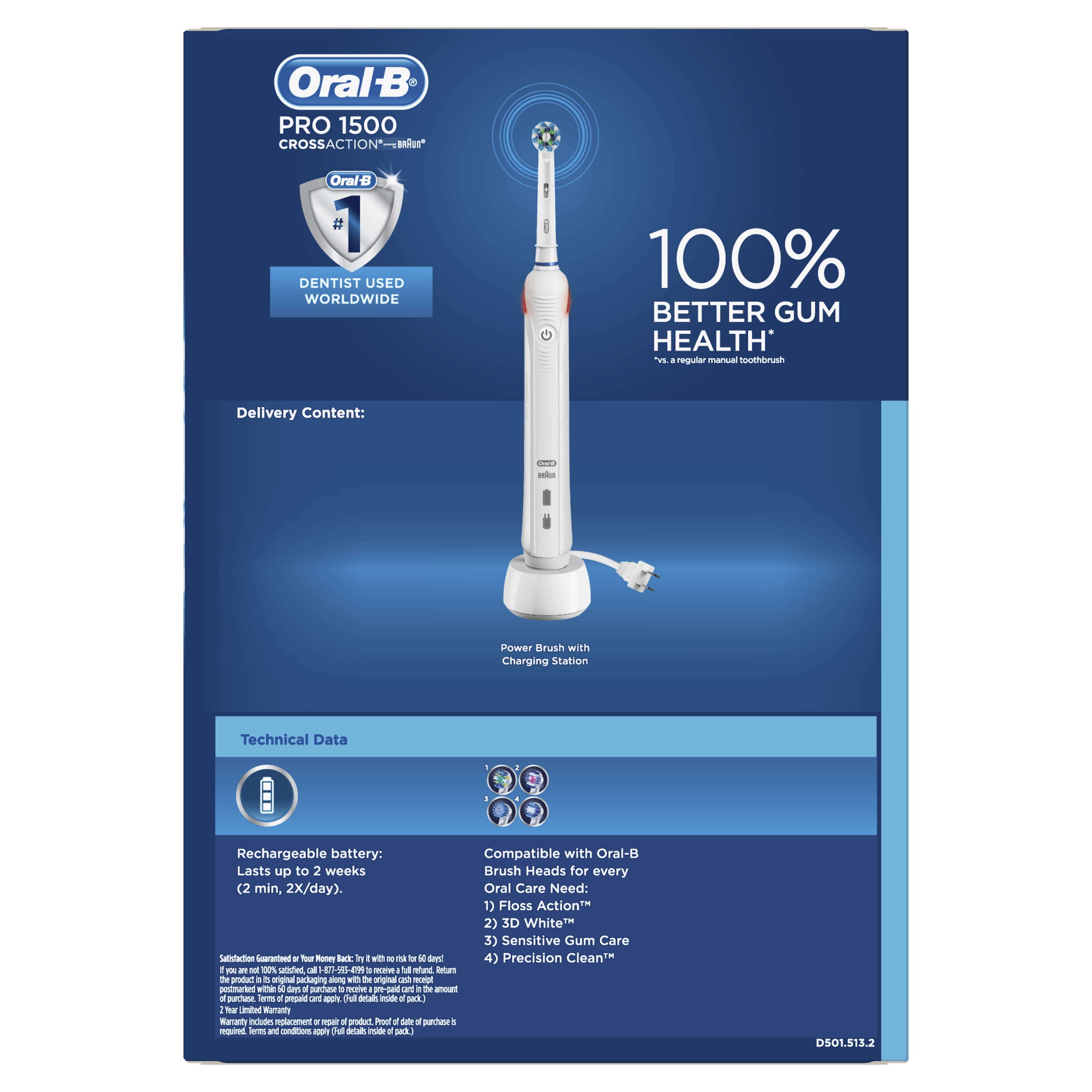 The Oral-B Pro 1500 Power Rechargeable Electric Toothbrush provides a clinically proven superior clean*. The professionally inspired design of the CrossAction toothbrush head surrounds each tooth with bristles angled at 16 degrees and removes up to 300% more plaque along the gum line*. The brush’s 3D cleaning action oscillates, rotates, and pulsates to break up plaque. The pressure sensor lights up if you brush too hard to prevent harmful over-brushing. The brush has 1 mode, plus an in-handle timer to help you brush for a dentist-recommended 2 minutes. Best of all it is brought to you by Oral-B – the #1 brand used by dentists worldwide. *vs a regular manual toothbrush
