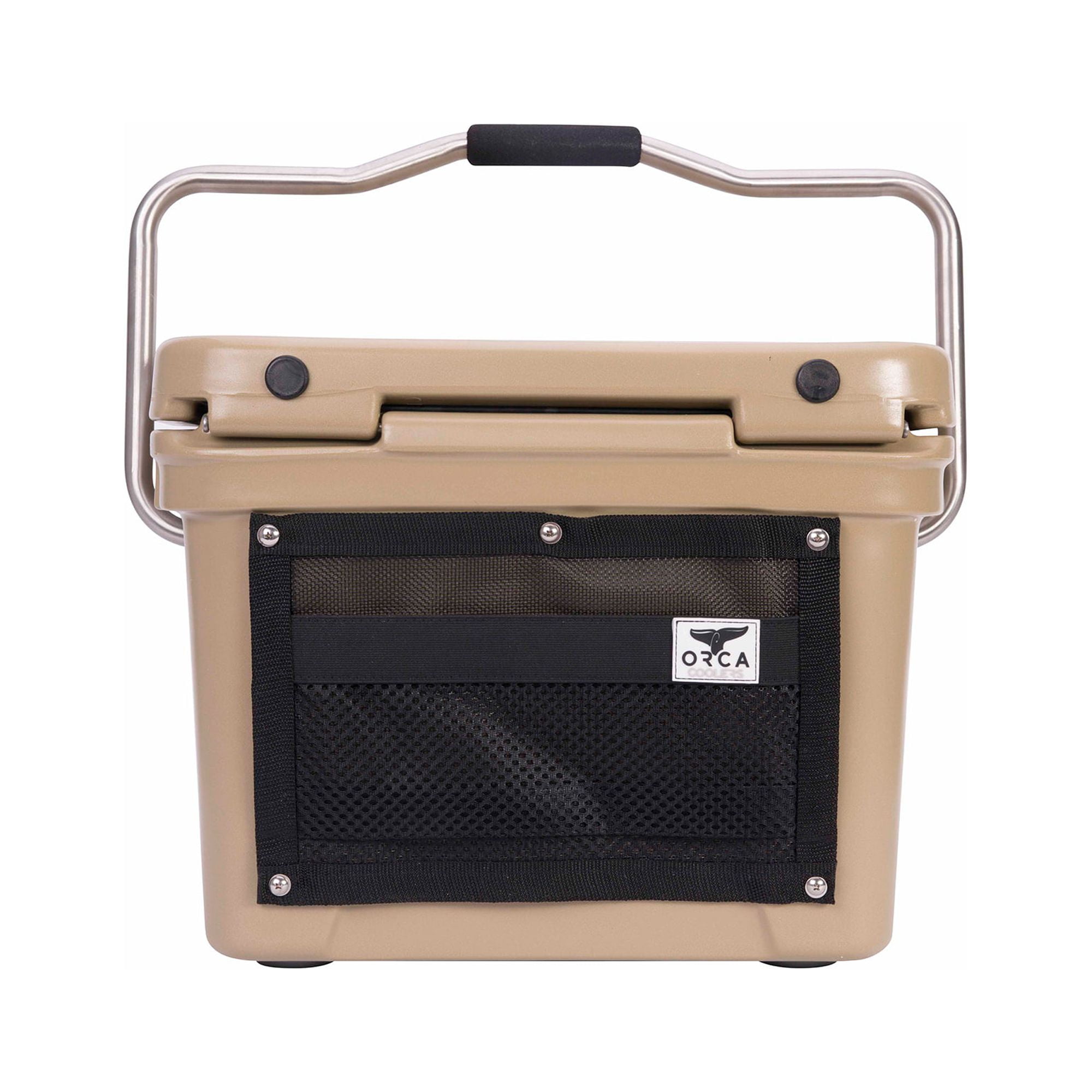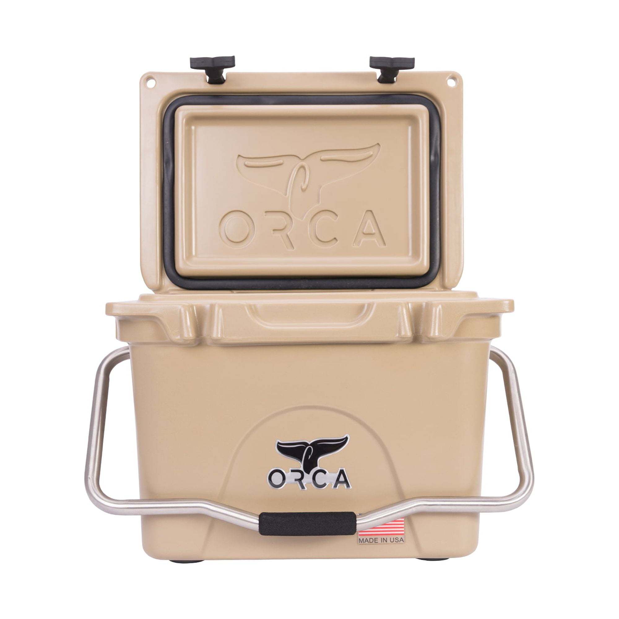 ORCA Tan 20 quart hard-sided cooler 20-quart storage capacity holds up to 5 gallons, 18 cans, or 15 bottles. Interior dimensions: 9.88″H x 13.44″W x 9″D Durable and rugged roto-molded construction Integrated insulation for maximum ice/cold retention and freshness of your stowed items for up to 10 days Cold-sealing lid gasket and T-handle latches to ensure a perfect seal Extendable flex-grip handles for comfortable solo or tandem portage Cargo net attachment for added storage Easy-flow drainage spout