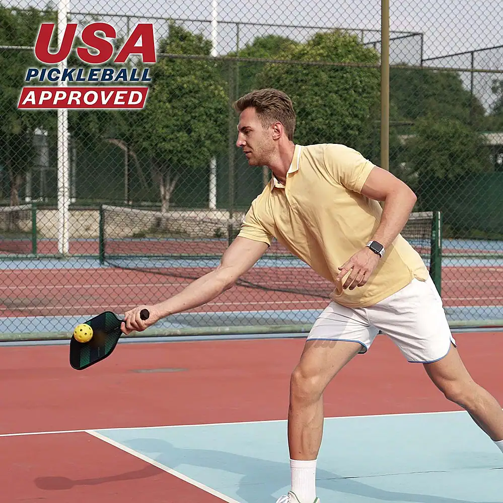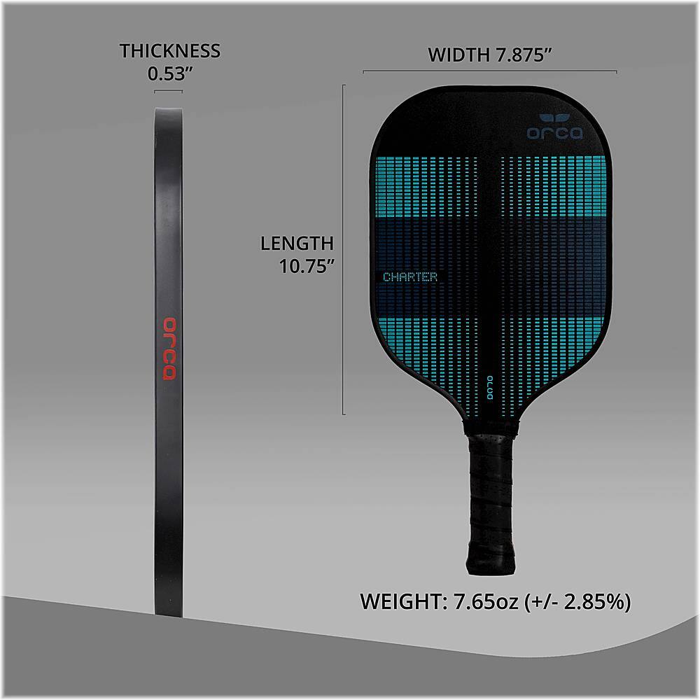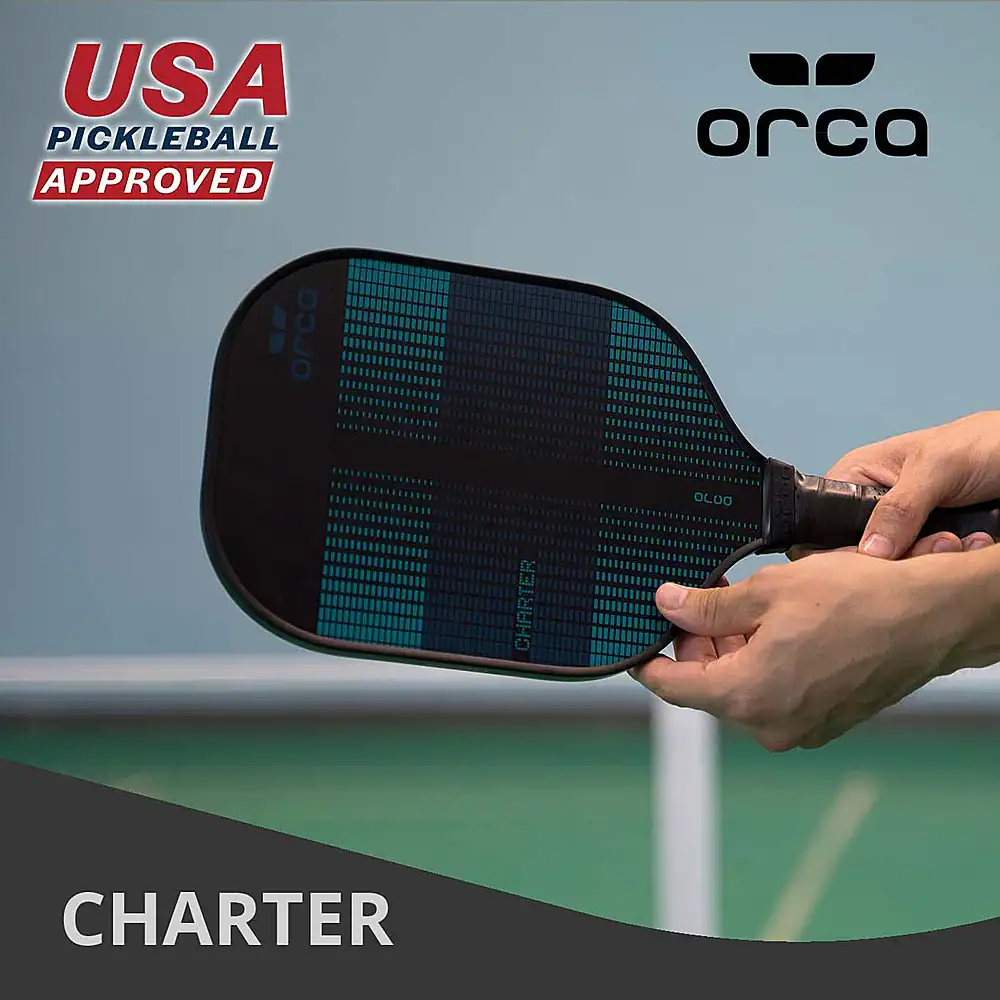 Experience high-performance gameplay with the Charter Pickleball Paddle Set from Orca Paddle Co.! These pickleball rackets for adults are designed to be durable and high-quality to ensure you can enjoy fast, fun pickleball games. Each set includes 1 black and teal paddle, 1 yellow indoor ball, and a neoprene cover to protect your paddle when not in use. Our USAPA pickleball paddle will elevate the game for any player! This is a layered polymer honeycomb pickleball paddle that is designed to be lightweight and easy to handle. This pickleball paddle has a fiberglass surface that provides more power to help accelerate ball speed. Plus, there is an extra thin rim guard that helps protect the edge from dents and scratches to ensure it lasts. With a comfortable handle, this racquet has an anti-slip PU compound grip that is ideal for all weather conditions. At Orca Paddle Co., we have made it our mission to provide players of any level with high-quality pickleball rackets and balls that help them master the game. These pickleball paddles for beginners, intermediate and advanced players are designed to meet USAPA standards, and each paddle weighs 7.6 ounces. Our pickleball accessories are perfect gifts for anyone who wants to play, whether they are playing recreationally or life-long players. Get ready for every volley, serve and drive with the Charter pickleball paddle and balls!
