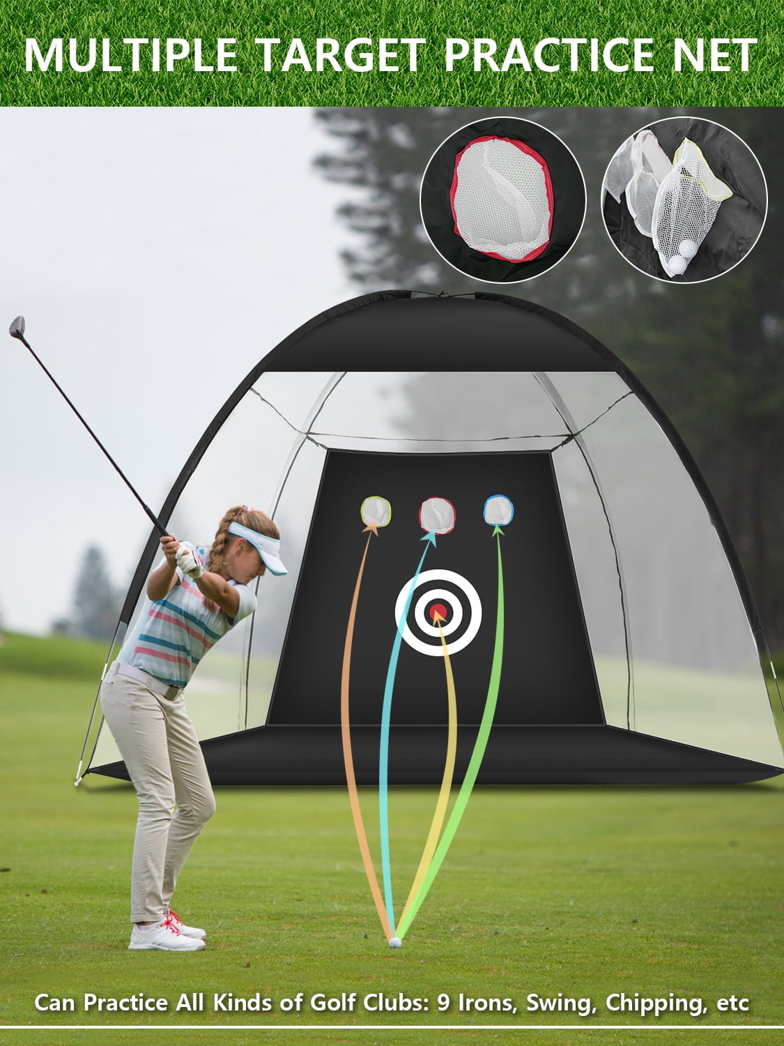 【MULTIPLE TARGET PRACTICE NET】This golf net can handle most drives at a distance and includes three additional targets for hitting. Whether you’re a beginner or advanced player, the big target is suitable for practicing basic skills, while the smaller targets enhance precision and accuracy. Practice chipping, driving, and swings safely in your backyard, indoor, or outdoor.
