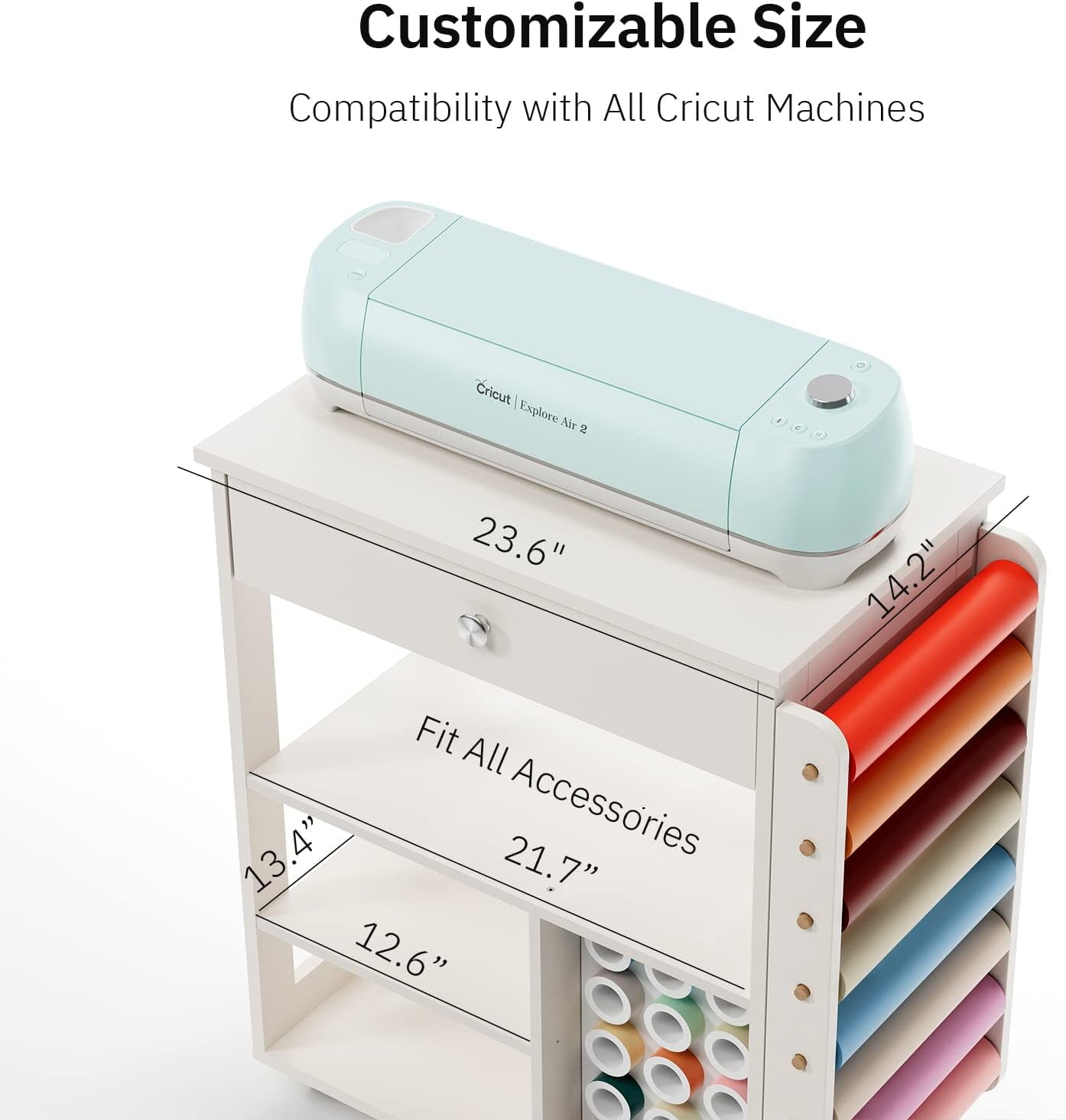 Description: Mobile Craft Workstation: This cart is a perfect rolling craft station to keep everything within reach! It rolls on four universal wheels, two with brakes, easy to move back and forth between rooms or lock into place without fuss. You can easily pull it away from the wall or have it tucked away when not in use, effortlessly wheeling it to wherever you want it to be. Diverse Storage Spaces: Set up your machine on the top shelf, and organize tools and supplies in the drawer, with the middle shelf sitting for spare machines and the bottom two shelves for vinyl sheets or cardstock papers. The lower vinyl roll holder and side hanging vinyl roll organizer hold up to 23 vinyl rolls. The other side with a hook provides extra hanging space for cutting mats. Solid Construction: The whole is made of premium MDF, and the lower vinyl roll storage rack is made of durable acrylic, with a water-resistant treated surface, easy to clean and maintain. The well-built structure and high-quality materials ensure a high load-bearing capacity of up to 110 lbs, and it moves firmly without wobbling even when fully loaded. Assembly required. Dimensions & Compatibility: Overall dimensions – L 23.6″ x D14.2″ x H 29.5″, the middle shelf – L 21.3″ x D 13.4″ x H 9.15″, the bottom two shelves – L 12.6″ x D 13.4″ x H 5.9″, the vinyl rack hole diameter – 1.97″. The top and middle shelves are compatible with all Cricut machines like Cricut Maker, Cricut Maker 3, Cricut Explore Air 2, Cricut Explore 3, Cricut Joy, Cricut EasyPress Mini, Cricut EasyPress 2, etc. Versatile Usage: Not only for craft machines but also works for sewing machines or printers. You can sort all craft projects in separate compartments and free up counter space, keeping your craft room tidy and clean, perfect space solution for crafters, craft lovers, crafter beginners, and sewers with lots of supplies to store, and great gifts for their/him, families, friends during birthday, holiday, wedding, anniversary.