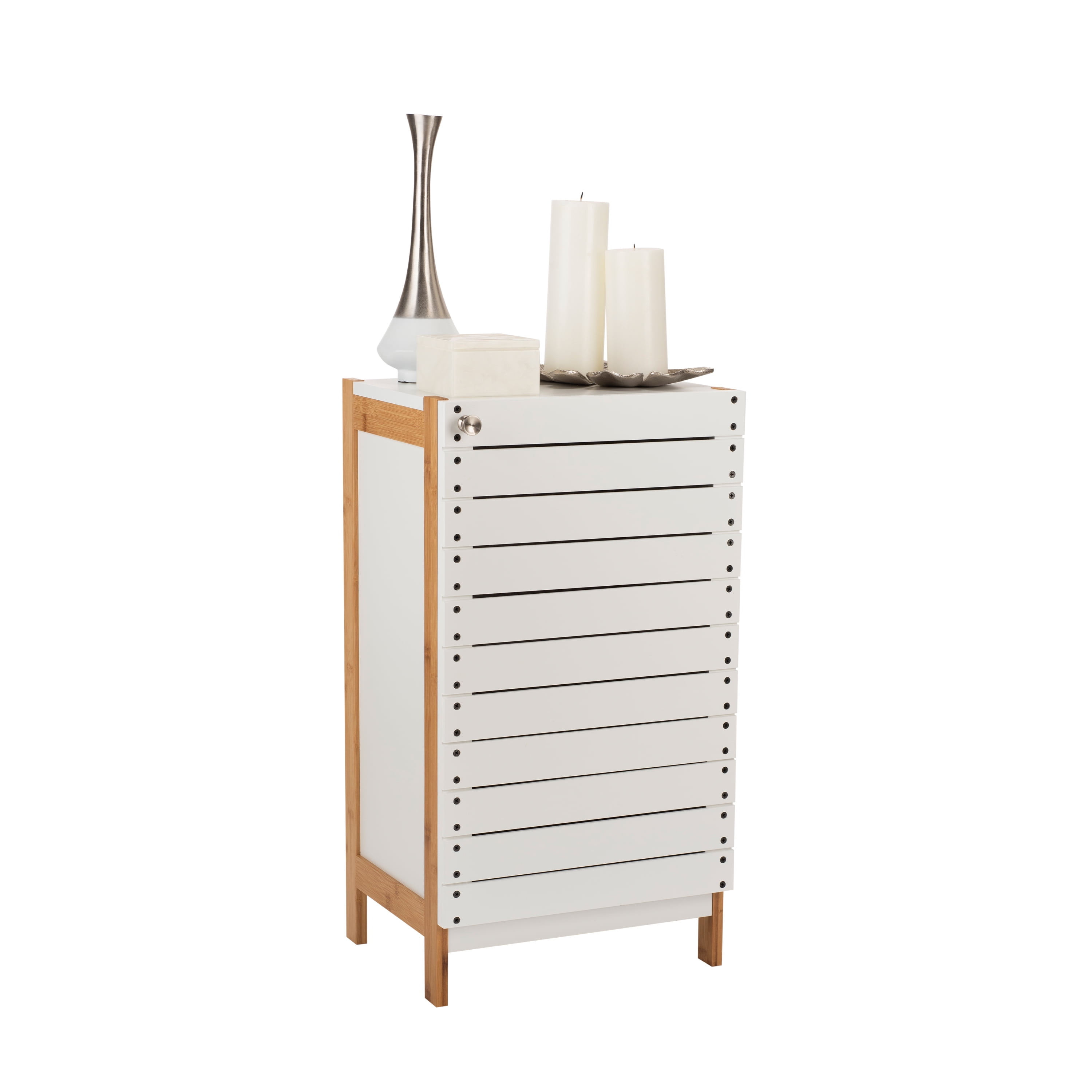 Add this stylish Organize It All Floor Cabinet to any room for concealed storage space. With 2 shelves inside this cabinet can hold many essential items. Put in your bathroom to store towels and toiletries or put in the kids room to store toys. The bamboo frame and the white cabinet door are very modern and will look great in your space.
