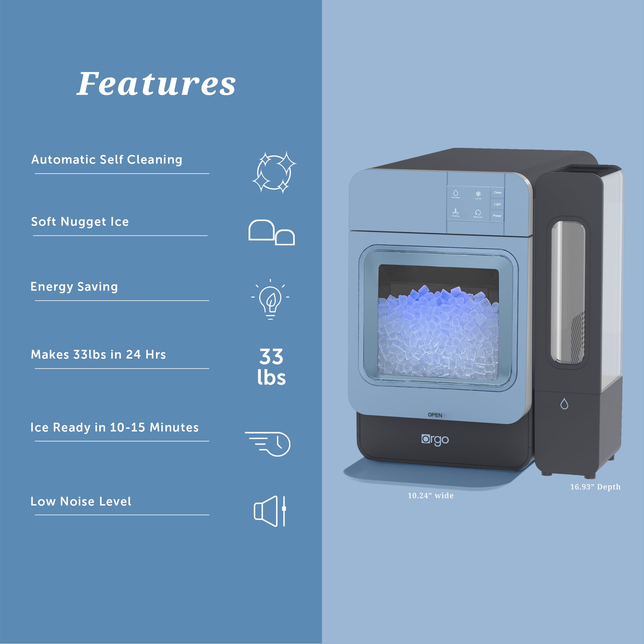 Dimensions – 16.93 in Long, 16.73 in Depth, 10.24 in High Water Tank Capacity: .74 Gal Capacity: 33 lbs in 24 hours Noise Level: 40 dba(A) Control Panel: Soft touch Gross Weight, 40.80 lbs, Net Weight, 43.0 lbs Power: 210-watts Ice Shape: Nugget Ice Basket Capacity: 3.31 lbs Material: Stainless Steel & ABS Ice per Cycle: Continuous 100ml / 10 minutes New Orgo Products Please note that countertop ice makers are designed to make ice, and not store it. For optimal results, please store ice in freezer as soon as the basket is full.