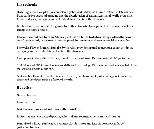 An ultra-gentle cleanser for ultra-beautiful color. Extend the bright, happy life of your dye with high-tech ingredients that target damaged areas for intense moisture treatment and protect your hue from the elements. How to Use: Lather, indulge, rinse. Benefits: – Gentle cleanser that preserves color. – Fortifies over-processed and chemically-treated hair. – Protects against the color-depleting effects of environmental pollutants and the sun. Ingredients – Oribe Signature Complex (Watermelon, Lychee and Edelweiss Flower Extracts) Defends hair from oxidative stress, photoaging and the deterioration of natural keratin, all while protecting from the drying, damaging and color-depleting effects of the elements. – Bioflavonoids, responsible for giving fruits their fantastic hues, protect hair’s own color from fading and discoloration. – Baobab Tree Extract, from an African plant known for its hydration storage, offers the same benefit to parched, color-treated tresses, providing superior moisture to the driest areas first. – Edelweiss Flower Extract, from the Swiss Alps, provides natural protection against the drying, damaging and color-depleting effects of the elements. – Kaempferia Galanga Root Extract, found in Southeast Asia, Delivers natural UV protection. – Multi-Layered UV Protection System delivers long-lasting UV protection and protects hair from the harmful effects of the sun. – Watermelon Extract, from the Kalahari Desert, provides natural protection against oxidative stress and the deterioration of natural keratin. – Formulated without parabens or sodium chloride. Color and keratin treatment safe. UV protection for hair.