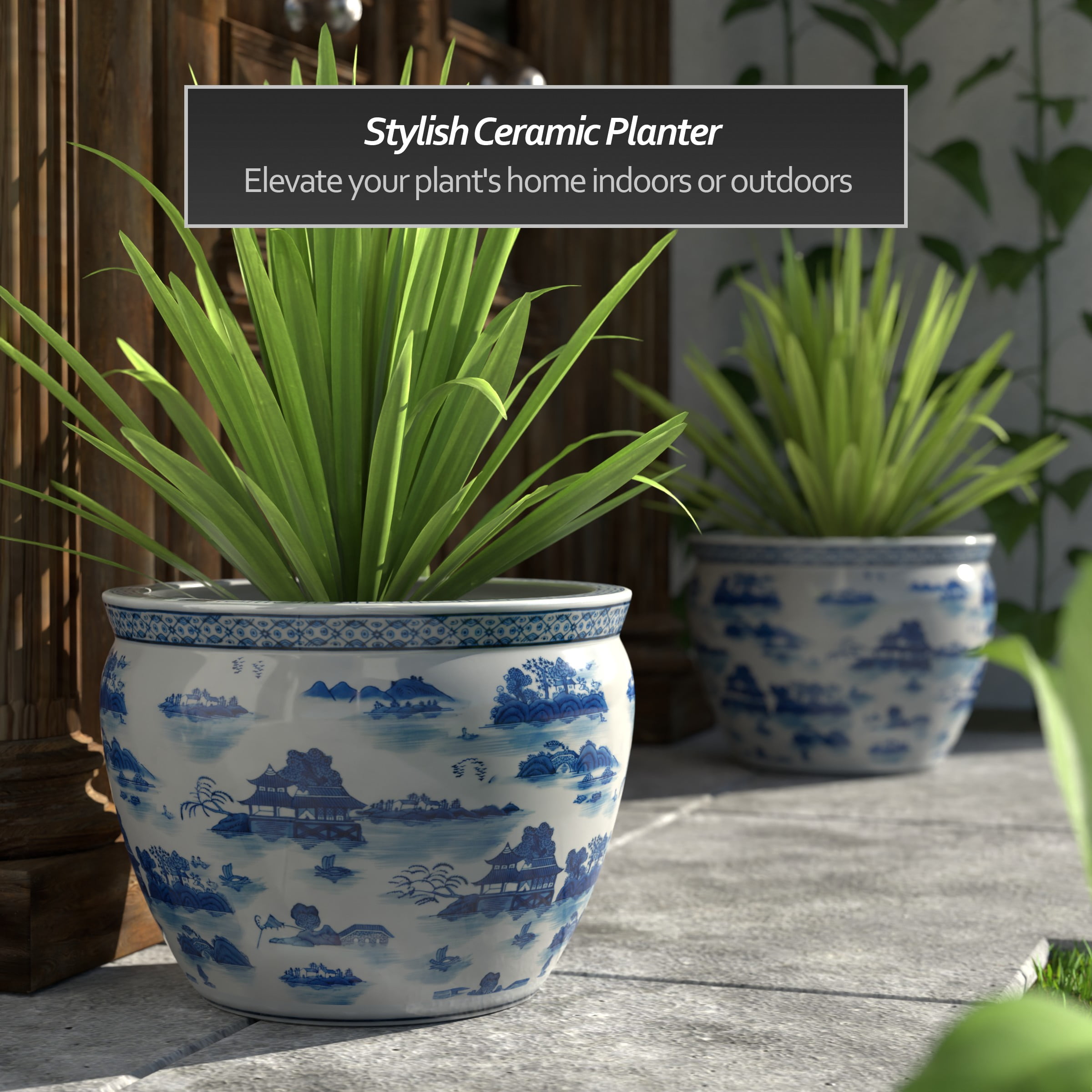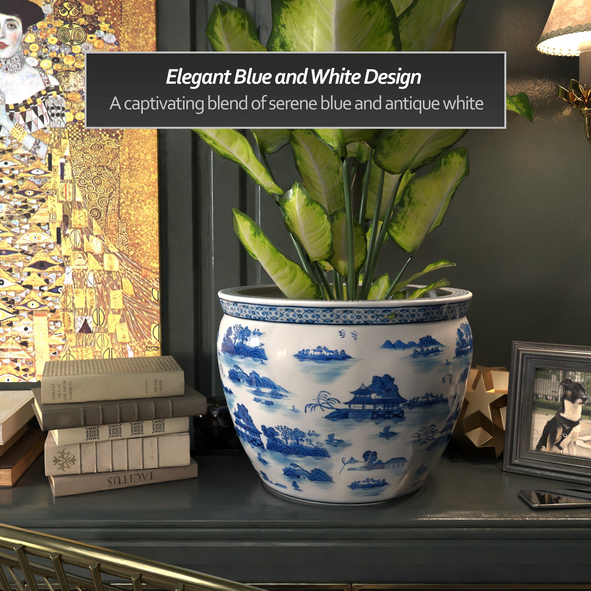Red Lantern Large 18″ Blue & White Landscape Porcelain Fishbowl Planter