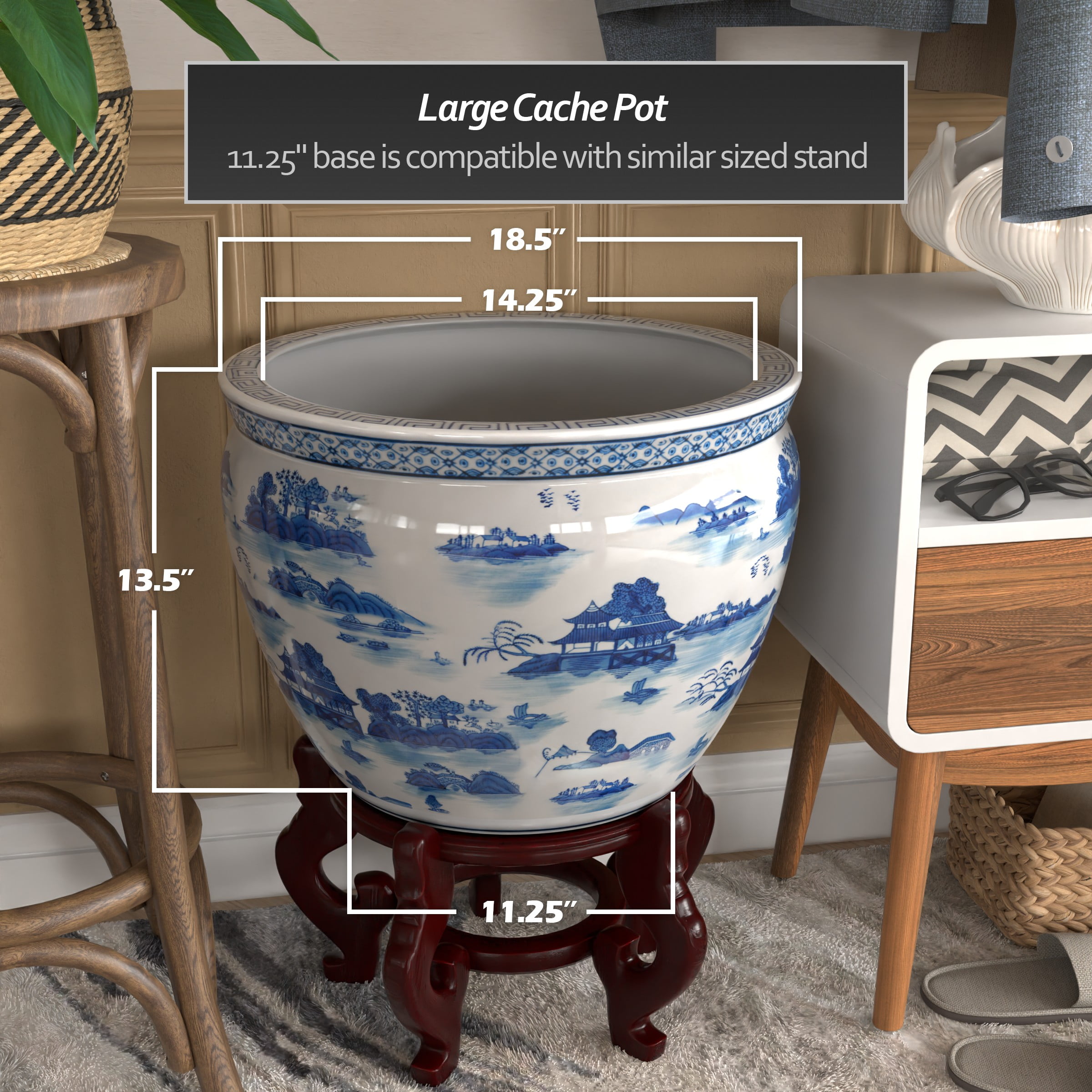 18″ Porcelain Fishbowl Blue and White Landscape: 19th century Chinese export porcelain design Note: no hole in the bottom; live plants must be potted and removed for watering Stand is not included Color: blue and white Material: porcelain