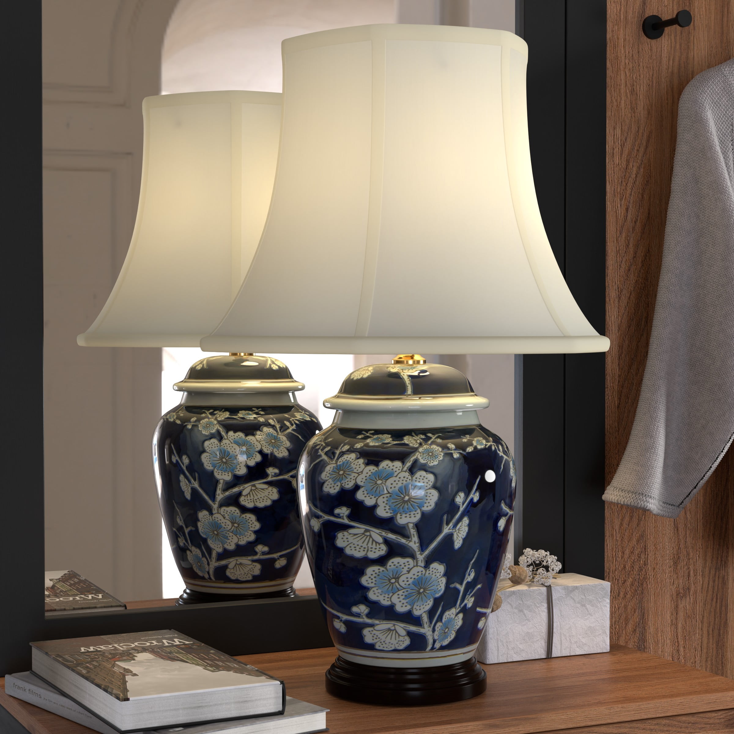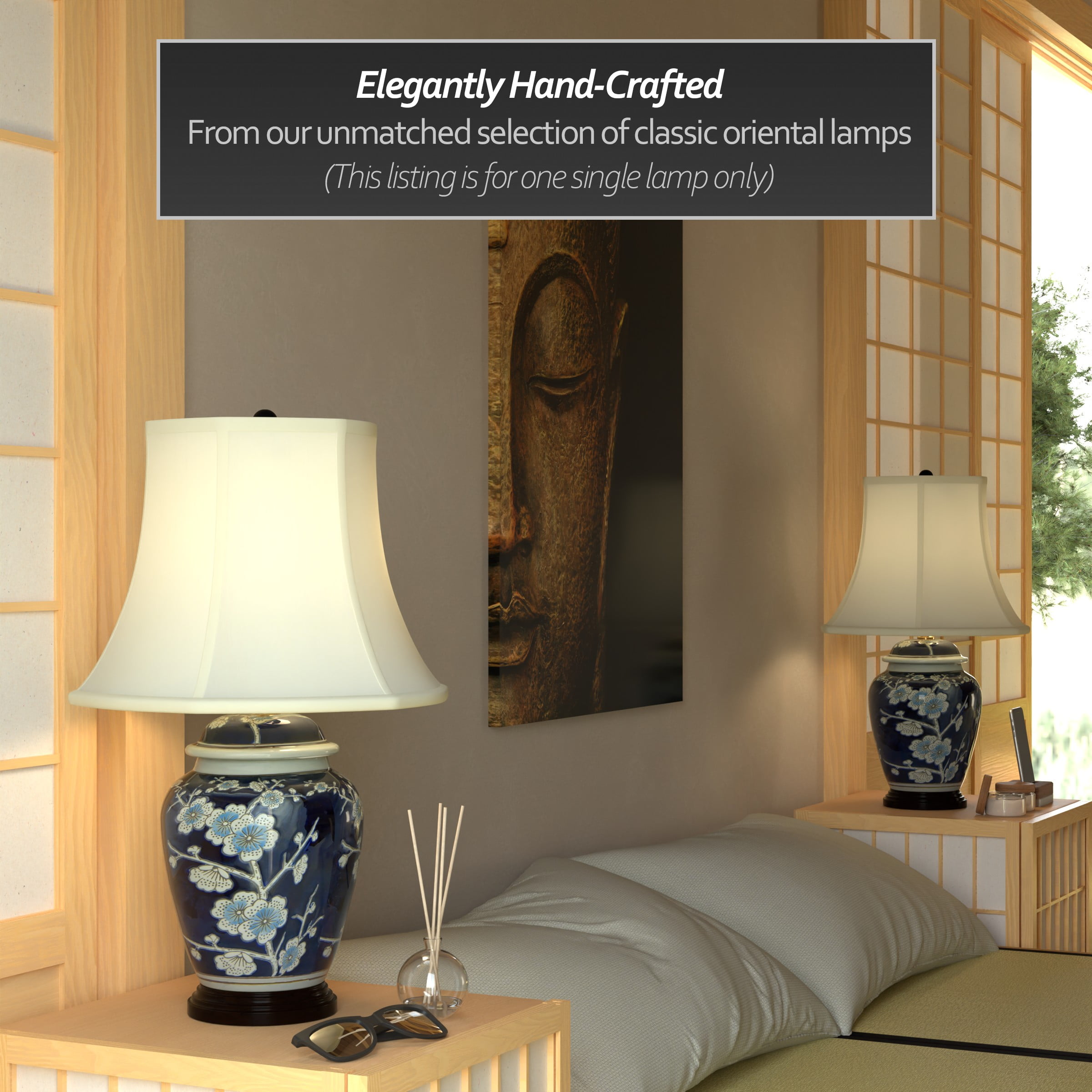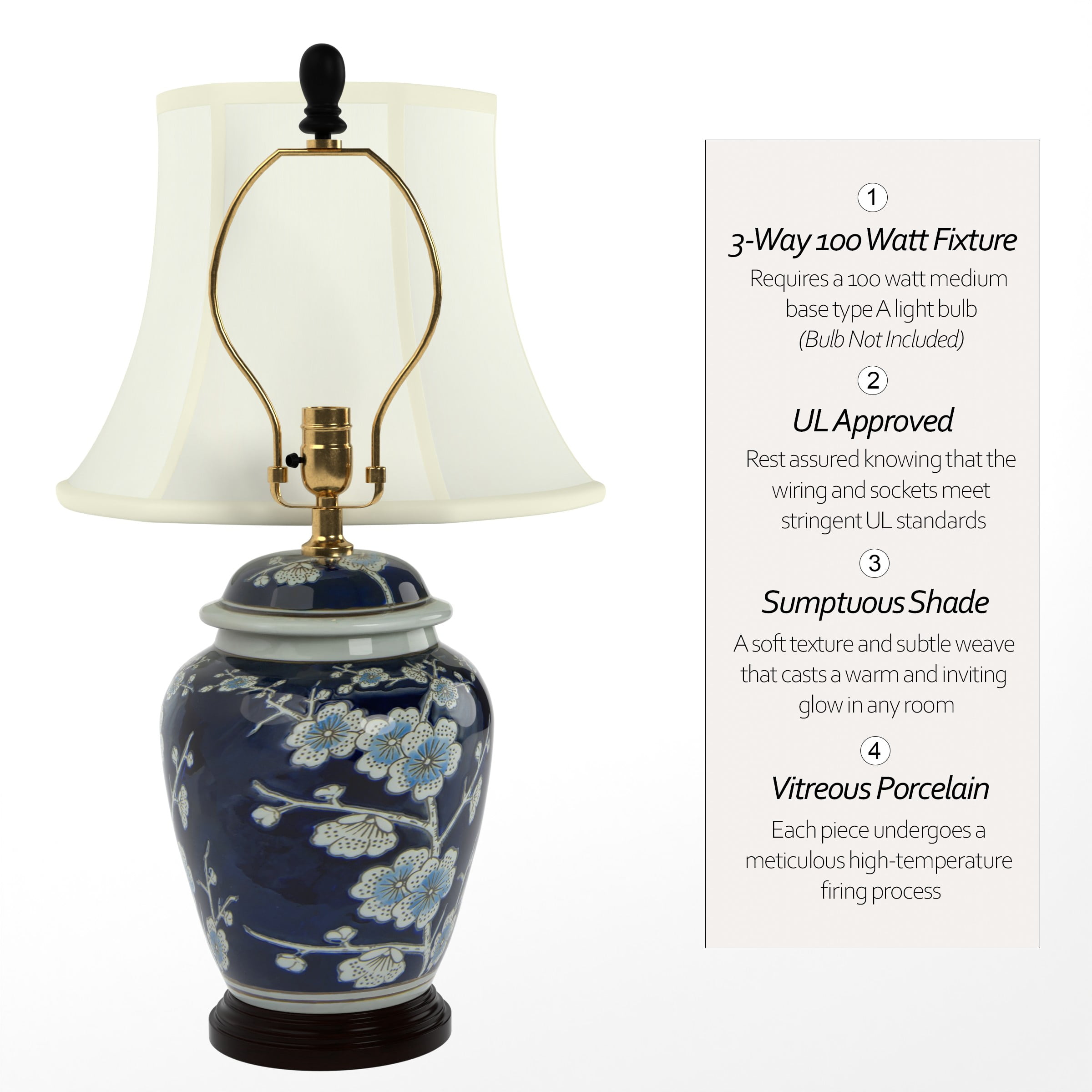 22″ Blue Cherry Blossom Lamp: Japanese inspired design with regal blue glaze Includes built in wooden base and a fabric shade Uses a 60W medium bulb (not included) Color: blue Material: porcelain, fabric