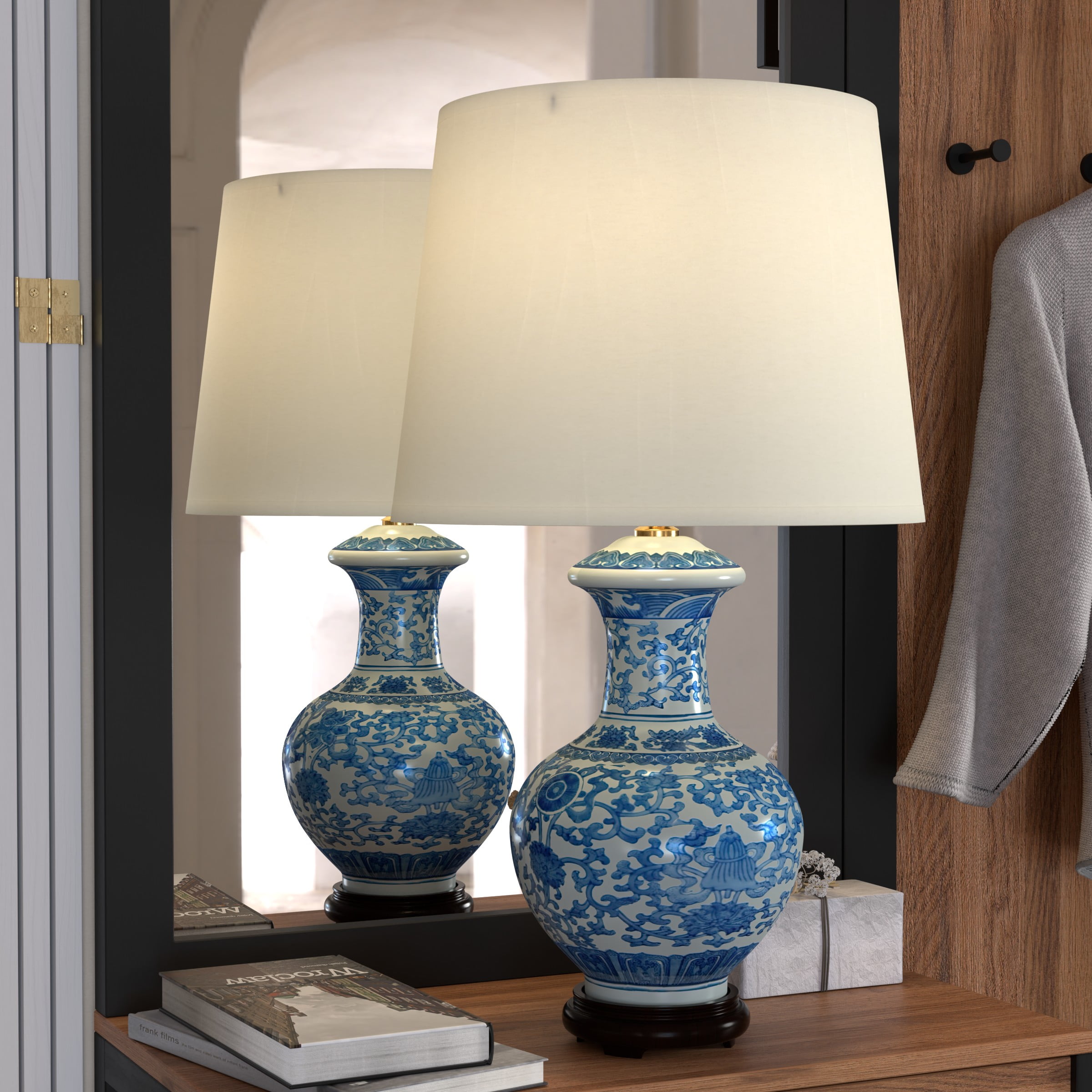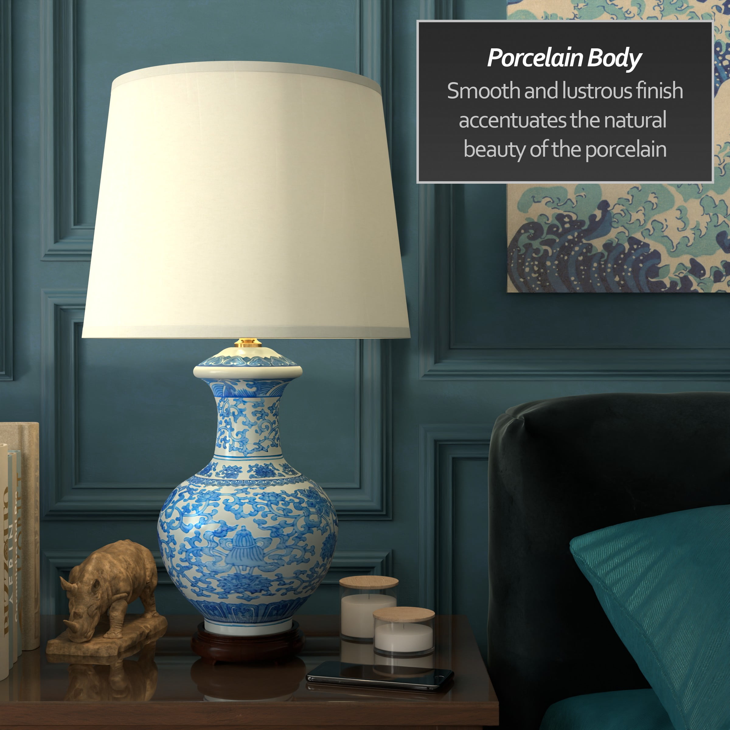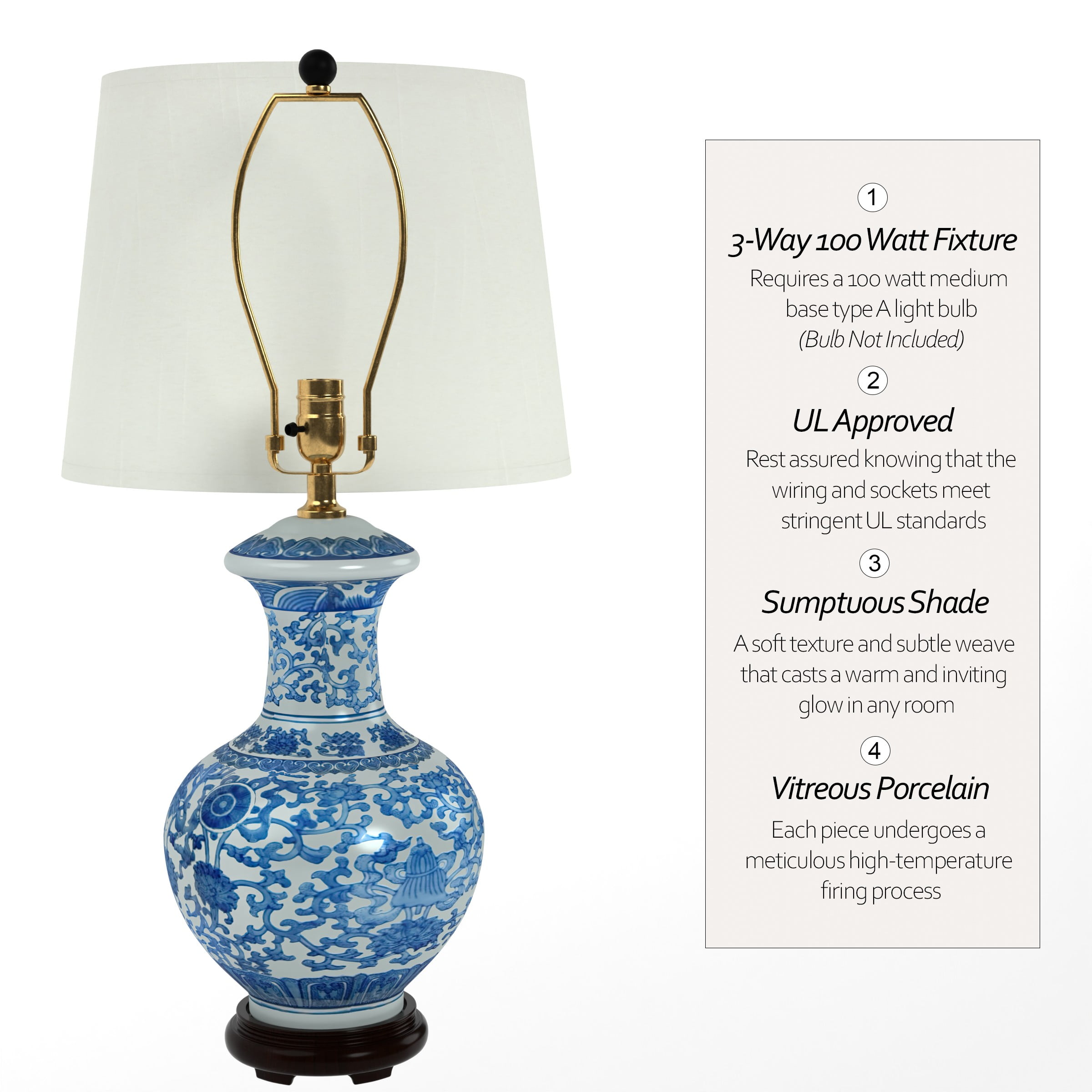 24.5″ Blue and White Porcelain Round Vase Lamp: Classic Ming blue and white oriental lamp UL approved wiring, socket and switch High temperature fine Chinese porcelain Color: blue and white Material: porcelain, fabric