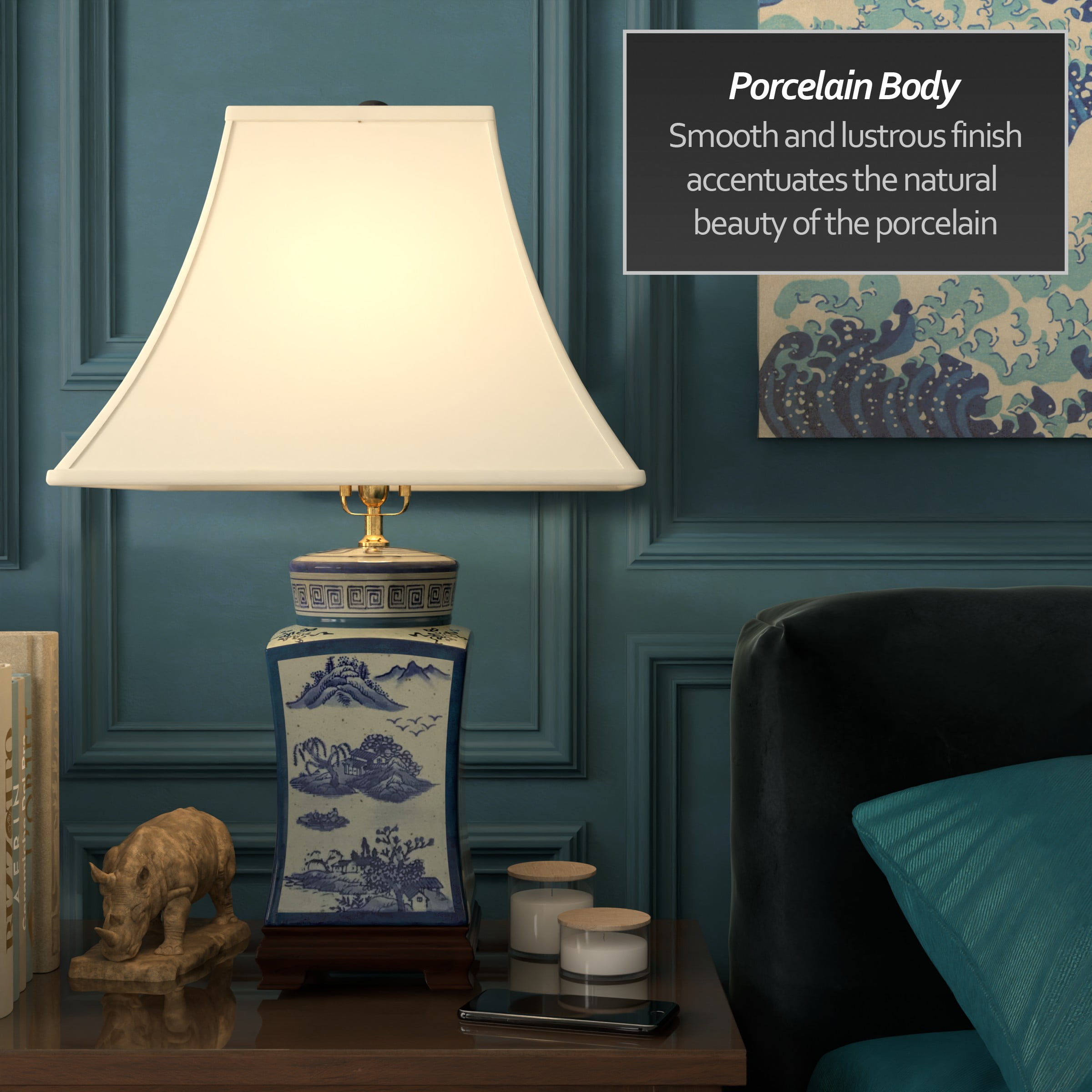 25″ Blue and White Chinese Calligraphy Porcelain Lamp: Hand crafted porcelain lamp Accentuates hand painted Chinese characters Includes a fabric shade and built in wooden base Color: black and gray Material: porcelain, fabric