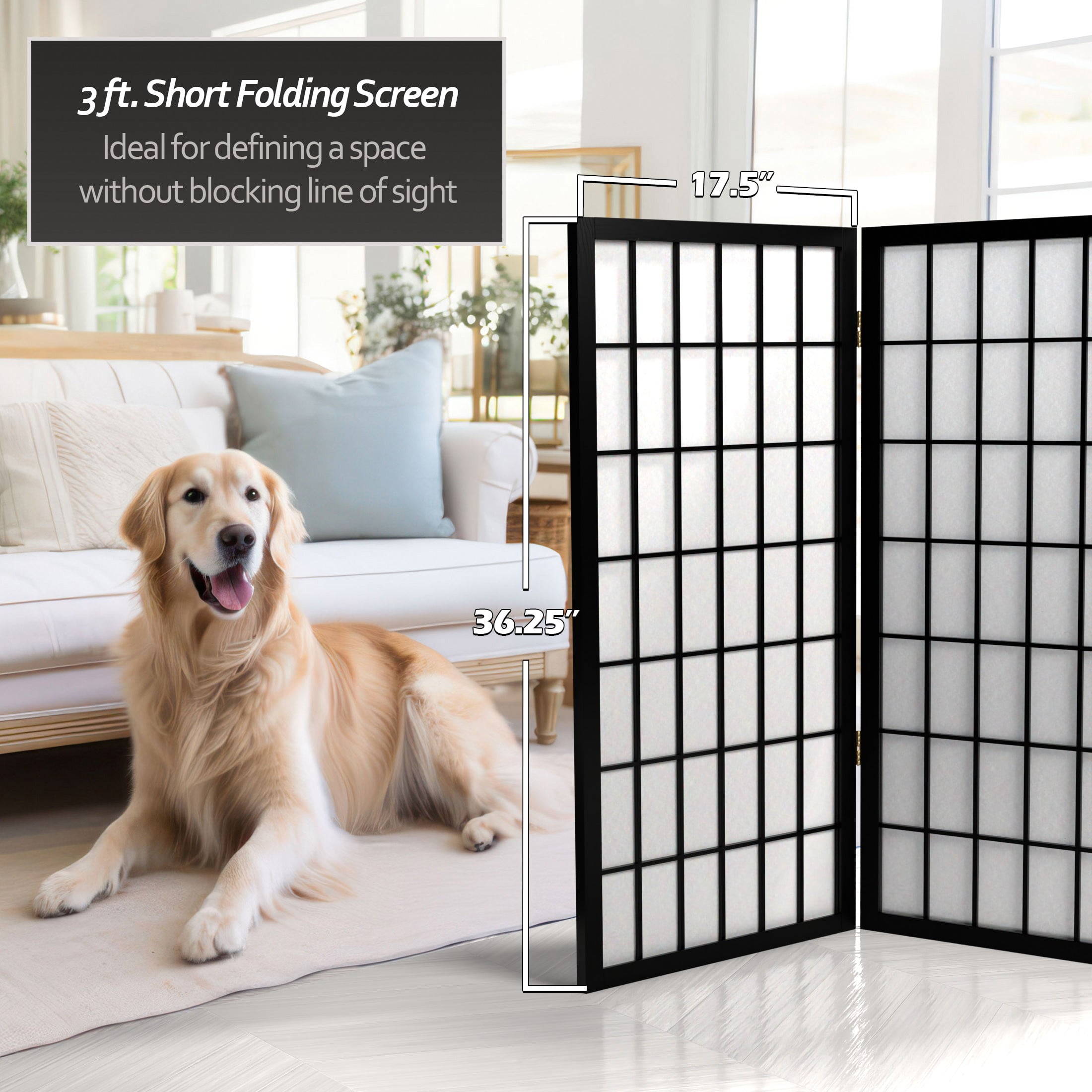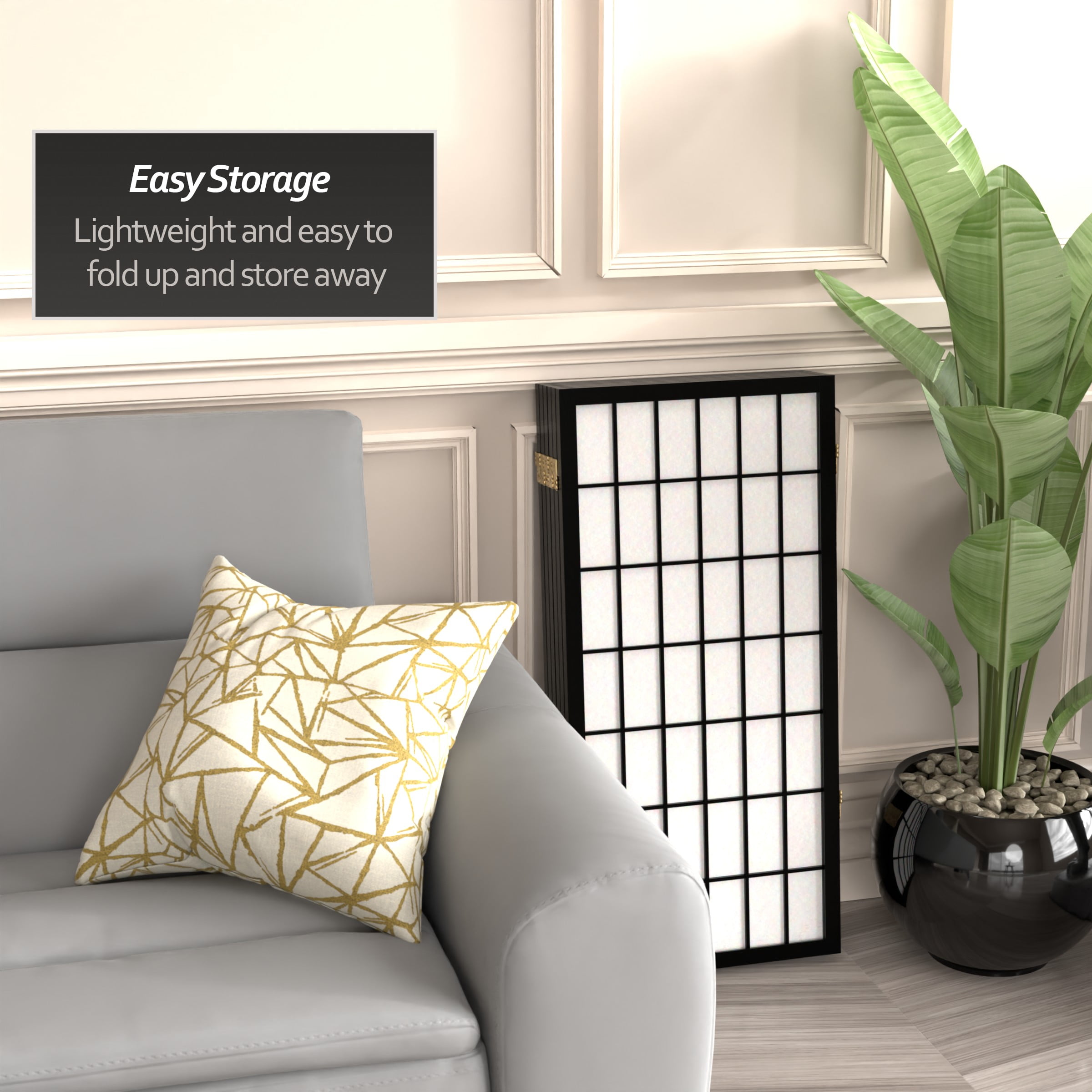 3′ Tall Window Pane Shoji Screen: Shoji rice paper provides privacy without blocking light Scandinavian spruce frame is lightweight and portable Lacquered brass hinges fold panels in either direction Color: white Material: rice paper