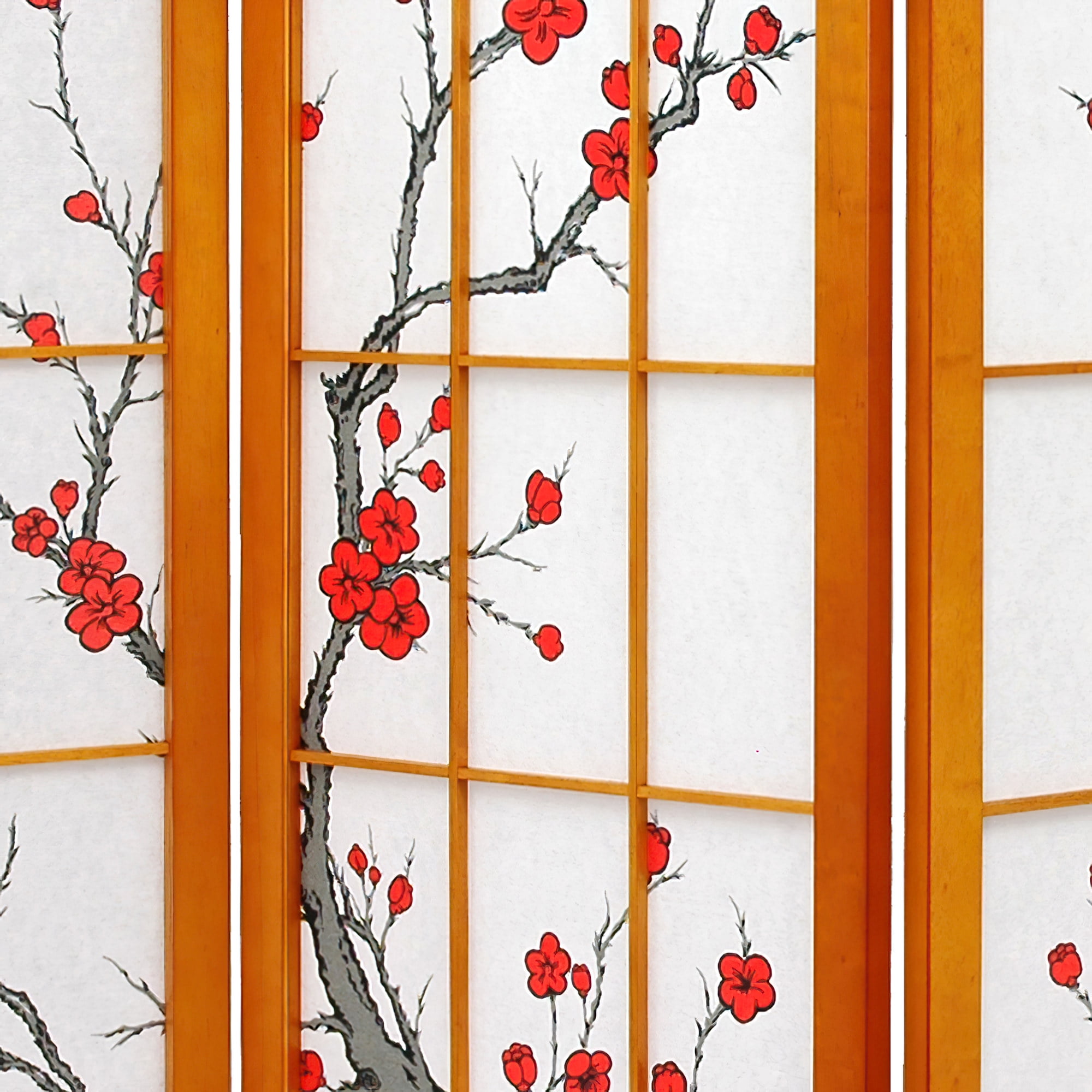 4′ Tall Cherry Blossom Shoji Screen: Shoji rice paper provides privacy without blocking light Cherry blossom print and wooden lattice on front Brass hinges can fold panels in either direction Color: rosewood Material: rice paper