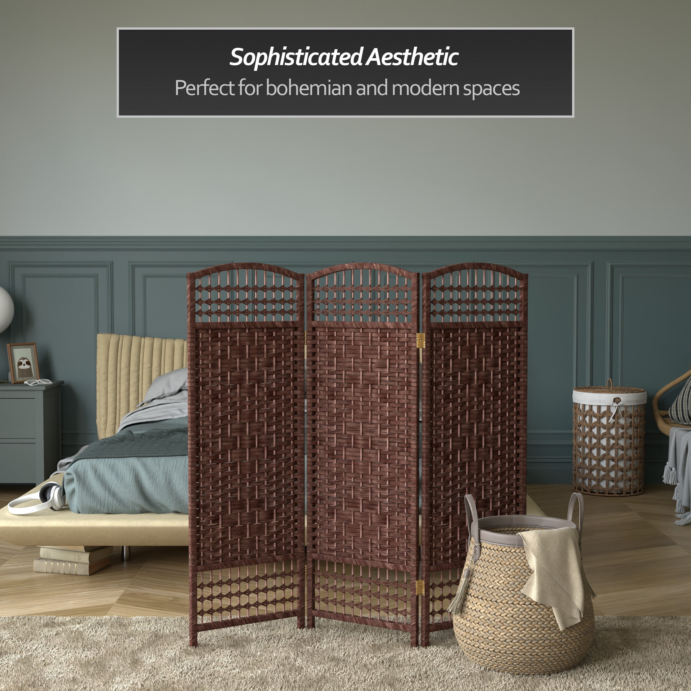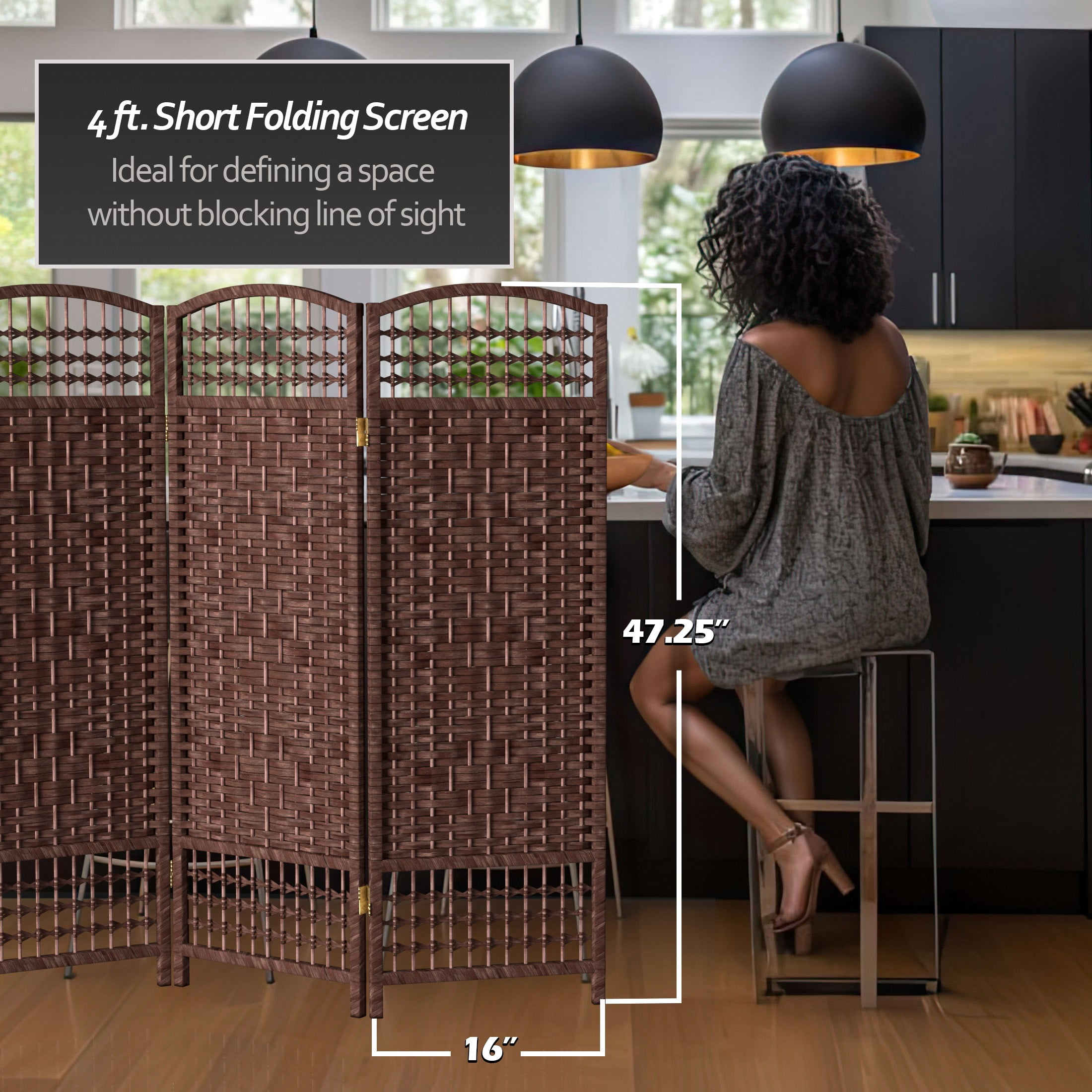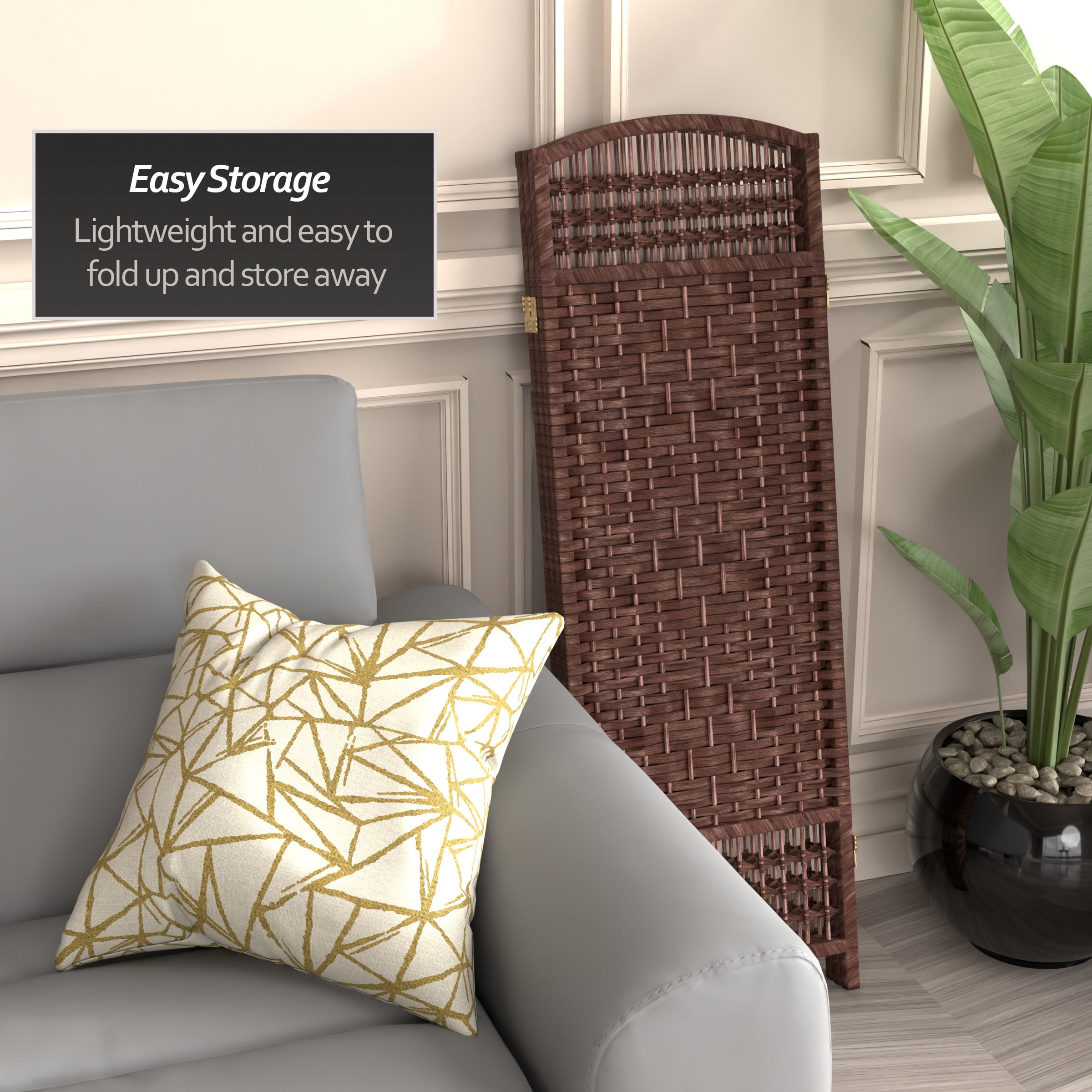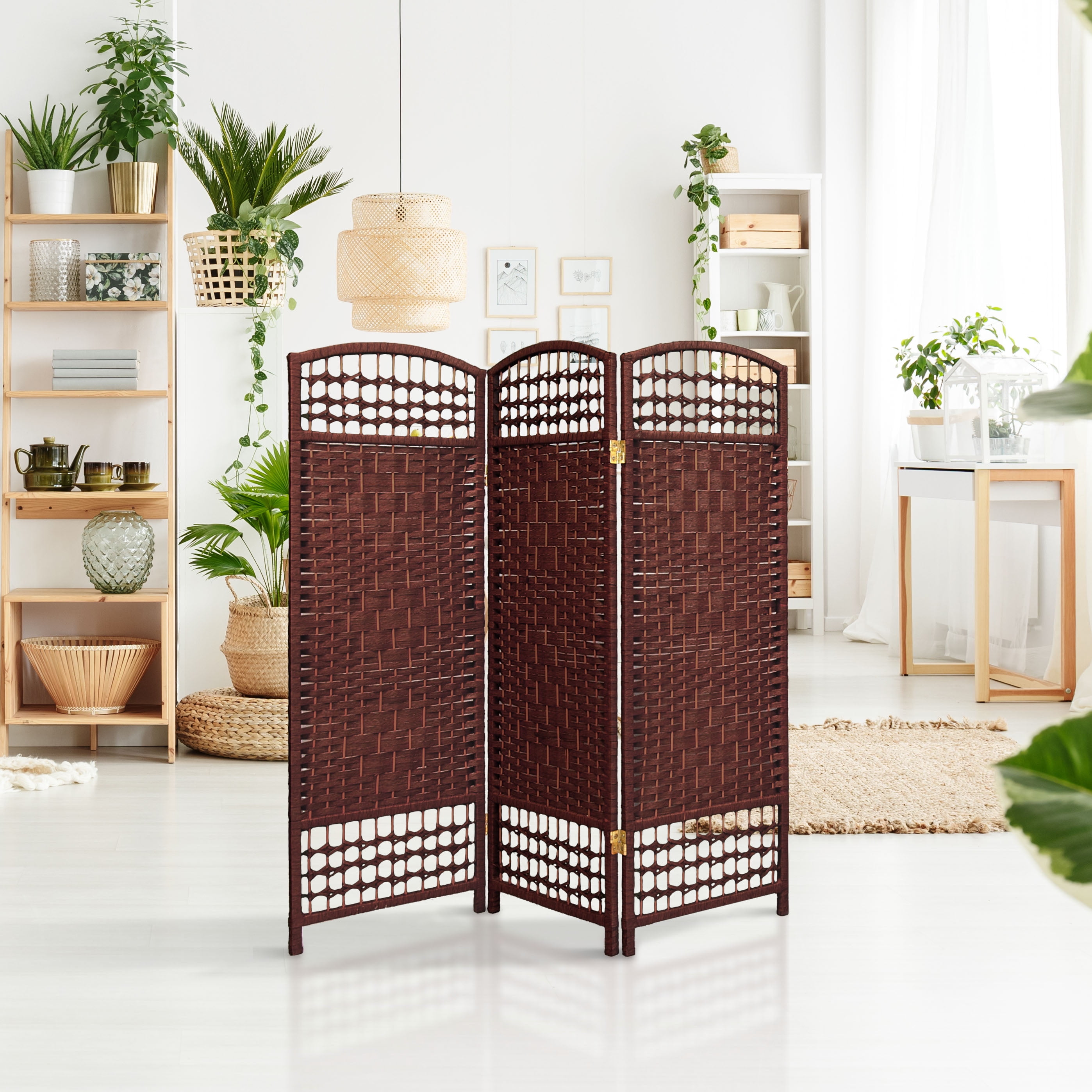 4′ Tall Fiber Weave Room Divider: Kiln dried wood frames woven with spun plant fiber cord 2-way hinges fold panels in either direction Ships fully assembled Color: white Material: natural fiber