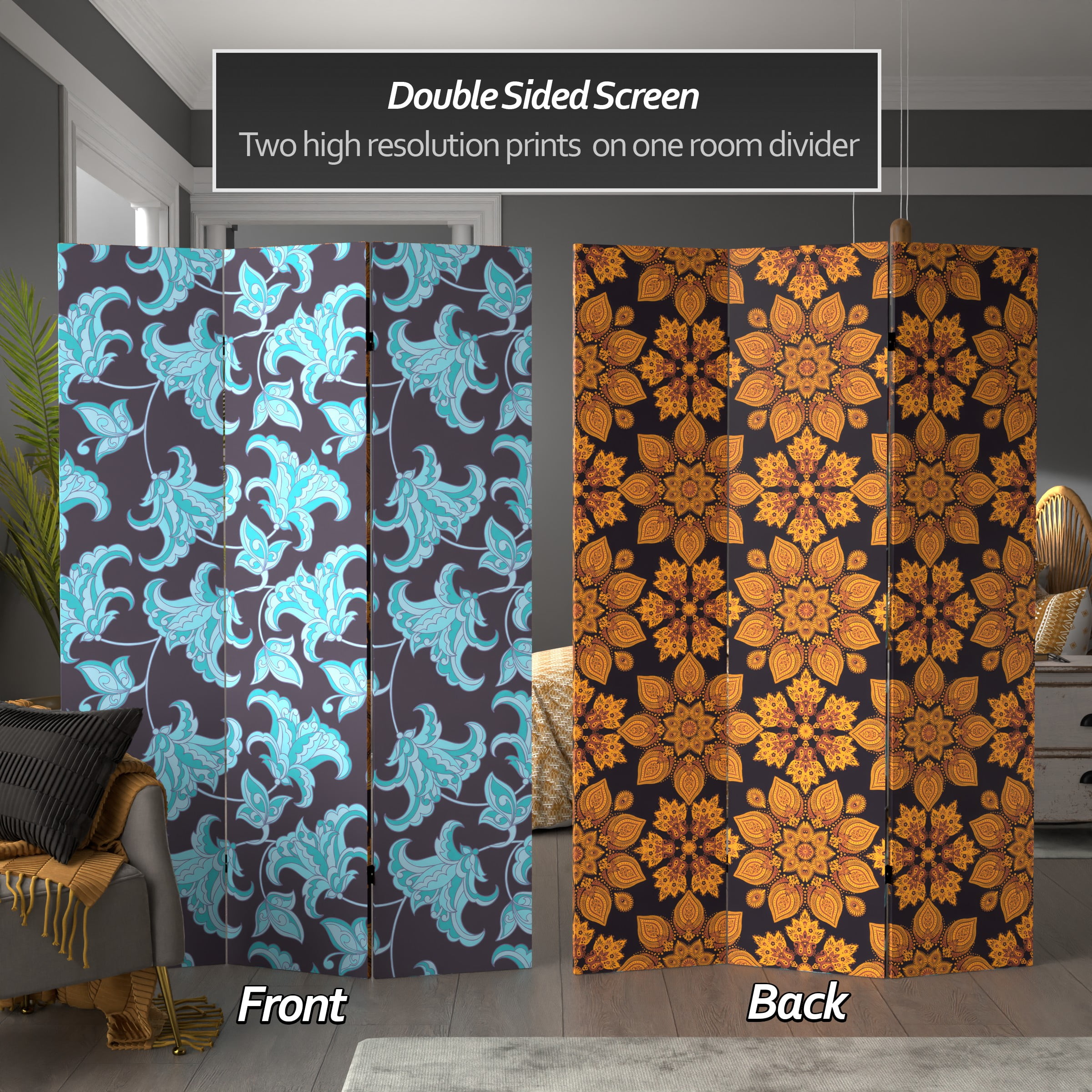 This lovely room divider is inspired by the arabesque form of artistic design which is characterized by rhythmic linear patterns of scrolling, foliage and tendrils. The bright orange hued design is more traditional of Islamic art, while the blue green foliage design is a more modern take. Either one provides a beautiful decorative backdrop for home or office.