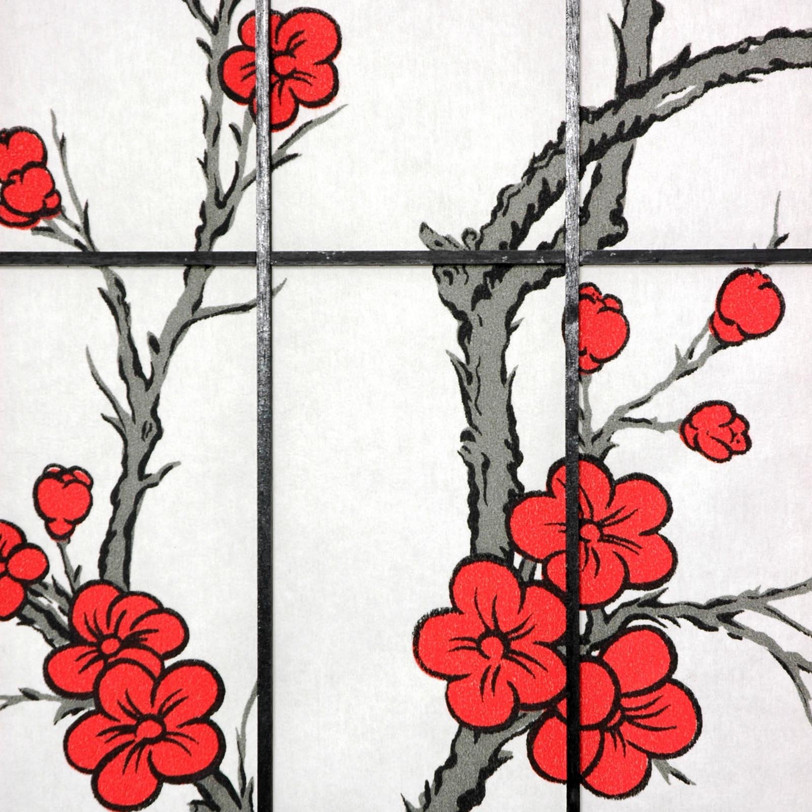6′ Tall Cherry Blossom Shoji Screen, Black, 3 Panels: Shoji rice paper provides privacy without blocking light Traditional spruce frame available in a rich black finish Cherry blossom print and wooden lattice on front Color: black Material: rice paper