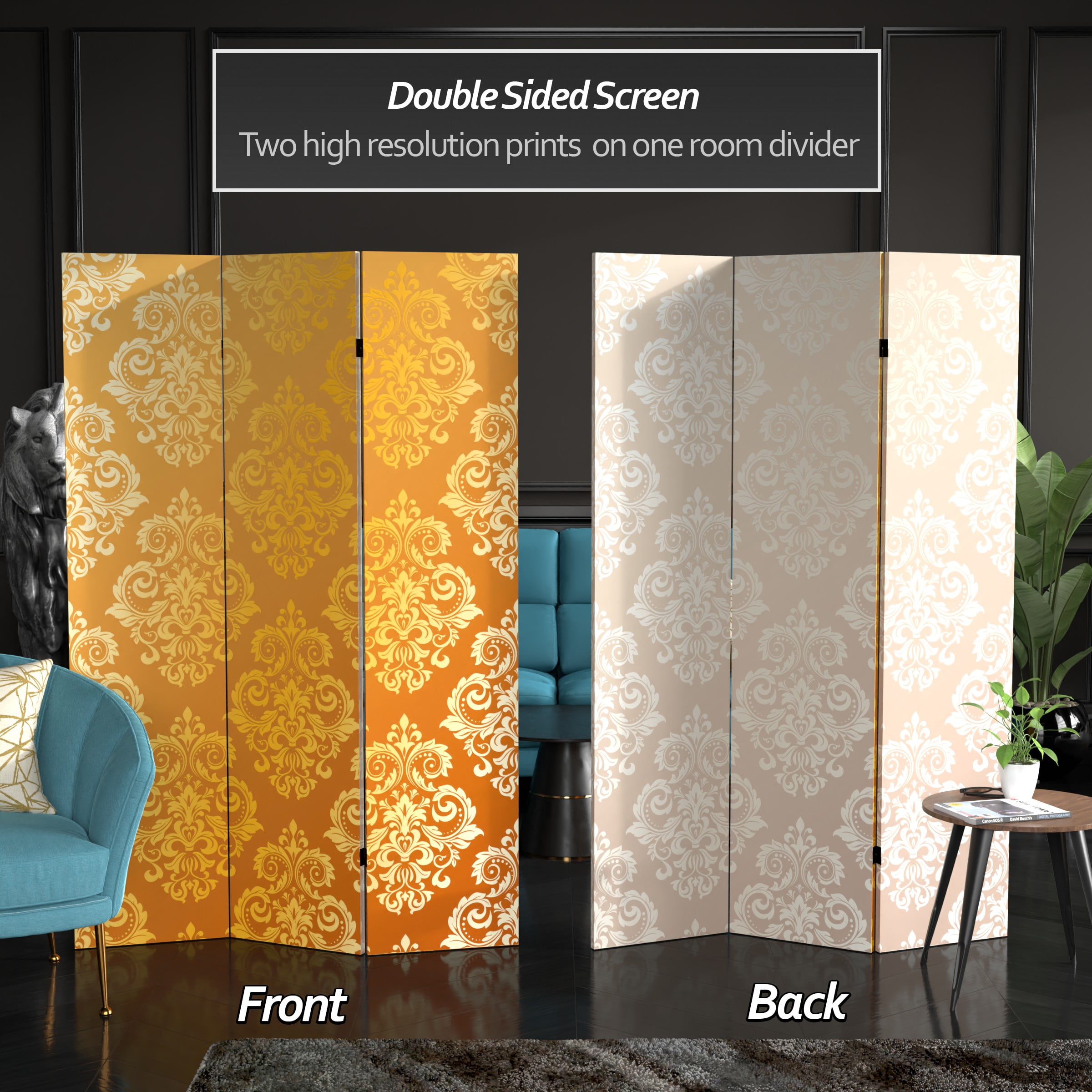 Baroque art of the 17th and 18th centuries featured intricate lines and curves and ornate patterns like the ones seen on this screen. One side features a golden color palette reminiscent of the age, while the other is a neutral shade for a more modern take. Either one is sure to bring a sophisticated element to your design.