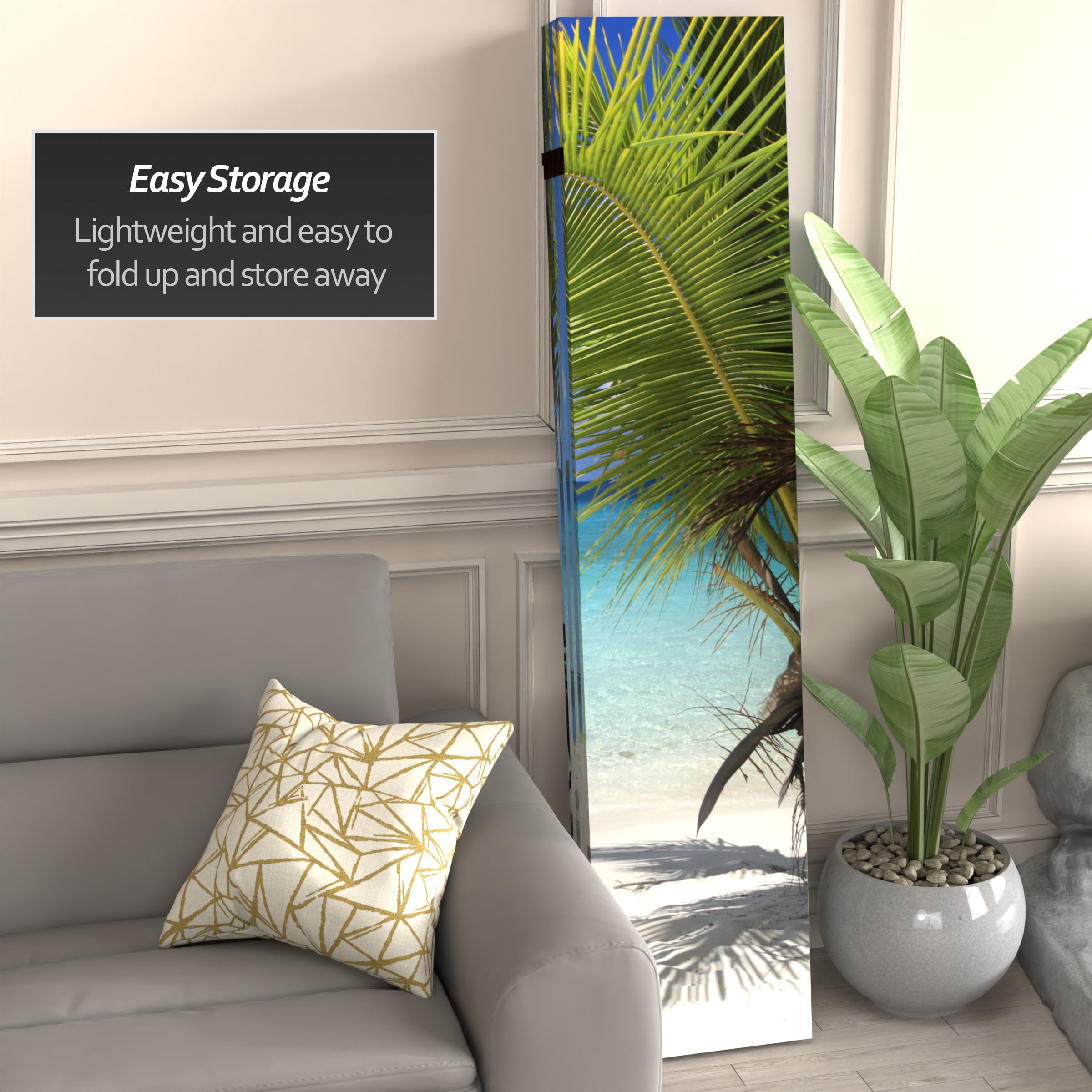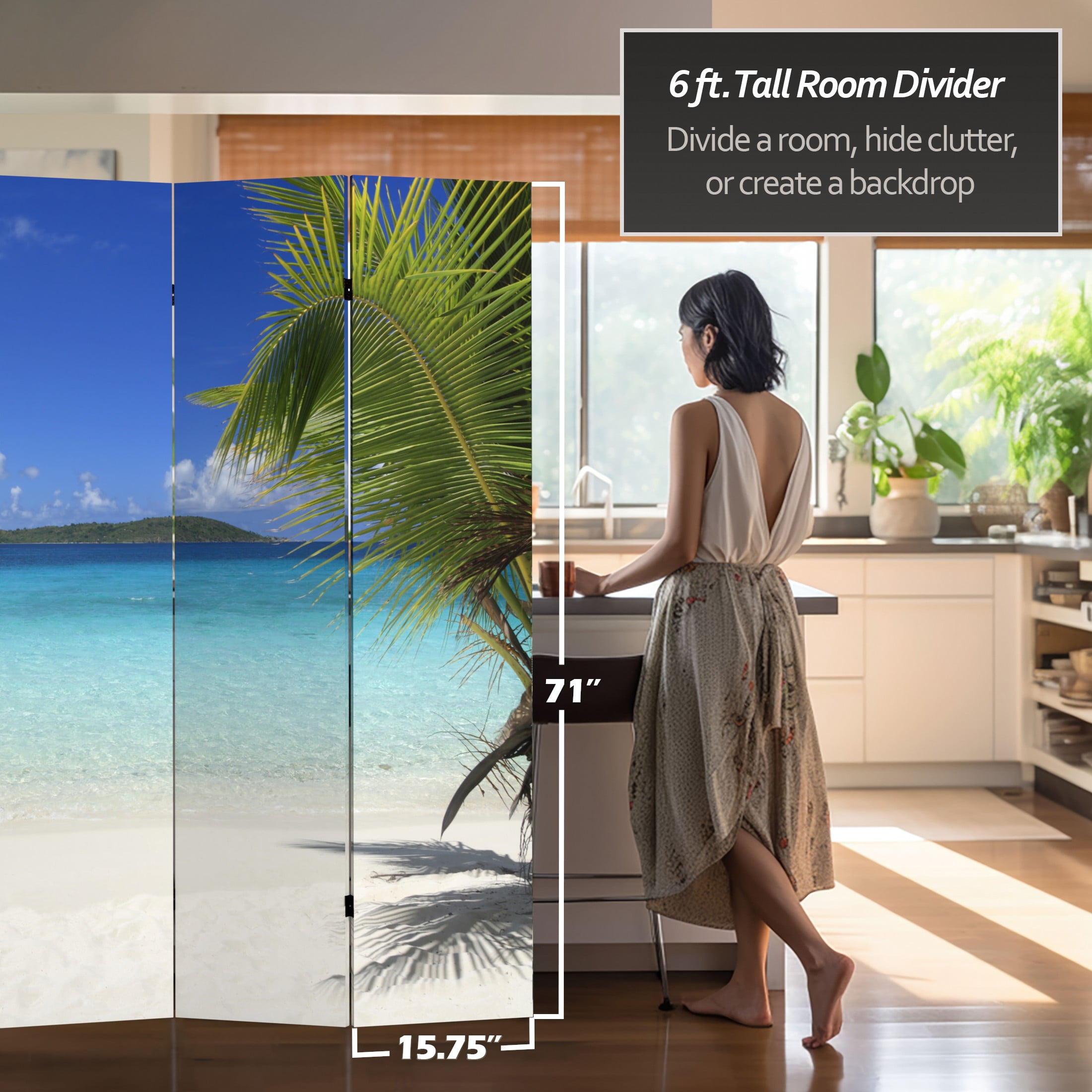 Capture a piece of paradise with these two beautiful photographic prints of idyllic tropical beaches. On the front is a photo of two vacationers relaxing in the shade of a palm tree, admiring the deep blues of the sky and the sea. On the back is a picture of a beach on the Virgin Islands that will inspire you grab your snorkel and check ticket prices to the tropics. These peaceful, beautiful images will add a serene decorative accent to your living room, bedroom, dining or kitchen. This six panel screen has different images on each side, as shown.