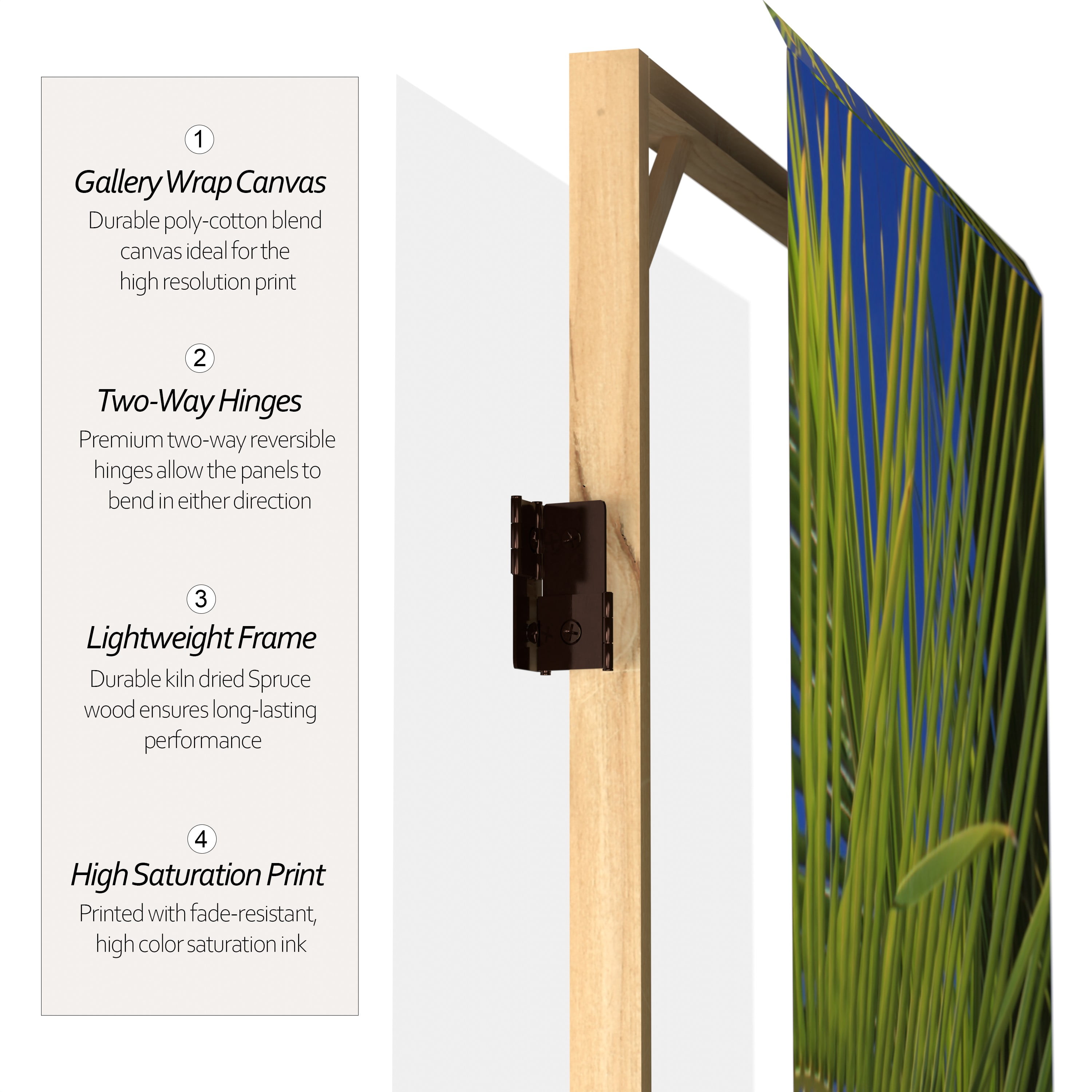 6′ Tall Double Sided Beach Canvas Room Divider 6 Panel: High quality wood and fabric covered room divider Carefully constructed reinforced wood frames of hardy, kiln dried Spruce, covered top to bottom, front and back and on the edges, with stretched poly-cotton blend canvas Printed with high saturation ink to create a beautiful, long lasting image Color: multi Material: canvas, spruce wood