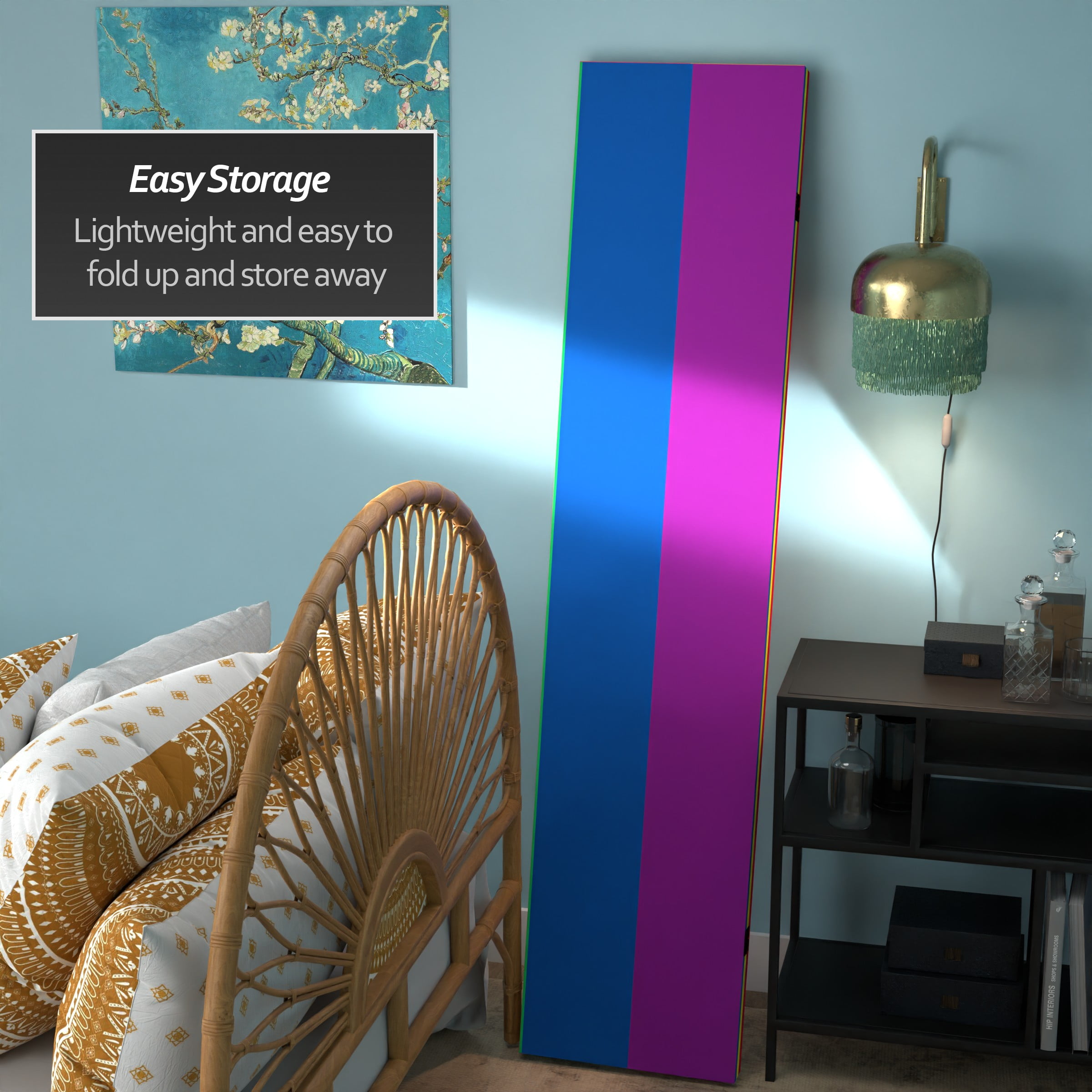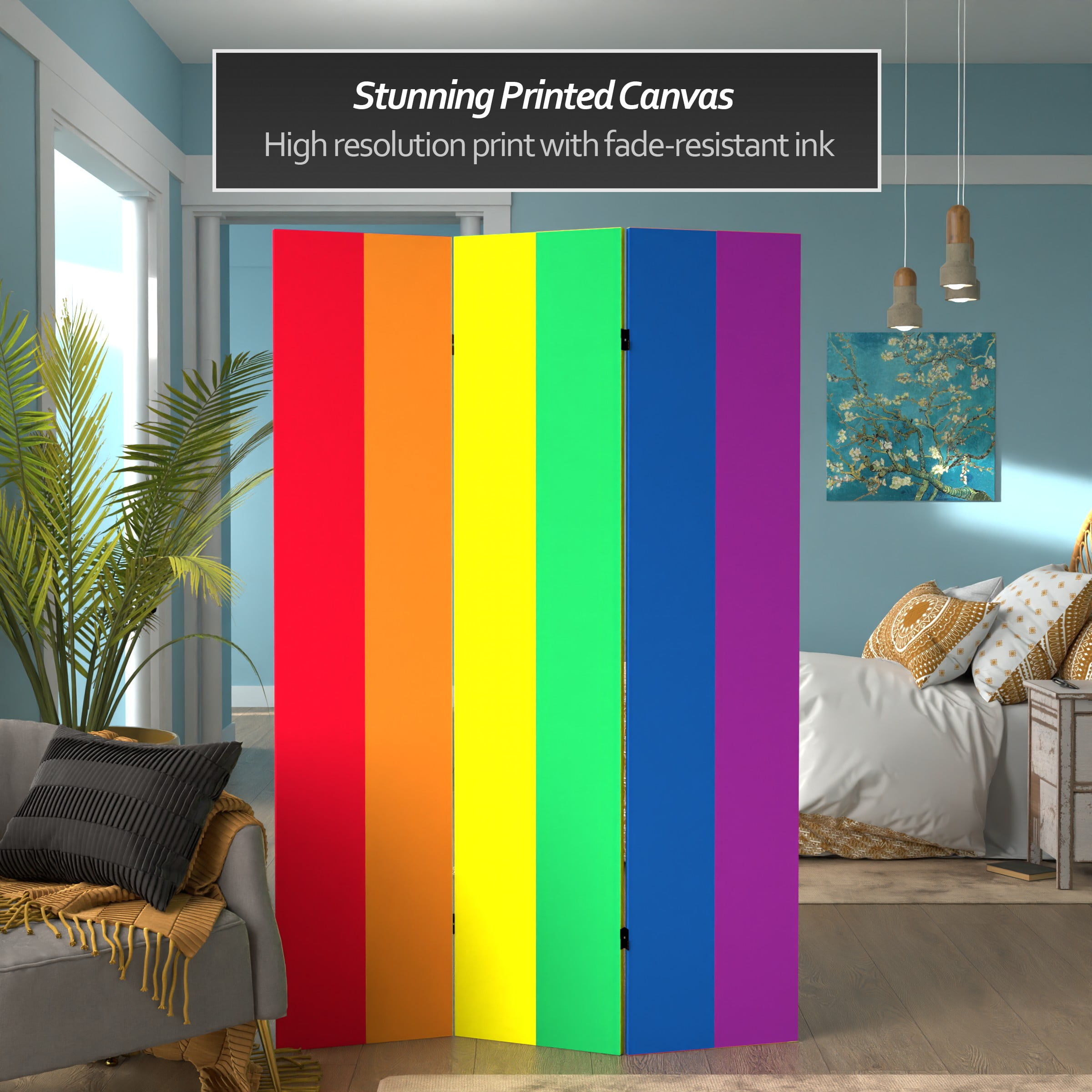 This bold, bright rainbow striped screen will add a flair to any room. It will appeal to young kids, teens and adults alike. The striped design appears on both sides of this versatile screen.