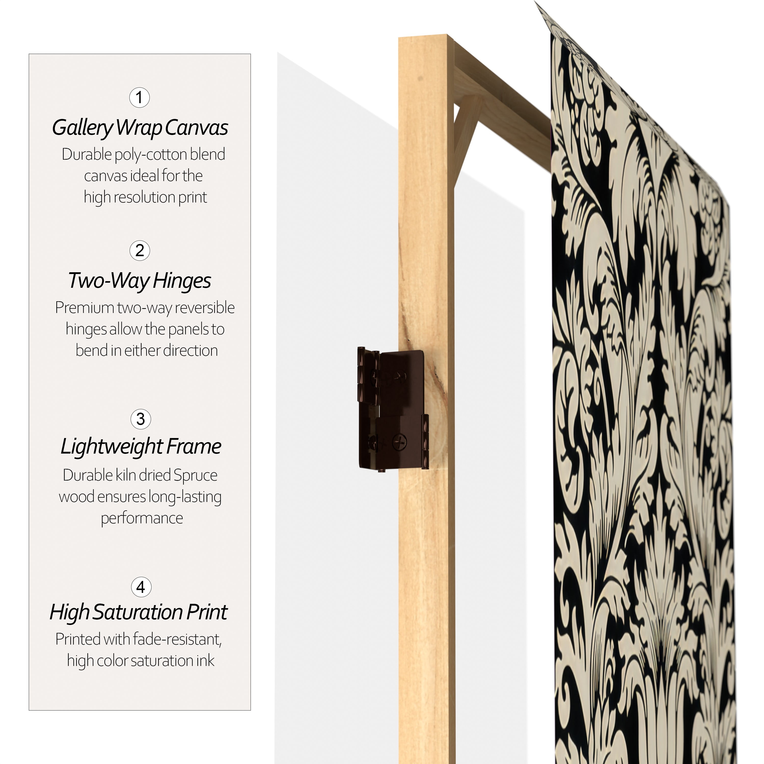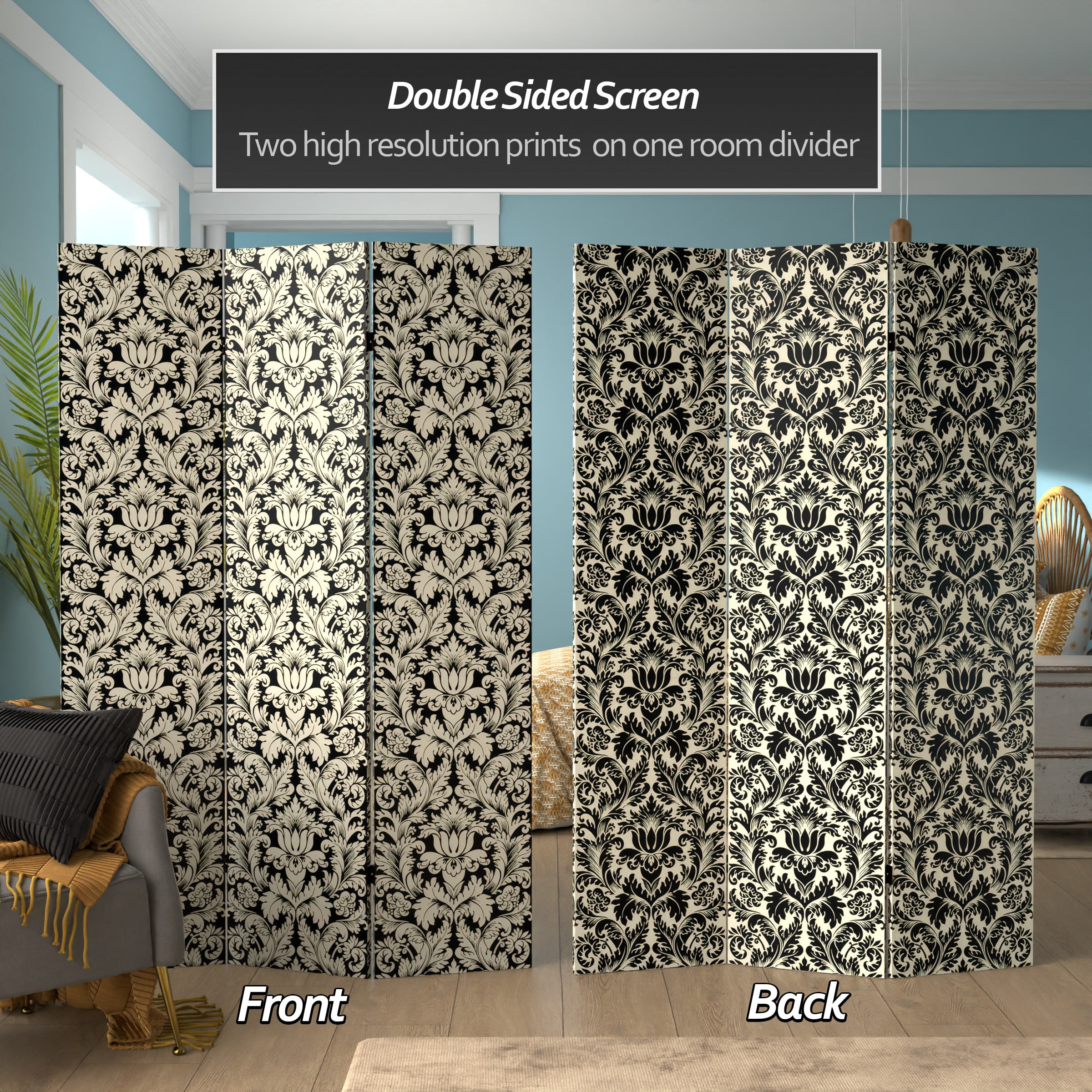 This screen boasts a beautiful high resolution print on both sides, perfect for adding a distinctive decorative accent wherever you place it. The durable canvas frame arrives fully assembled, is lightweight and easy to move when redecorating, and folds flat for stress-free storage. A fun and creative way to partition and personalize a space!