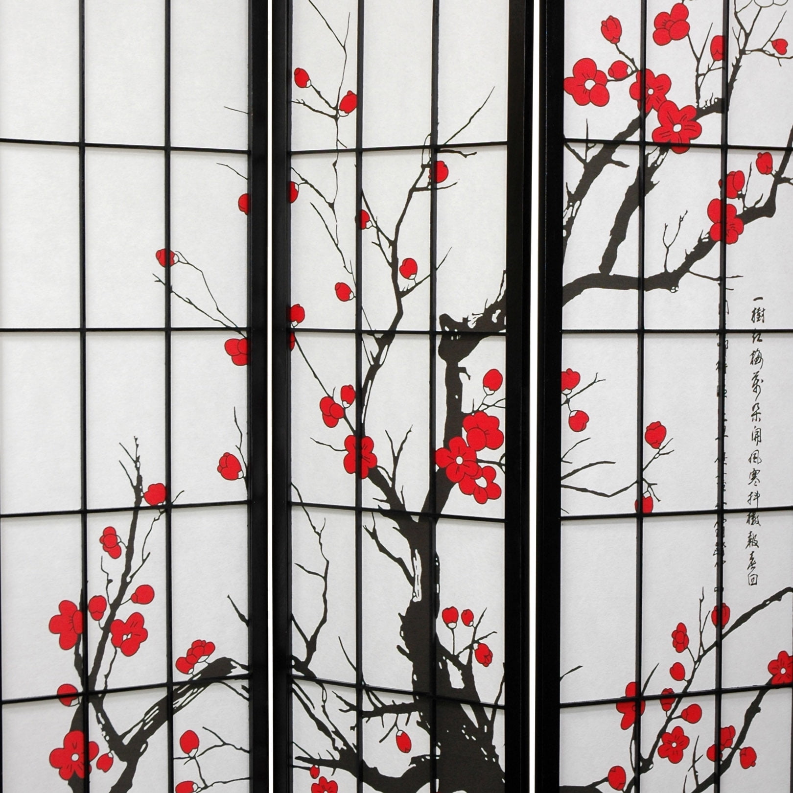 6′ Tall Flower Blossom Room Divider: Japanese Shoji style folding screen Washi rice paper diffuses light and provides privacy Classic cherry tree design and wood lattice on front Color: white Material: rice paper