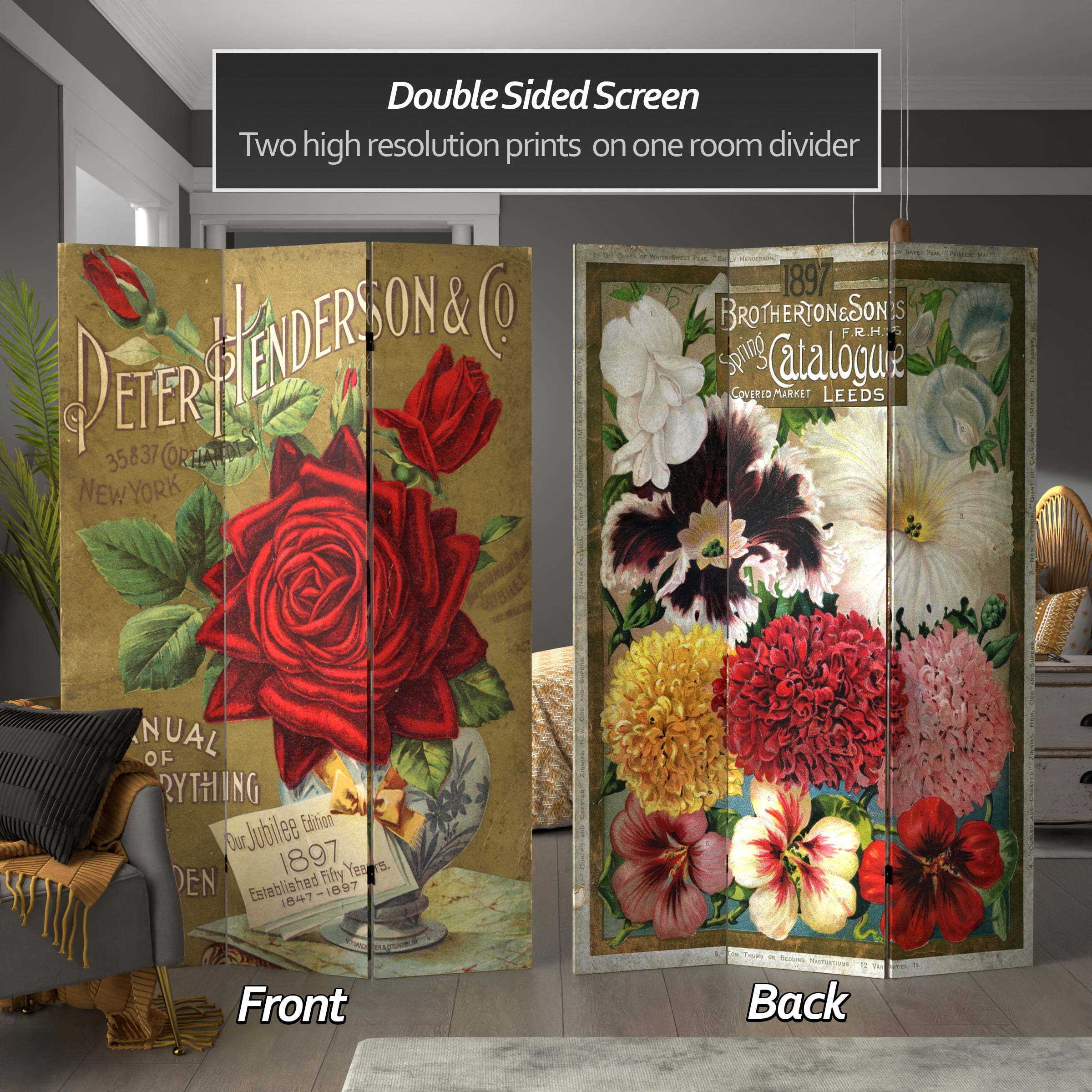 6′ Tall Double Sided Flower Seeds Canvas Room Divider, Roses: High-quality wood and fabric covered room divider Constructed with extra durable kiln dried Spruce wood frame panels and covered top to bottom, front, back, and edges with tough stretched poly-cotton blend canvas 2 extra-large beautiful art prints Printed with fade-resistant, high color saturation ink, creating 2 stunning, long-lasting, vivid images A powerful visual focal point for any room An amazingly inexpensive, practical, portable decorative accessory Almost entirely opaque, the layers of canvas provide complete privacy Easily block light from a bedroom window or doorway Color: Multi Material: Canvas, spruce wood