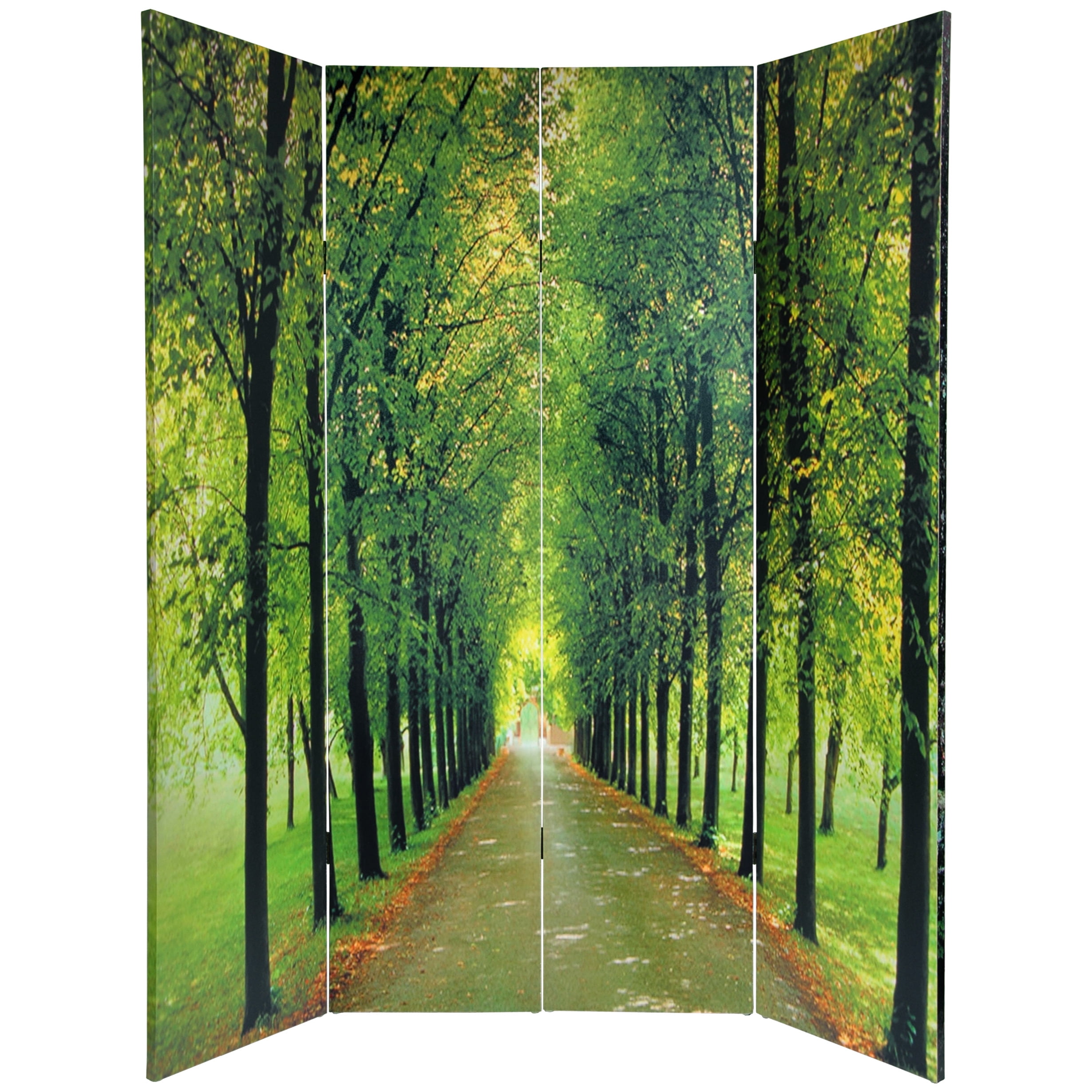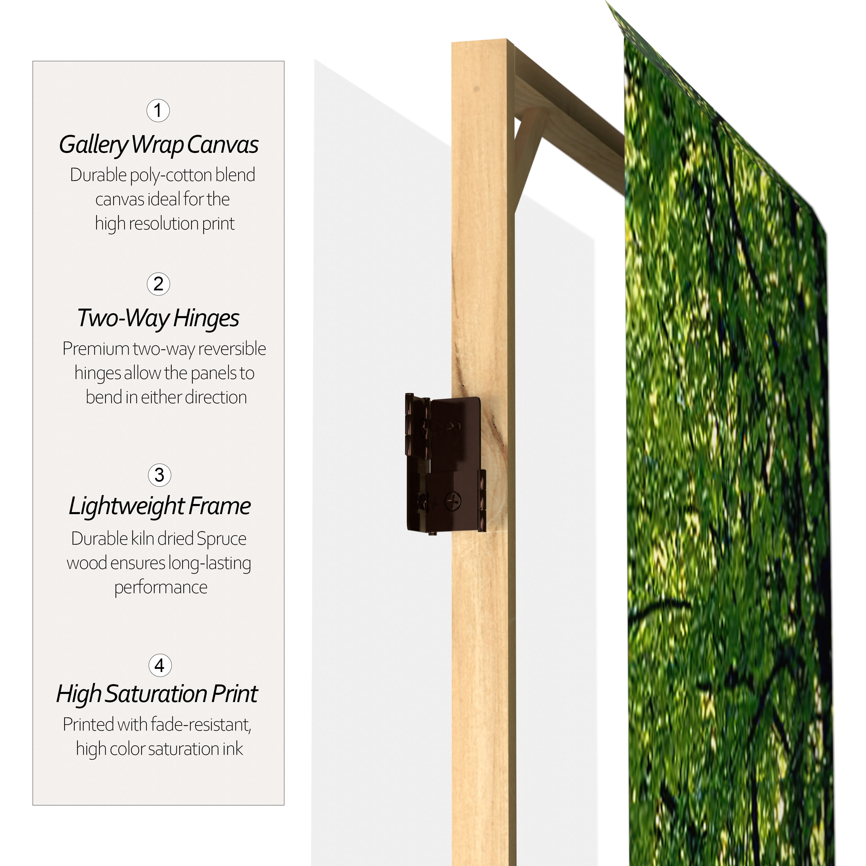 6′ Tall Double Sided Path of Life Canvas Room Divider: Carefully constructed reinforced wood frames of hardy, kiln dried spruce Covered top to bottom, front and back and on the edges, with stretched poly-cotton blend canvas Printed with high saturation ink to create a beautiful, long lasting image Almost entirely opaque room dividers Very little light can pass through the layers of canvas, offering complete privacy 4 panel room divider Gorgeous green color palette Made from canvas stretched around a spruce wood frame