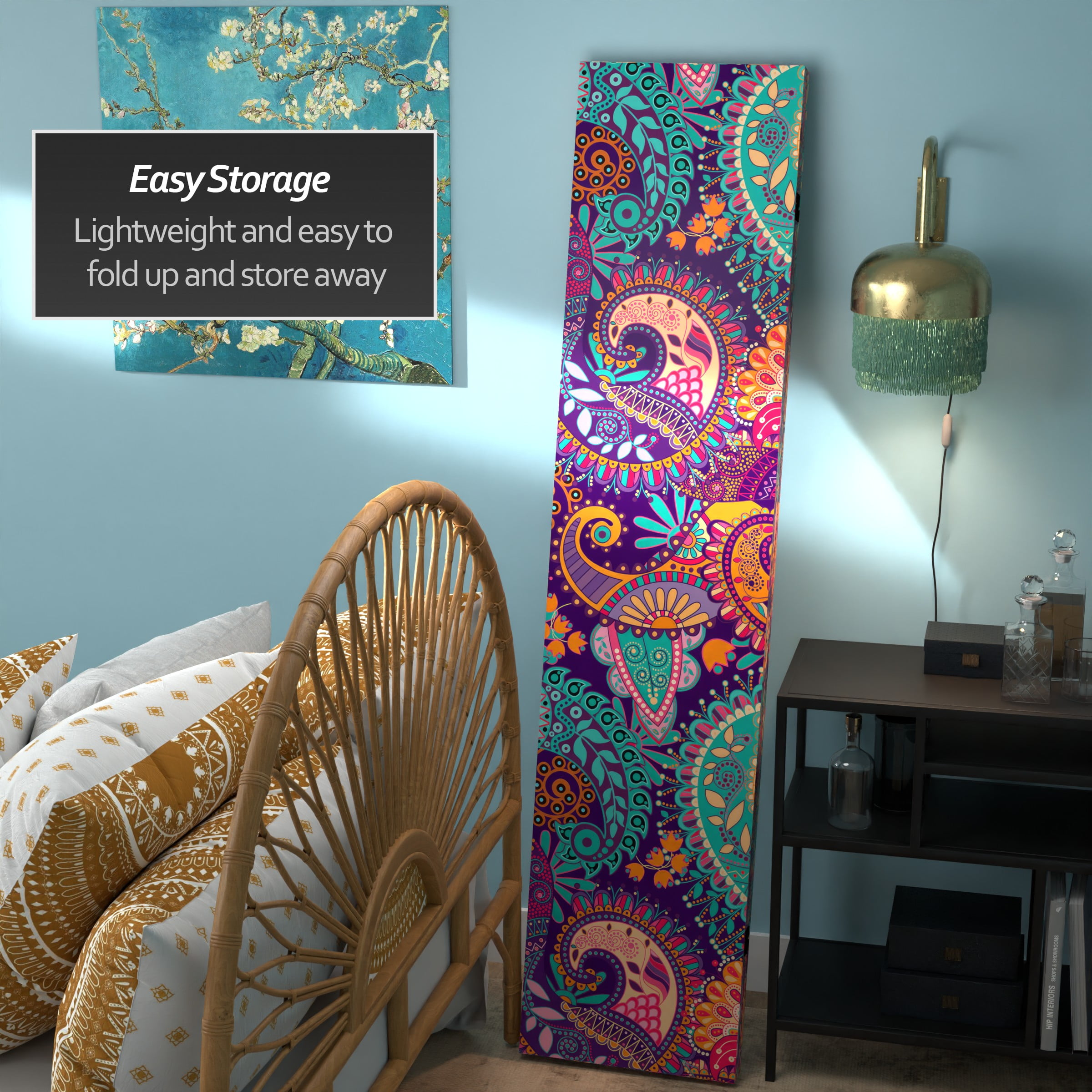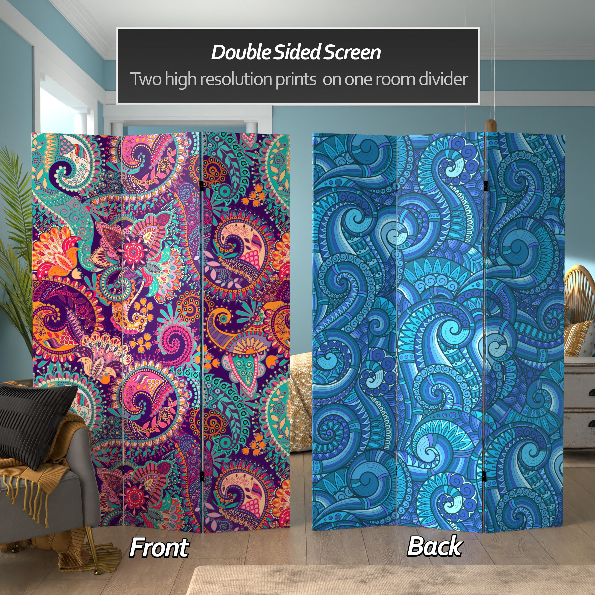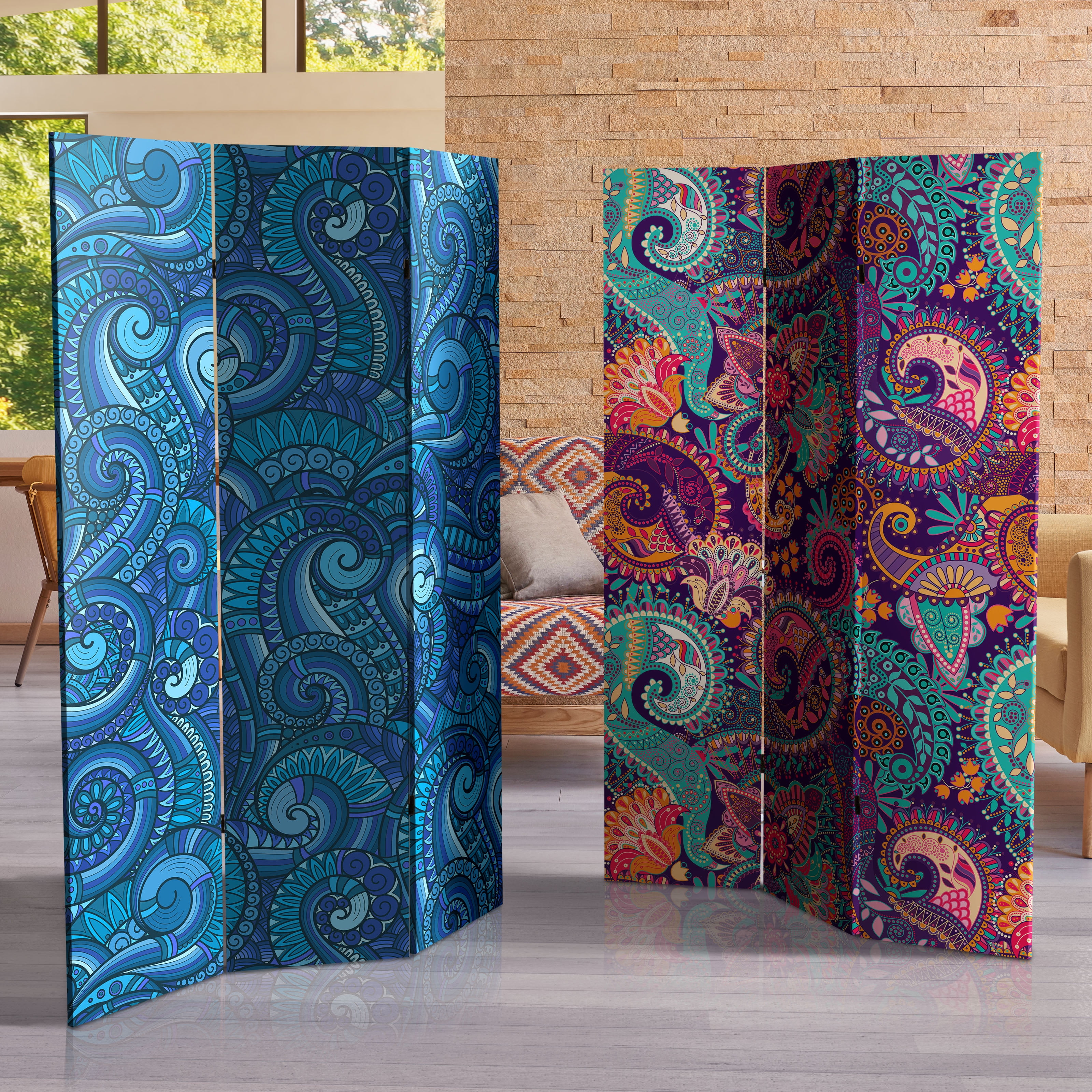Harkening back to the psychedelic age of the 60’s when poster artists like Victor Moscoso and Wes Wilson got their start, this room divider is really a trip. The swirling designs and stunning colors will make anyone happy. This screen would make a lively addition to a playroom, family room or office.