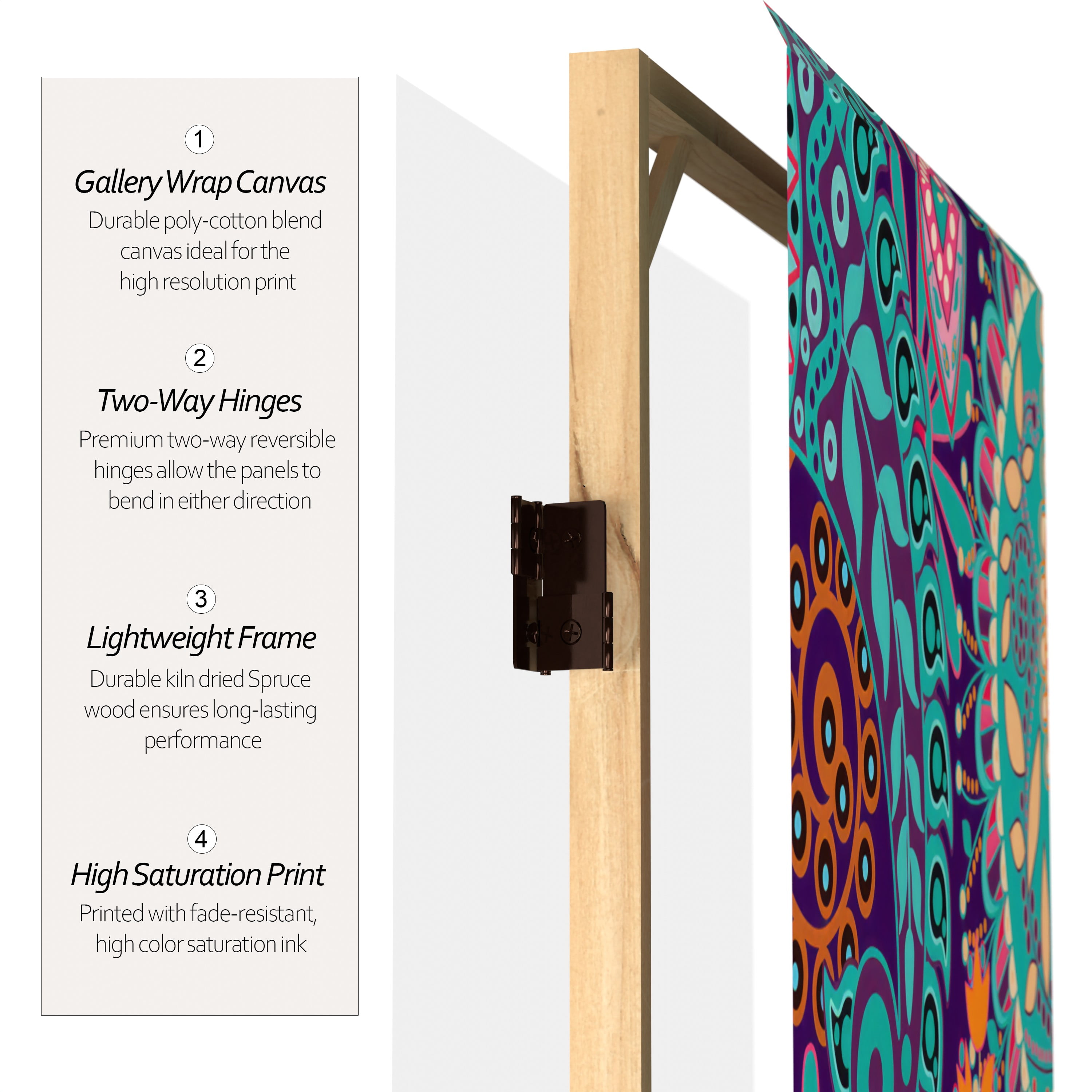 Panels are double hinged, to bend in either direction Printed with high saturation ink to create a beautiful, long lasting image Art-quality natural canvas stretched around a lightweight spruce frame