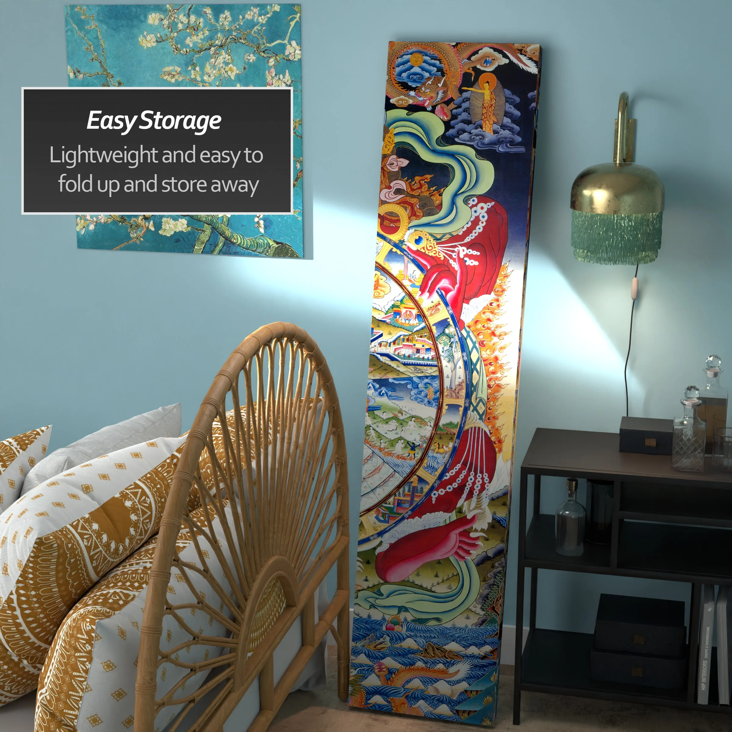 6′ Tall The Wheel of Life Double Sided Canvas Room Divider: Reproduction of an authentic Himalayan artwork High quality canvas wrapped around a stable wooden frame Wheel of Life appears on both front and back Color: multi Material: canvas, spruce wood