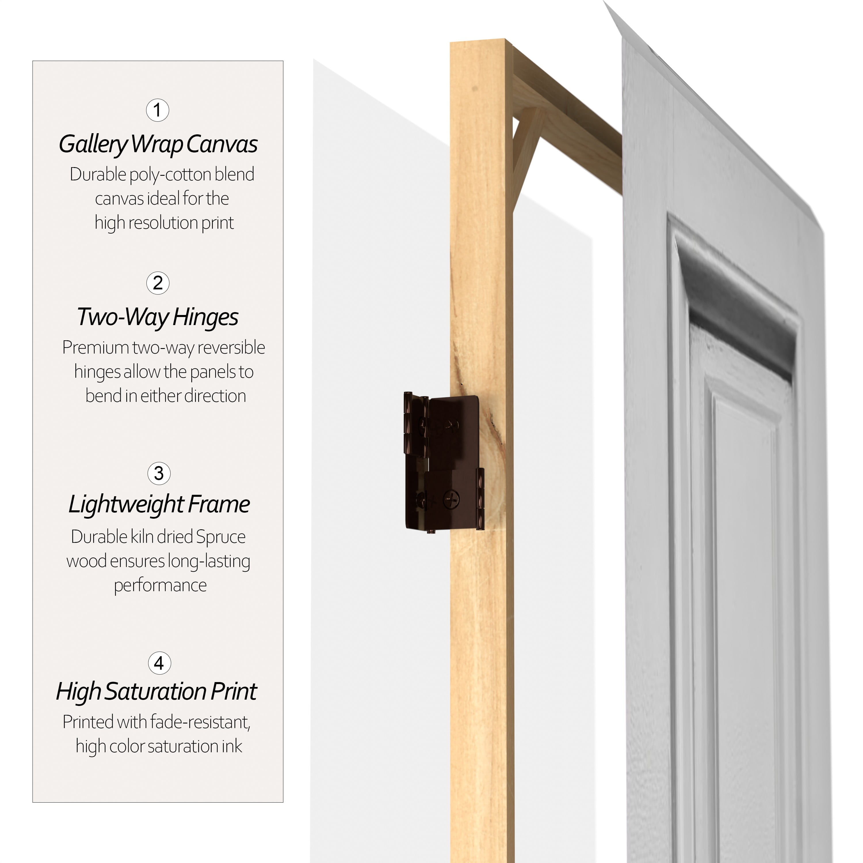 Both sides feature a vintage white door design Creates a powerful visual focal point for any room Panels are double hinged, to bend in either direction