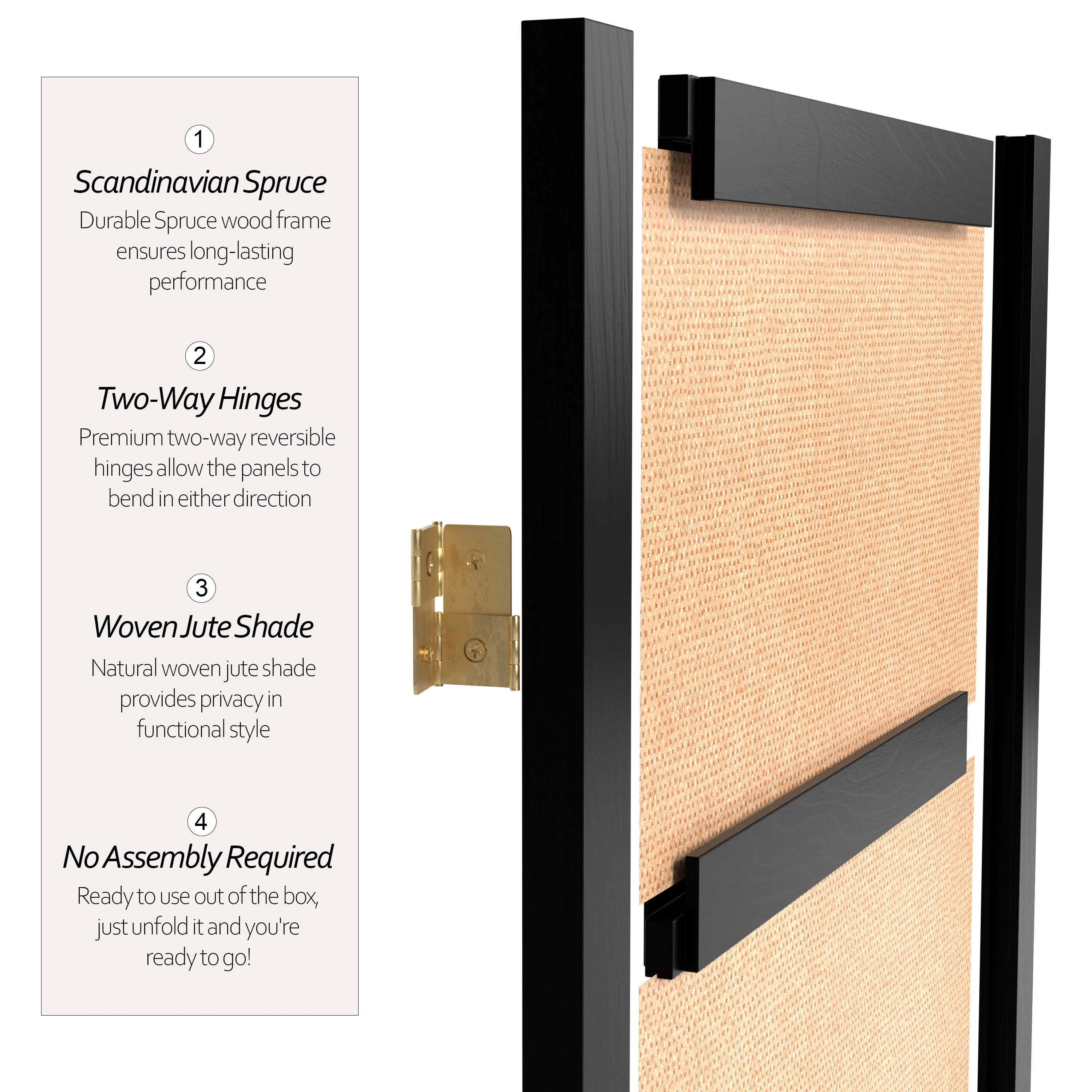 7′ Tall Jute Shoji Screen: Crafted from durable, lightweight Scandinavian Spruce, using Asian style mortise and tenon joinery Shade is strong, tightly woven jute panels to block light and provide complete privacy Lacquered brass, 2 way hinges mean you can bend the panels in either direction Color: rosewood Material: natural fiber