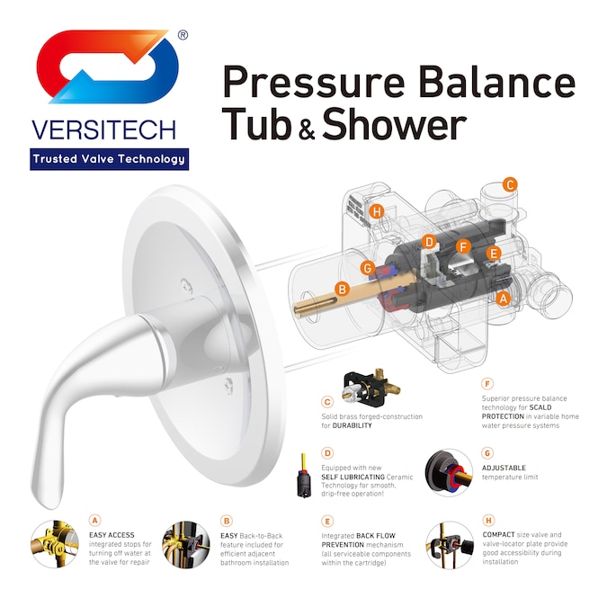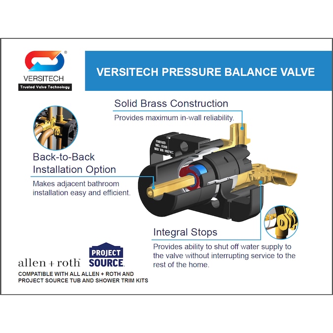 - VERSITECH Pressure Balance Valve with compact plaster guard marked with install depth including optional back to back installation