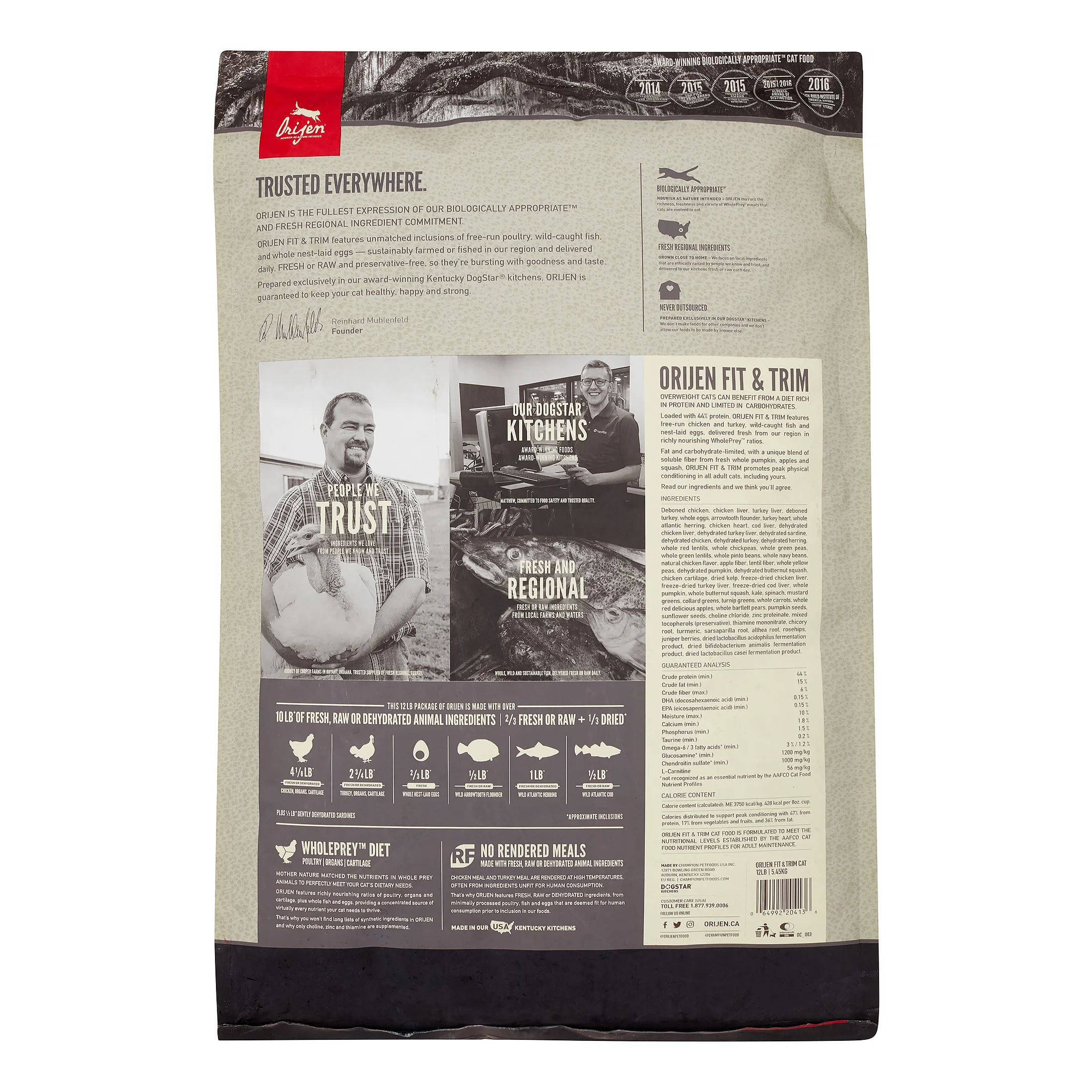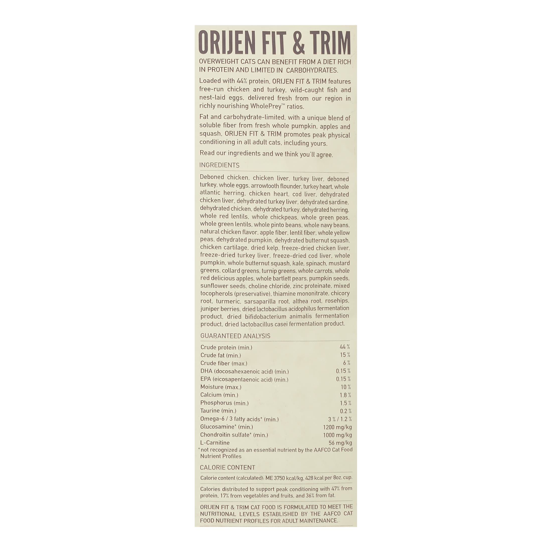 Orijen Fit and Trim Dry Cat Food, 12 Lb Orijen Fit and Trim Dry Cat Food is a biologically appropriate cat food for overweight cats that features fresh ingredients and zero preservatives or grains. Orijen Fit and Trim Dry Cat Food formula contains fresh free-run chicken and turkey, nest-laid eggs, and wild-caught fish. The Canadian award-winning product line of Champion Petfoods, Orijen creates dog food similar to the carnivorous canine diet in the wild. Its biologically appropriate formula (a ratio of 80% meat to 20% fruits and vegetables to 0% grain) is High in animal Protein, low in carbohydrates and free of grain fillers.