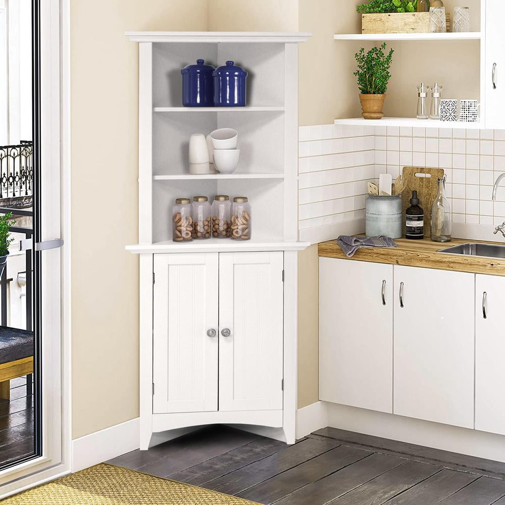 Classic white painted, raised panel doors highlight the OS Home and Office kitchen storage assortment. Add much needed storage to your kitchen or bath with this truly functional corner cabinet. 2 raised panel doors for concealed storage accompany 3 shelves for added storage and or display space for your everyday kitchen or bath items. The corner design allows you to utilize space that may not be available with traditional cabinetry.