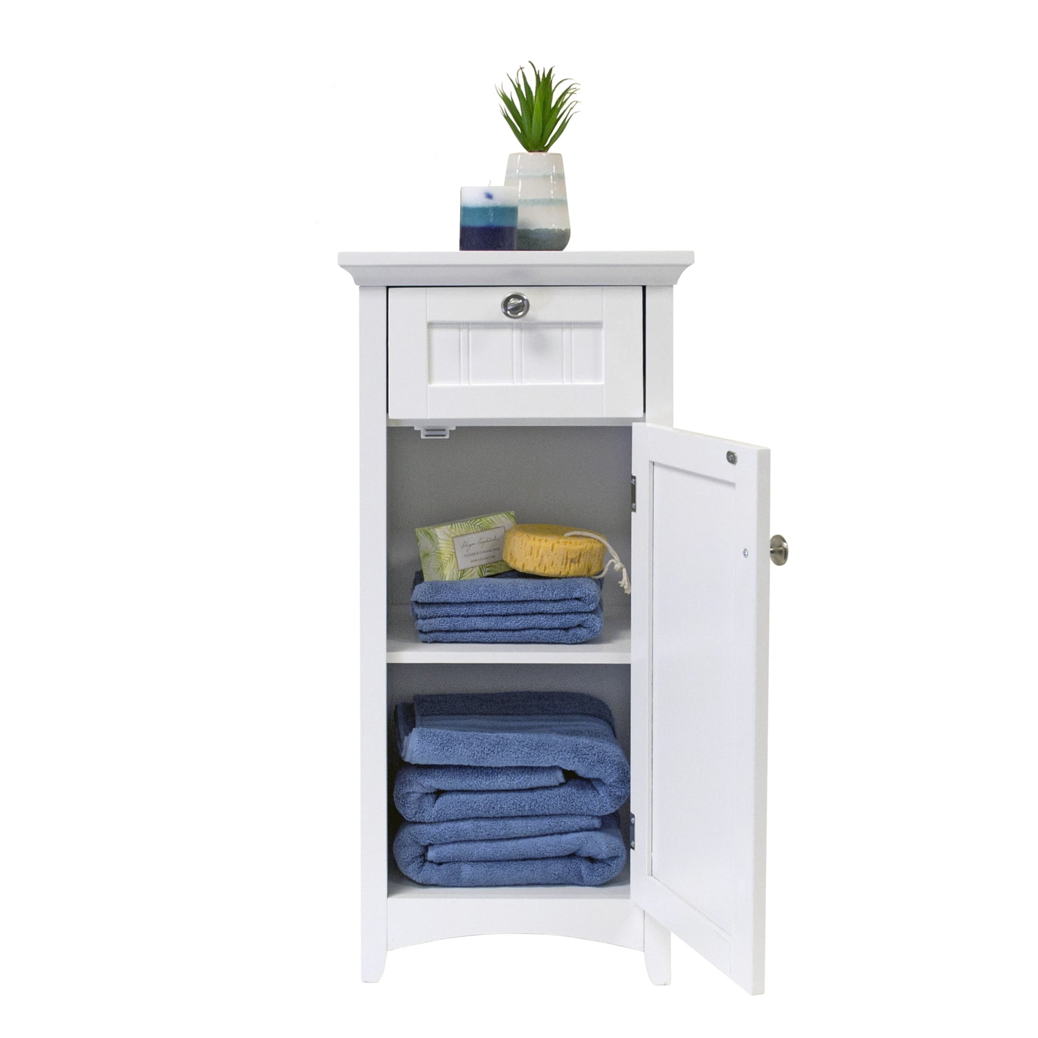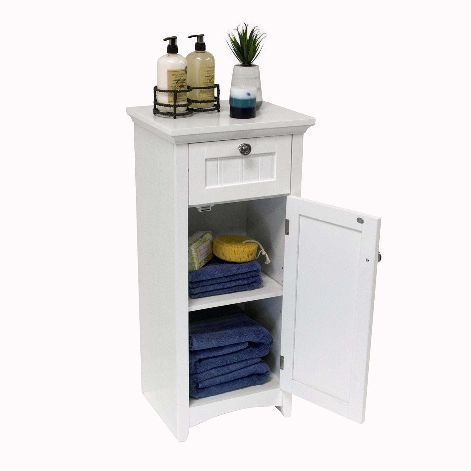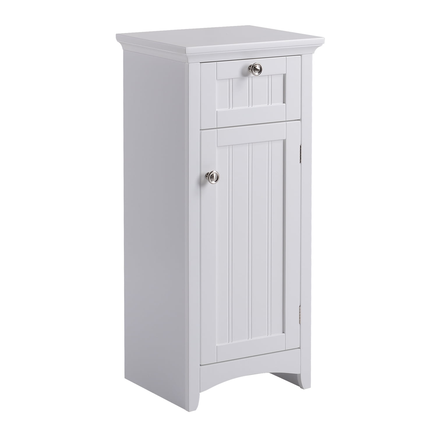 Materials: Paper laminate wood Finish: White Handy, attractive drawer on sturdy metal guides. One white painted raised panel vein lined door hides spacious storage area. Stylish tapered front rails and arched kick panel. Attractive Brushed Nickel Door and Drawer Knobs. Thick, beveled top adds a stylish touch. Safety strap included to prevent accidental tipping.