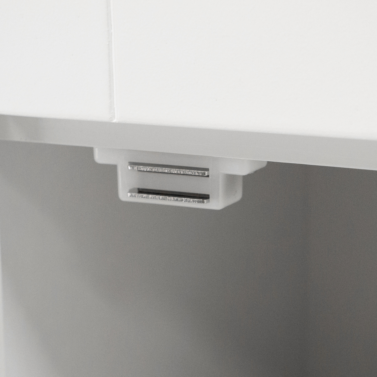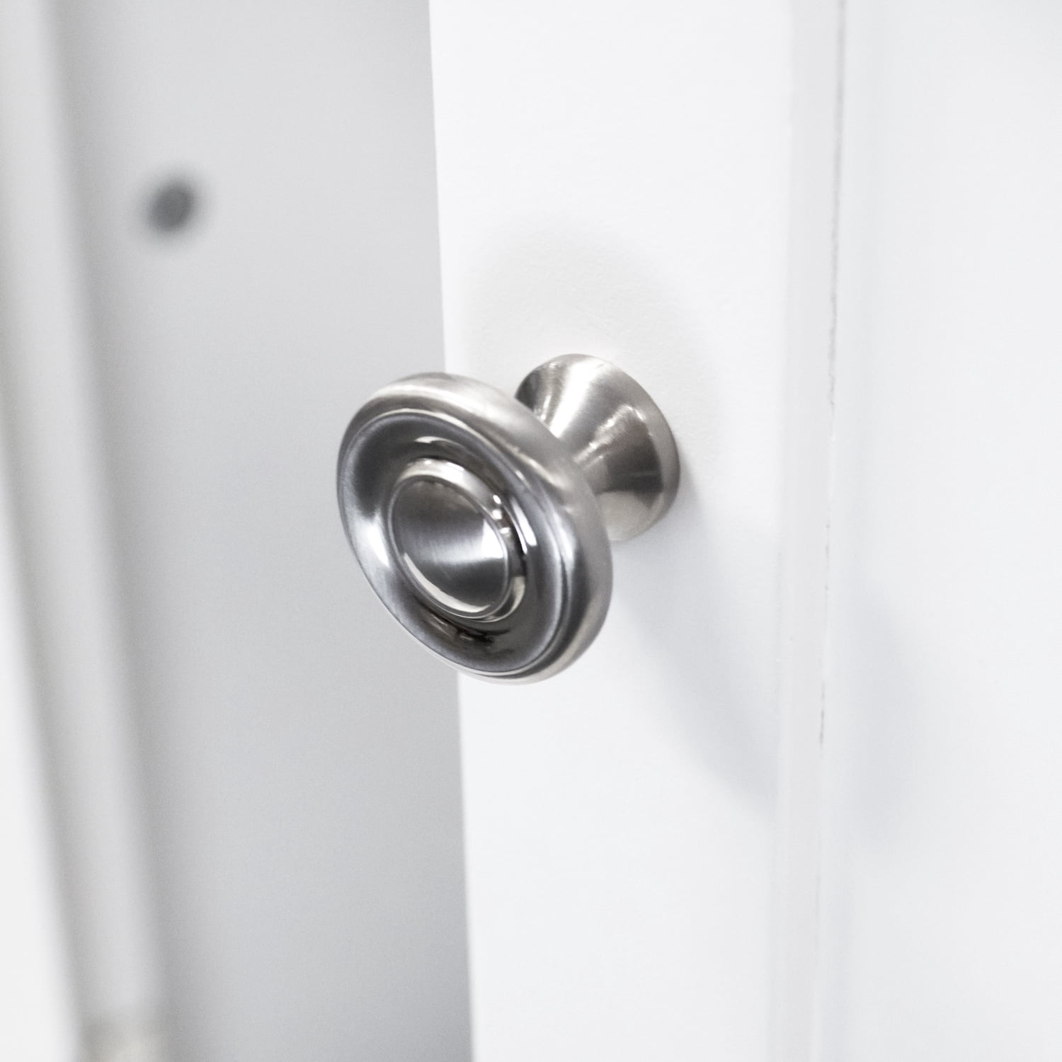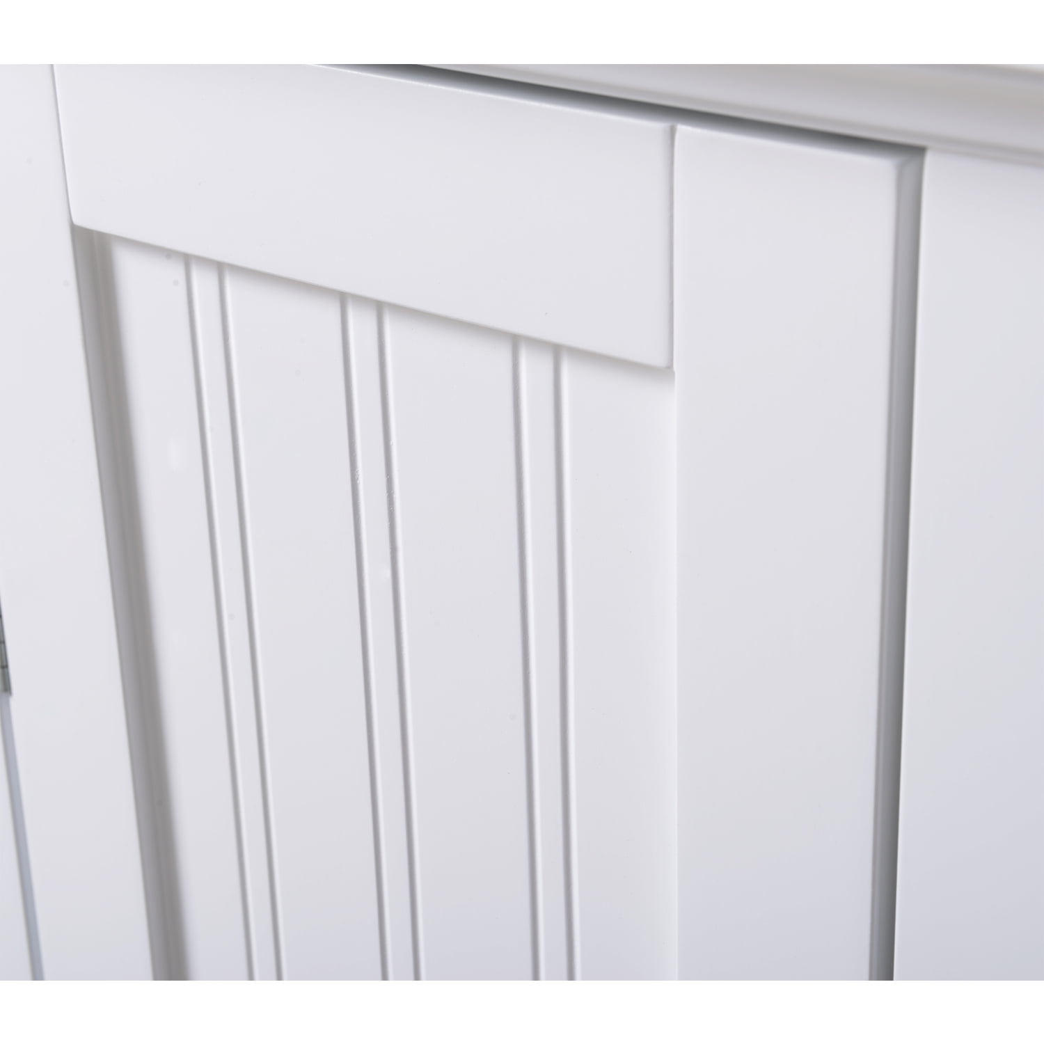 Materials: Paper laminate wood Finish: White Handy, attractive drawer on sturdy metal guides. One white painted raised panel vein lined door hides spacious storage area. Stylish tapered front rails and arched kick panel. Attractive Brushed Nickel Door and Drawer Knobs. Thick, beveled top adds a stylish touch. Safety strap included to prevent accidental tipping.