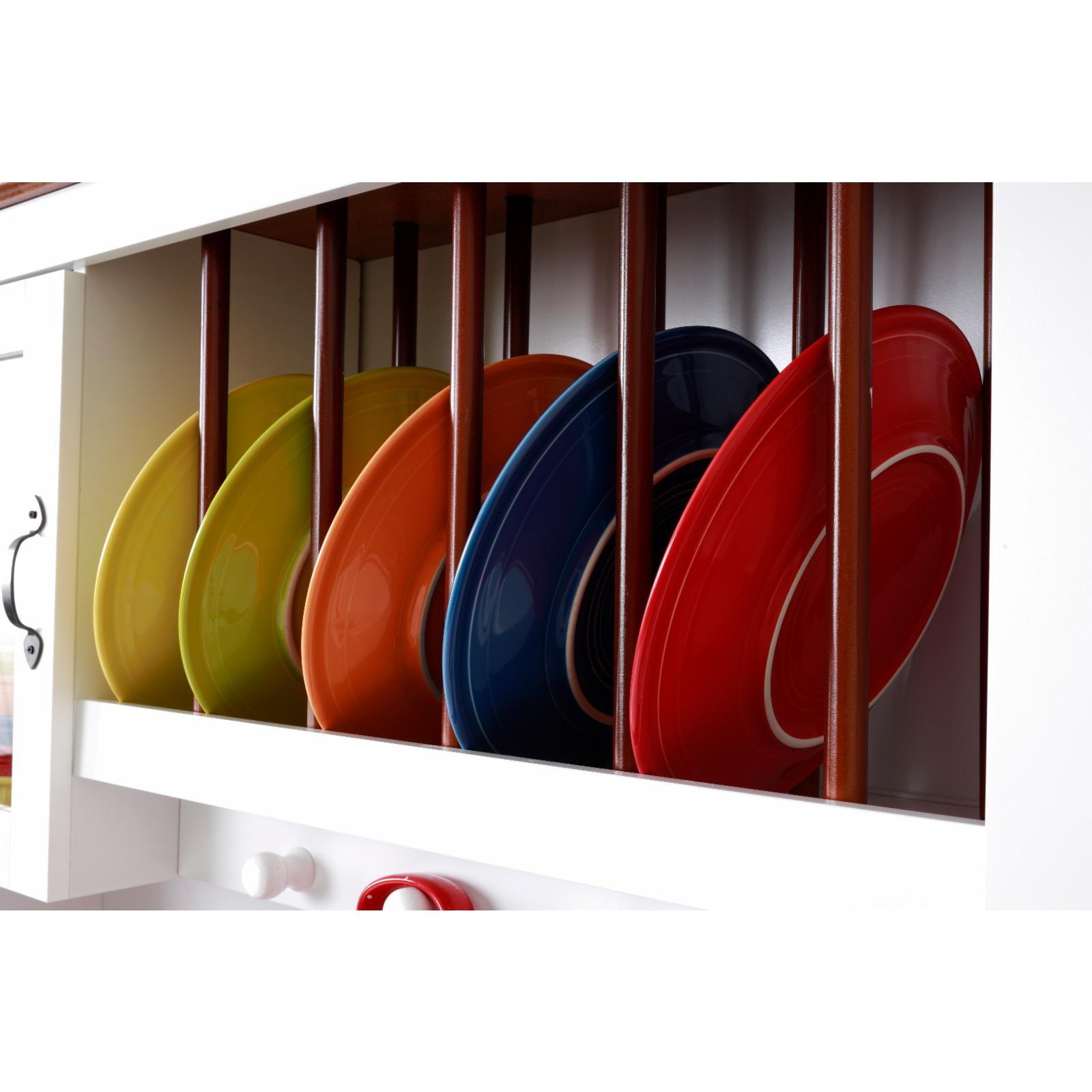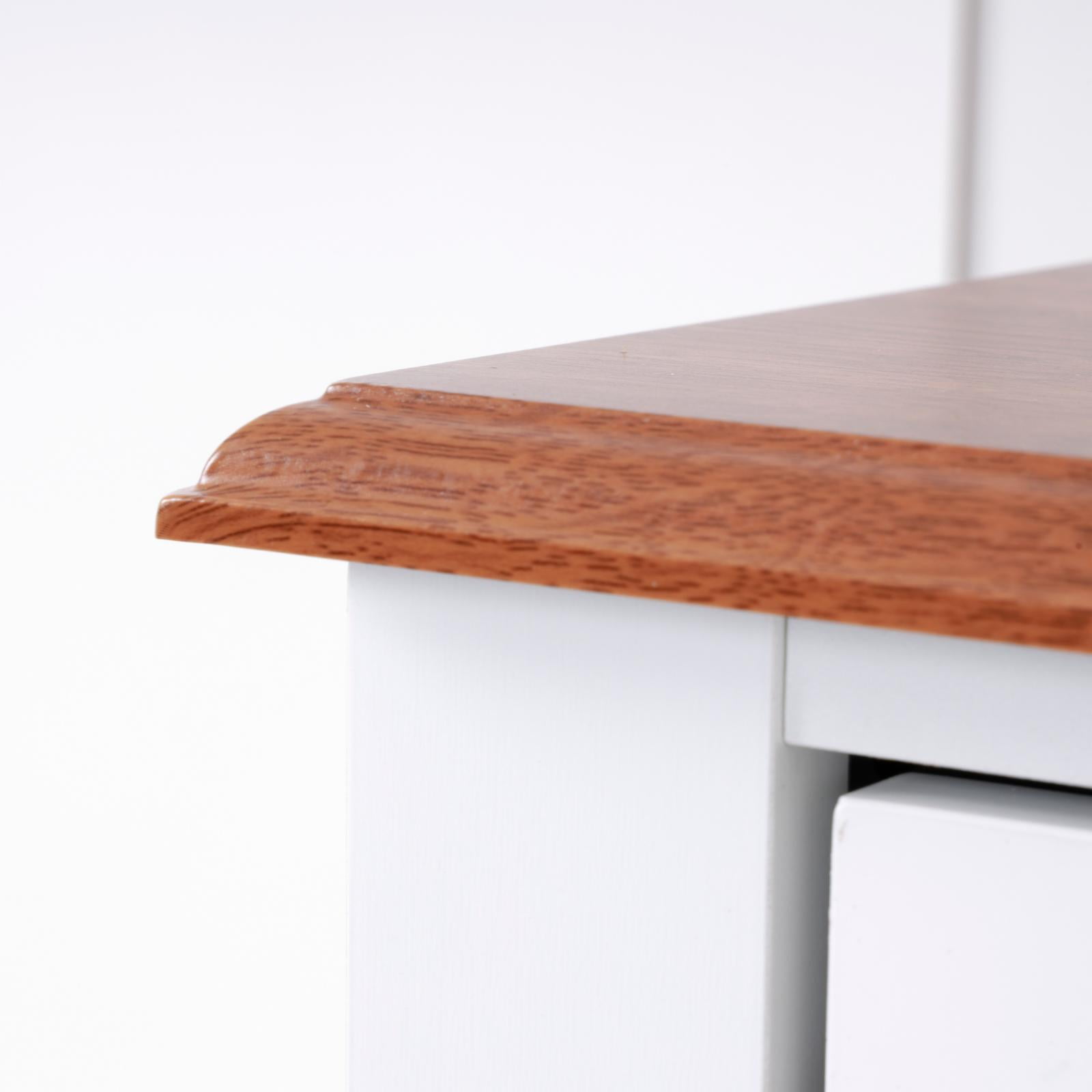 Multi-Functional cabinet utilizing 2 doors to conceal dishes, glassware, or table ware. In addition, 2 pull-out drawers maximize useful storage space. Ample open center space allows decorative items, or utilize the space for additional storage or your necessary kitchen or dining accessories. The warm pine laminated top adds a nice compliment to the crisp white painted doors and drawer fronts. Features : Crisp White painted Drawers and Door Fronts accompany durable laminated surfaces. 2 Doors accompanied by 2 pull-out drawers maximize concealed storage for plates, glassware, or kitchenware Warm Pine laminated top offers a nice contrast to the all white antique style cabinet Open center storage for decorative items or additional storage space as needed Framed Glass door Wooden plate dividers Wooden Cup holders Tapered front rails and arched kick panel. Specifications : Material : Laminate Top Assembly Required : Yes Color/Finish : Crisp White with Warm Pine Tops