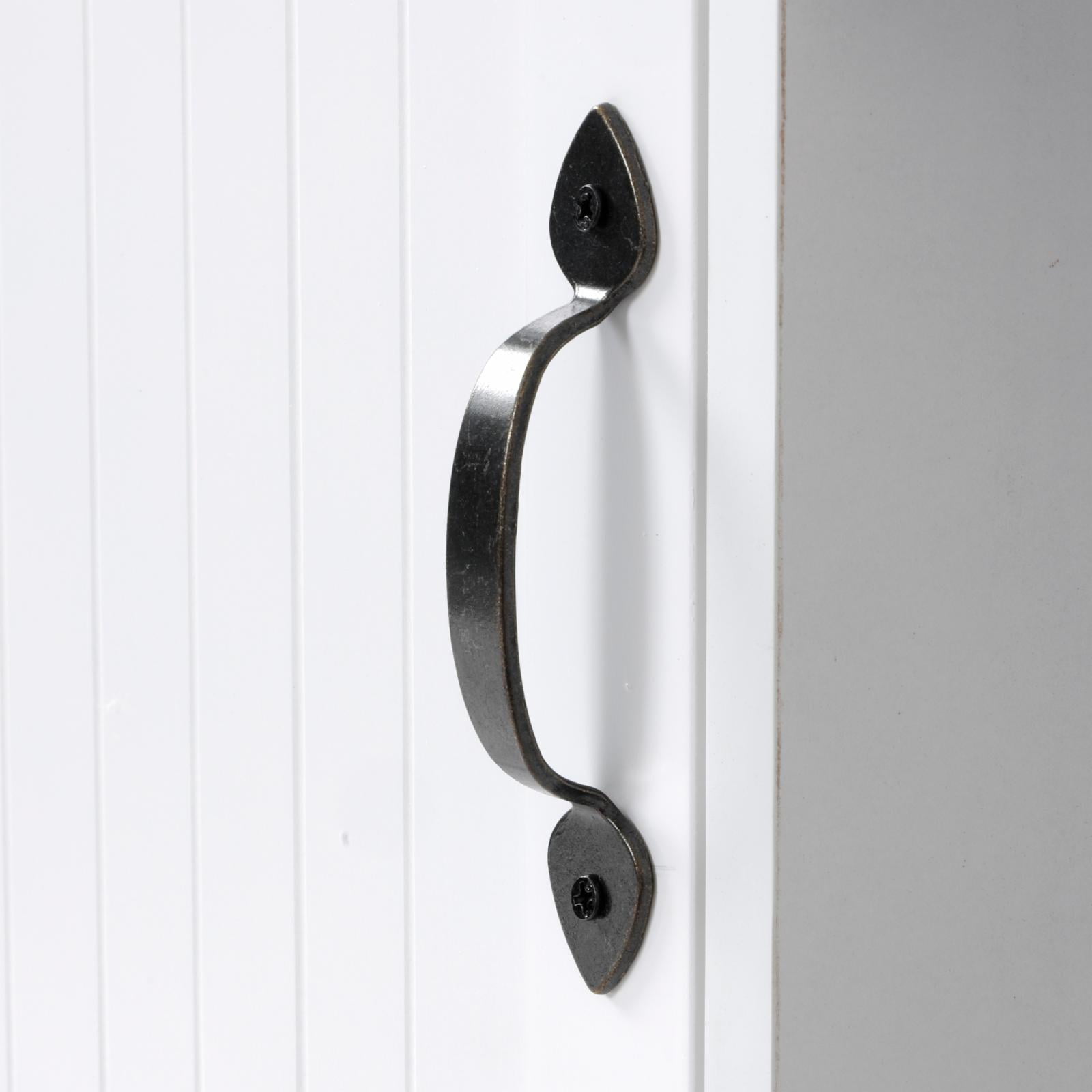 Crisp White painted Drawers and Door Fronts accompany durable laminated surfaces. 2 Doors accompanied by 2 pull-out drawers maximize concealed storage for plates, glassware, or kitchenware Warm Pine laminated top offers a nice contrast to the all white antique style cabinet Open center storage for decorative items or additional storage space as needed Framed Glass door Wooden plate dividers Wooden Cup holders Tapered front rails and arched kick panel.