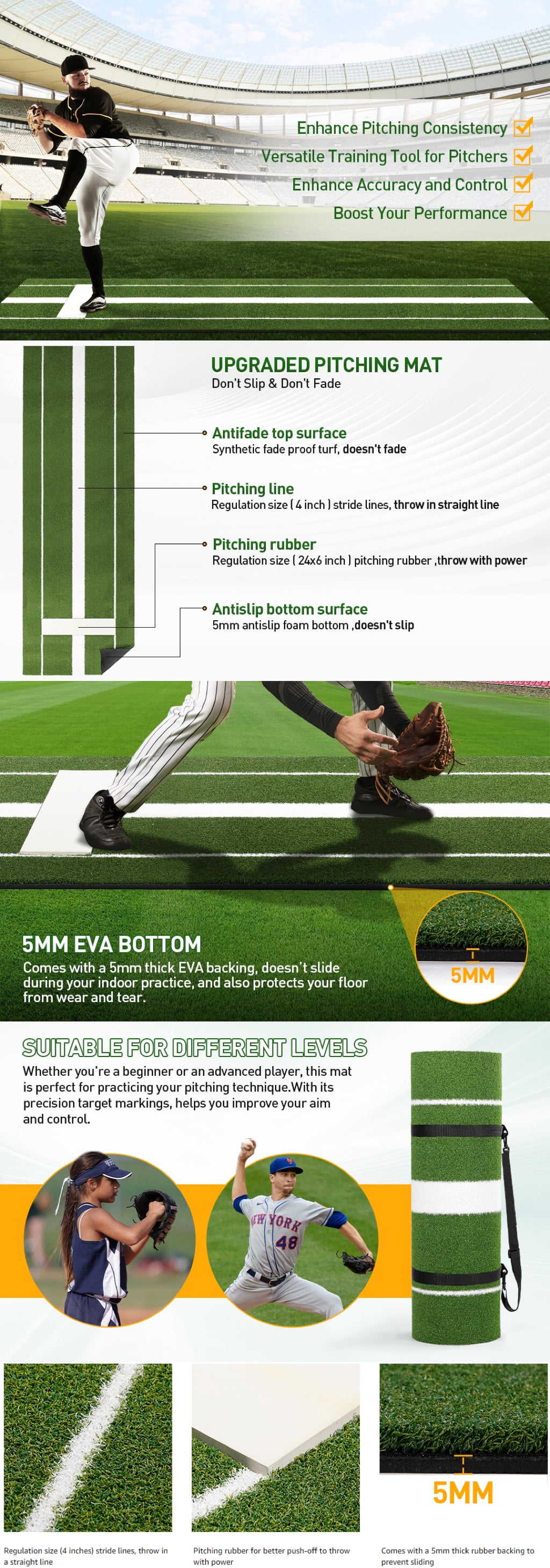 Osoeri 10’x 3′ Portable Softball Pitching Mound Elevate Your Game: Designed for athletes of all skill levels, perfect for enhancing pitching skills Durable Materials: Crafted from highquality nylon and artificial grass for both indoor and outdoor use Authentic Training Experience: Includes pitching rubber that replicates the feel of a real mound Lightweight & Easy to Store: Convenient design protects floors while providing a stable practice surface Essential Training Equipment: Thoughtful construction helps improve accuracy and performance on the field