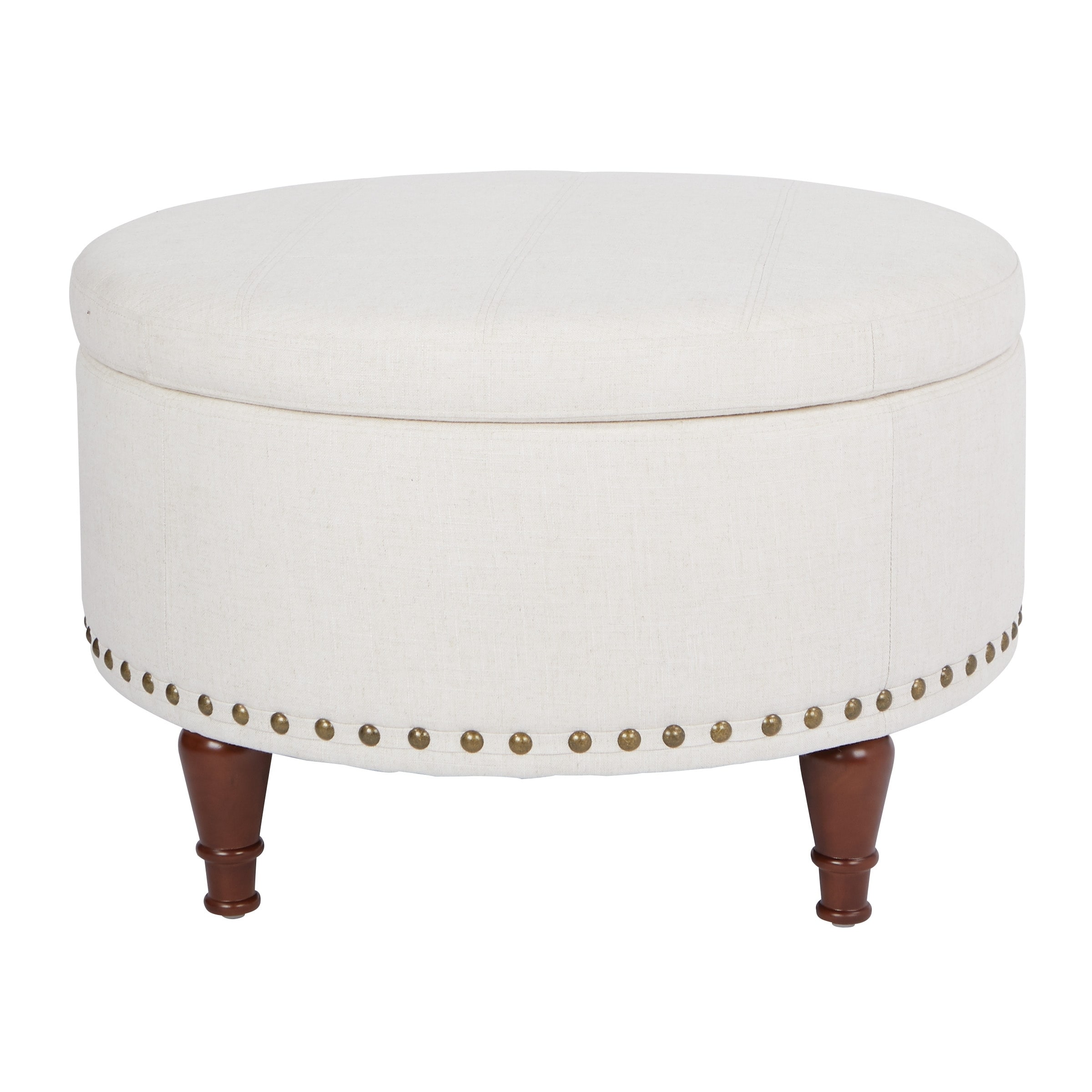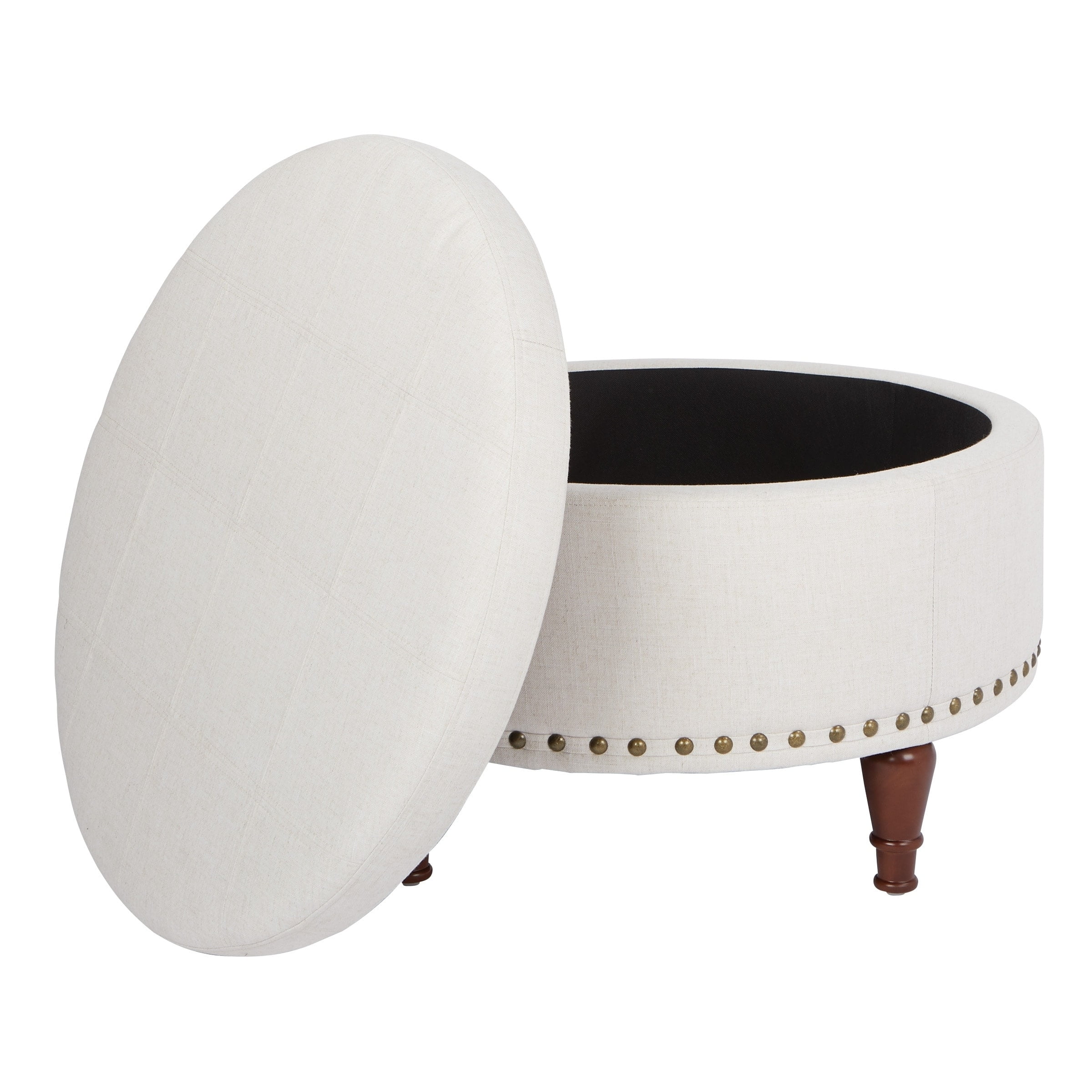 Stylish storage ottoman Nail head accents Tray Top Solid wood legs Capable of storing a variety of personal belongings for the sake of convenience. Embraced in beautiful nailhead accents and sturdy wood legs.