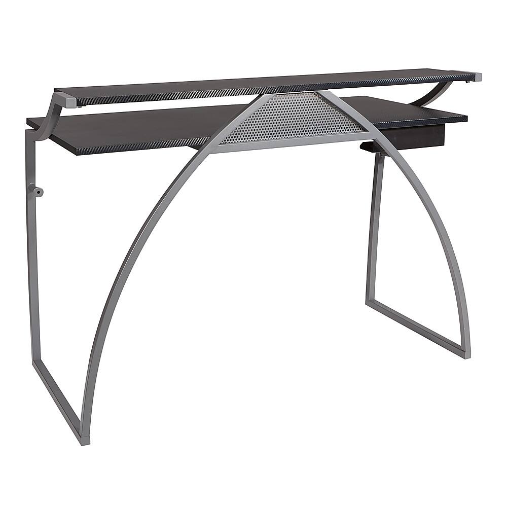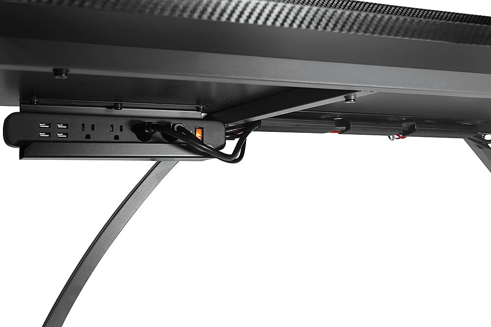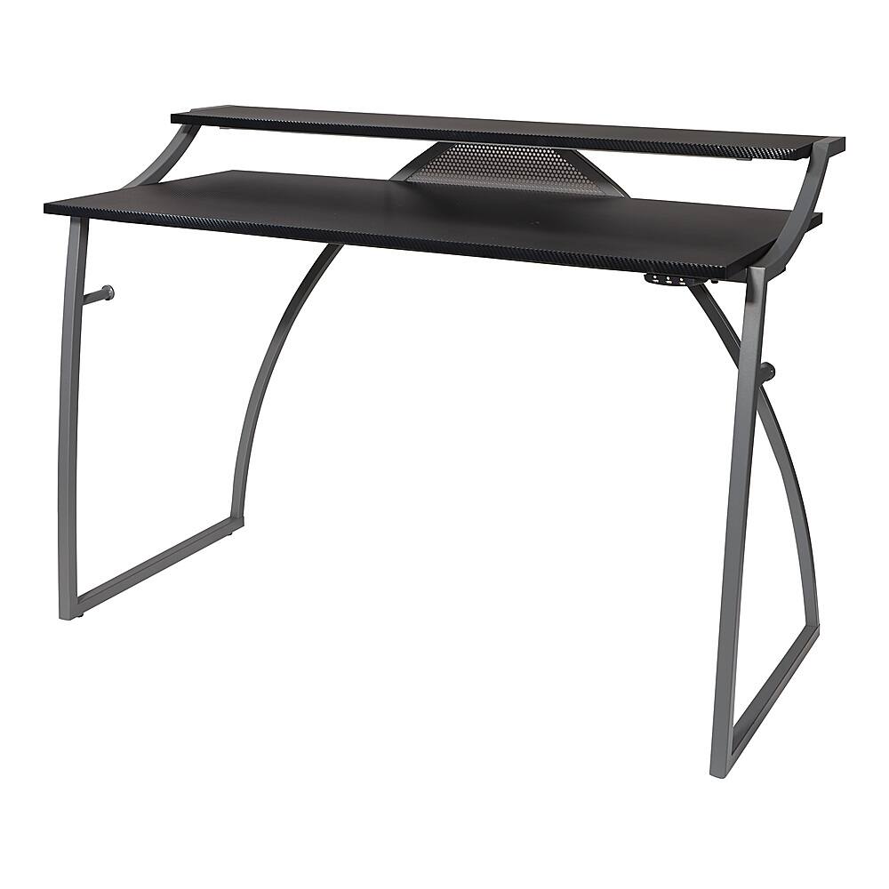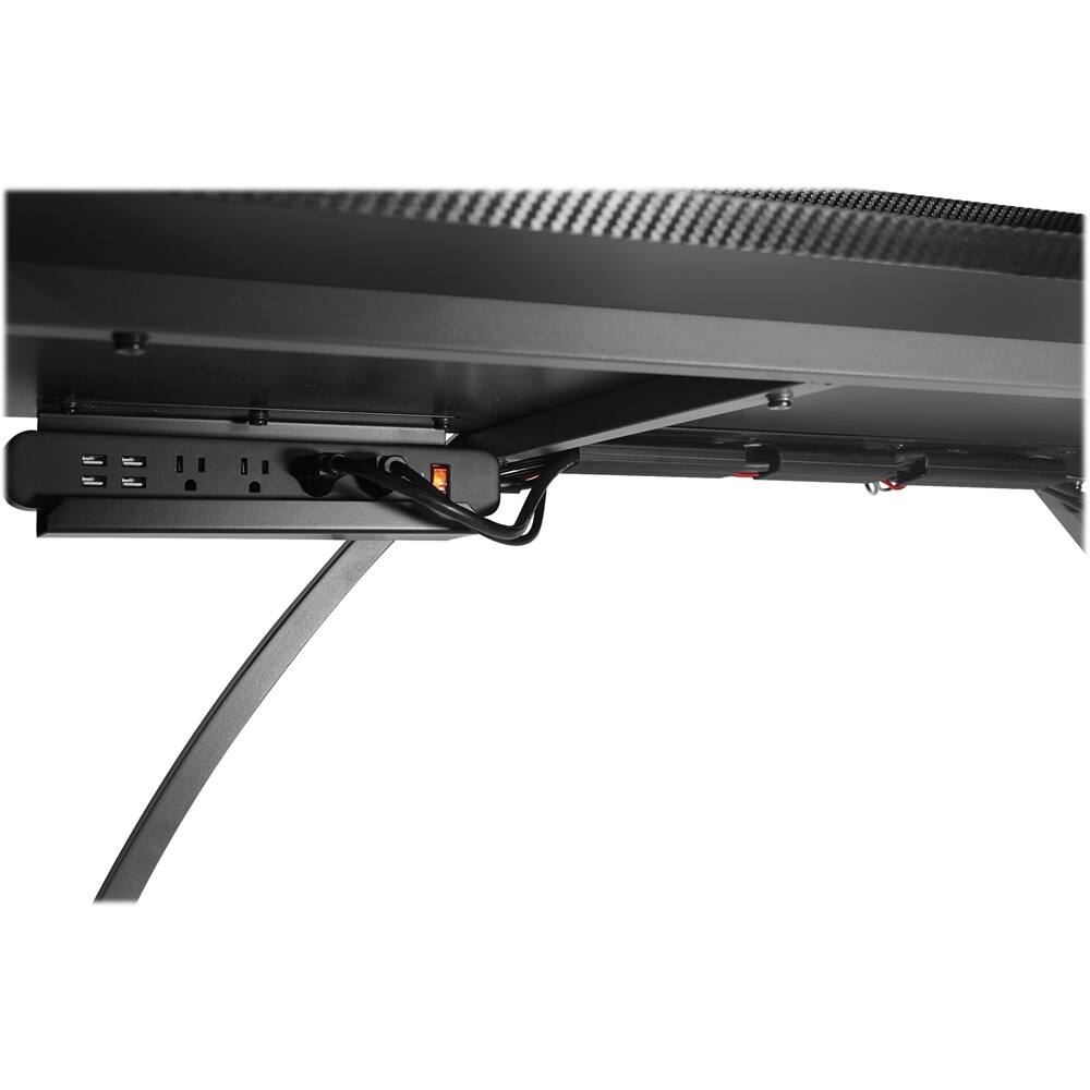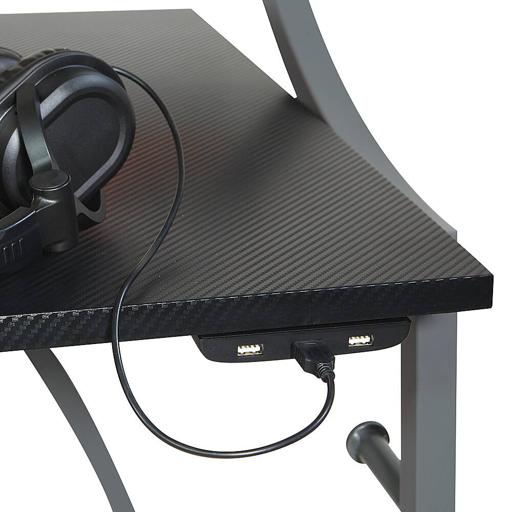 Gaming has never been more engaging than with the versatile Alpha Battlestation Desk from OSP Home Furnishings. Its sleek modern design features an expansive gaming area and an upper shelf broad enough for dual monitors. Get competitive with our matte, carbon fiber surface ready for a full range of mouse action. Bluetooth LED lights ensure optimum game immersion. Other innovative design features include integrated headset hook, a three-port magnetic power USB hub, a power strip bracket, and cable management to keep cords organized.