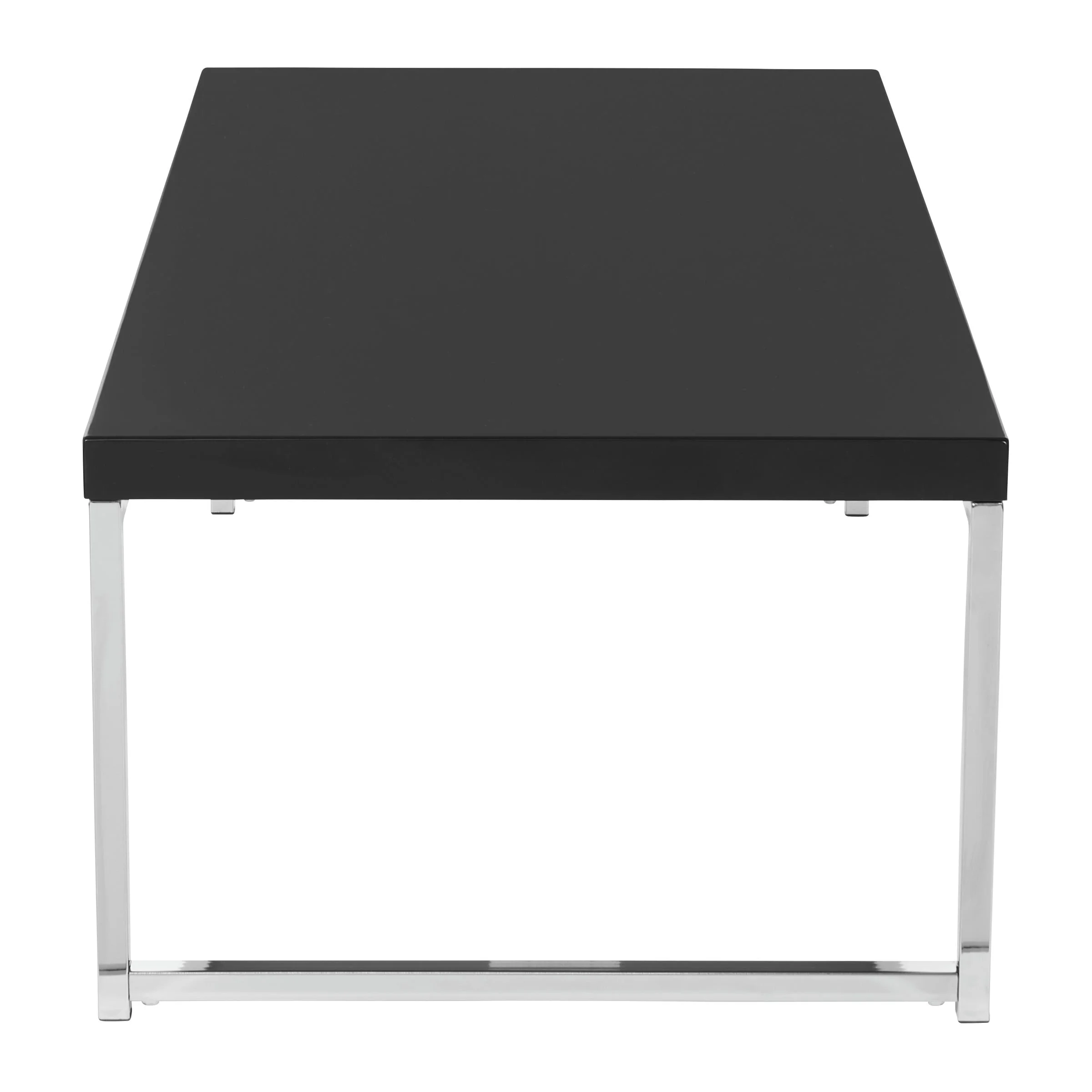 Finish: Black and Chrome Finish Material: Melamine and Chrome Laminated Black top with clear lacquer finish Coffee Table Durably fabricated with reinforced beam construction and a thick table top that features a flush wood-to-metal edge that provides for a sleek yet beautifully simple appeal, this table is specimen of simple sophistication. Outfitted with light reflective chrome legs and table top parameter Instantly brightens any space where it is utilized while still retaining its refined demeanor.