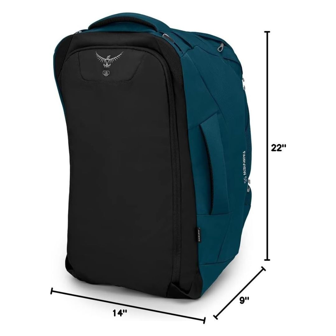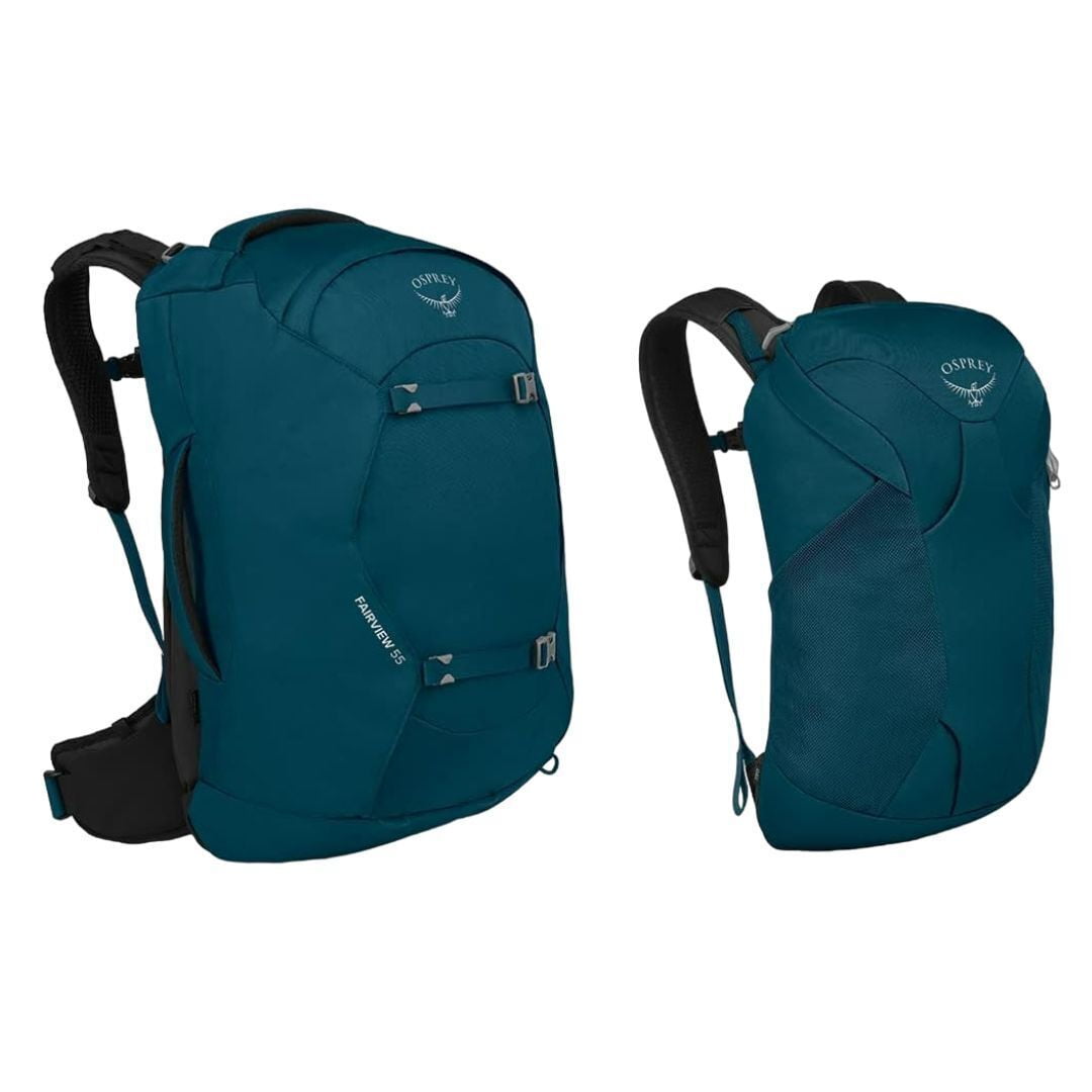 Ospreys womens specific Fairview 55 is the perfect companion for a long weekend. Feel free to add an extra sweater and a pair of waterproof boots – this pack is designed to handle loads up to 50 pounds. The LightWire frame suspension transfers the load from harness to hipbelt. A mesh backpanel improves ventilation and the mesh on the harness and hipbelt reduces chafing under load. The entire suspension stows away under a zippered panel creating a sleek silhouette for transport. Inside theres a mesh pocket for small items. Dual compression straps keep cargo from shifting during transit. Outside you will find a zippered front panel slash pocket to keep you organized and sewn attachment points to lash on extra gear. The Fairview 55 comes with a detachable daypack to carry the essential for a hike in the hills or an excursion downtown. No matter where you go the Farpoint is backed by Ospreys All Mighty Guarantee. Durable fabrics in high-wear areas combine with smart design to create a lightweight and tough travel pack that will last a lifetime.