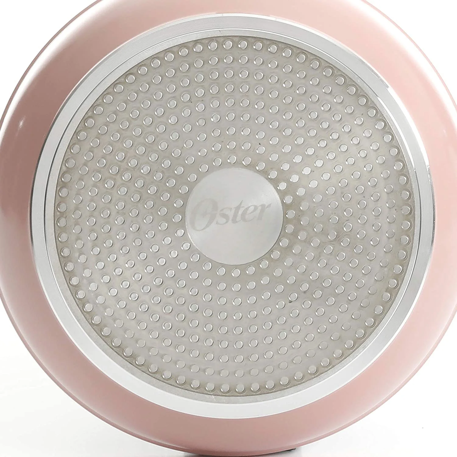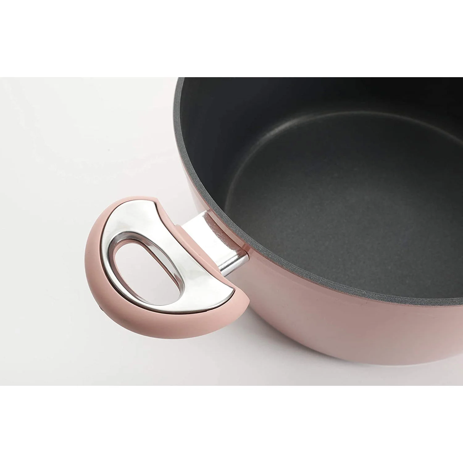 12-piece cookware pot and pan set provides you with multiples sizes so you’re prepared to cook just about anything Includes 1-quart saucepan with lid, 2-quart saucepan with lid, 5-quart dutch oven with lid, 9.5-inch frying pan, 13 x 9-inch cookie sheet, 9-inch round cake pan, slotted turner, solid spoon, and a slotted spoon Forged aluminum design quickly responds to changes in temperature and distributes heat evenly to all ingredients Long stay-cool handles with thumb grip keep you in control and safely away from your heat source Non-stick coating keeps cleaning simple and pain-free Recommended that metal utensils are not used with this pan to avoid non-stick finish from scratching off Stainless steel dished ends Compatible with all stovetops including induction Heat resistant exterior lacquer Hand washing recommended Material: Forged aluminum Color: Dusty rose Weight: 14.27 pounds