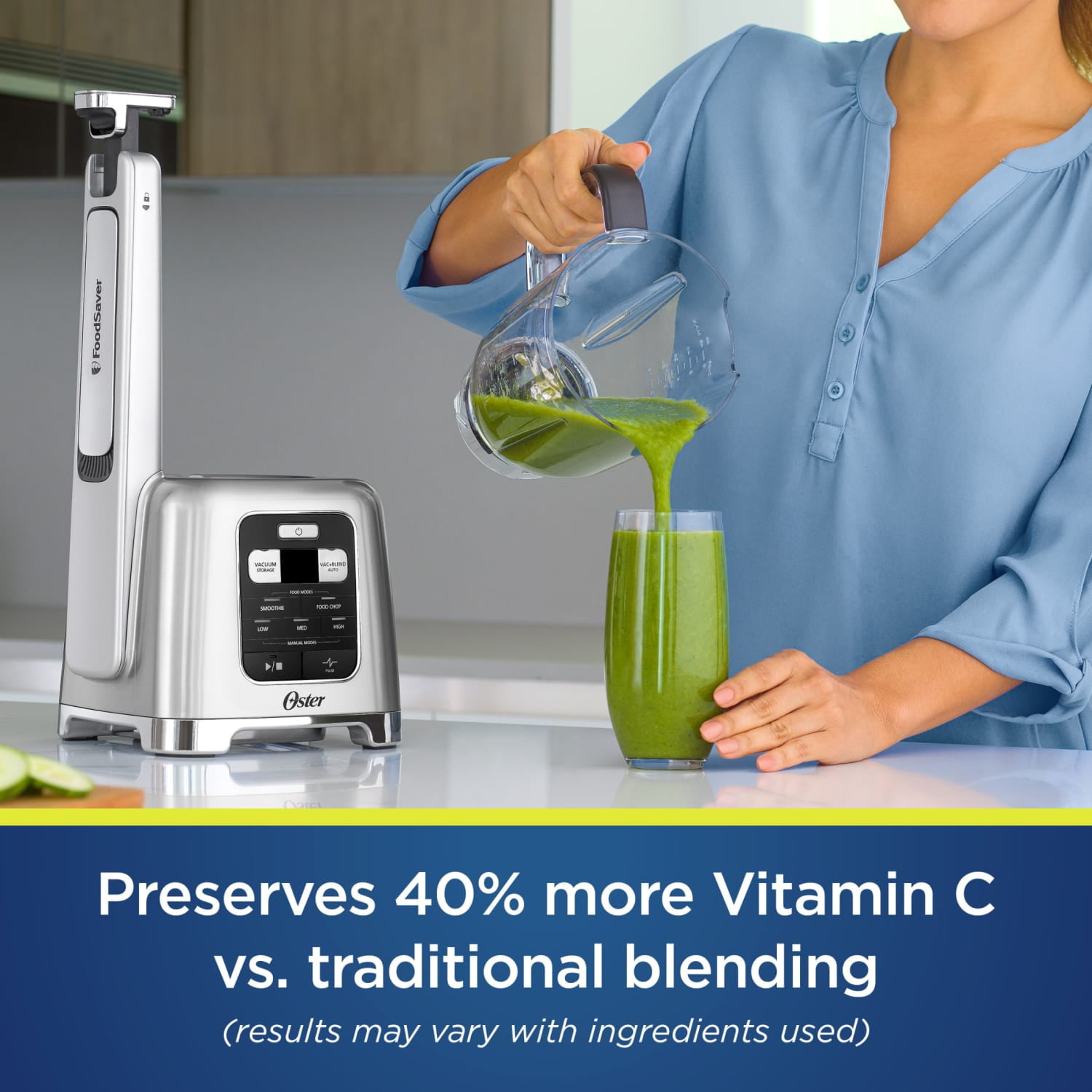 A HEALTHIER YOU: Vacuum blending is proven to preserve more vitamins and nutrients compared to traditional blending, for healthier results and a healthier you FRESHER LONGER: By removing oxygen before blending, vacuum technology keeps smoothies and blended drinks fresher longer—up to 24 hours—so you can prep ahead for next-day enjoyment FOODSAVER™ VACUUM SEALING SYSTEM: Using innovative vacuum technology, oxygen from the jar is removed before blending to create a smoother, more colorful blend free of bubbles and foam, and with less separation for better consistency 5 PRE-PROGRAMMED SETTINGS: Take the guesswork out of blending, and blend meals and drinks to perfection using pre-programmed settings, including Smoothie and Food Chop POWERFUL 1000-WATT MOTOR: Easily crush ice and blend through frozen fruits and vegetables with ease for smooth, nutritious, and delicious results, everytime VACUUM COMPATIBLE STORAGE CUP INCLUDED: 24-oz. storage cup lets you vacuum seal your drink then store it for up to 24 hours or take it on the go SATISFACTION GUARANTEED: 5 -year satisfaction guarantee; life-tested for up to 6,500 smoothies