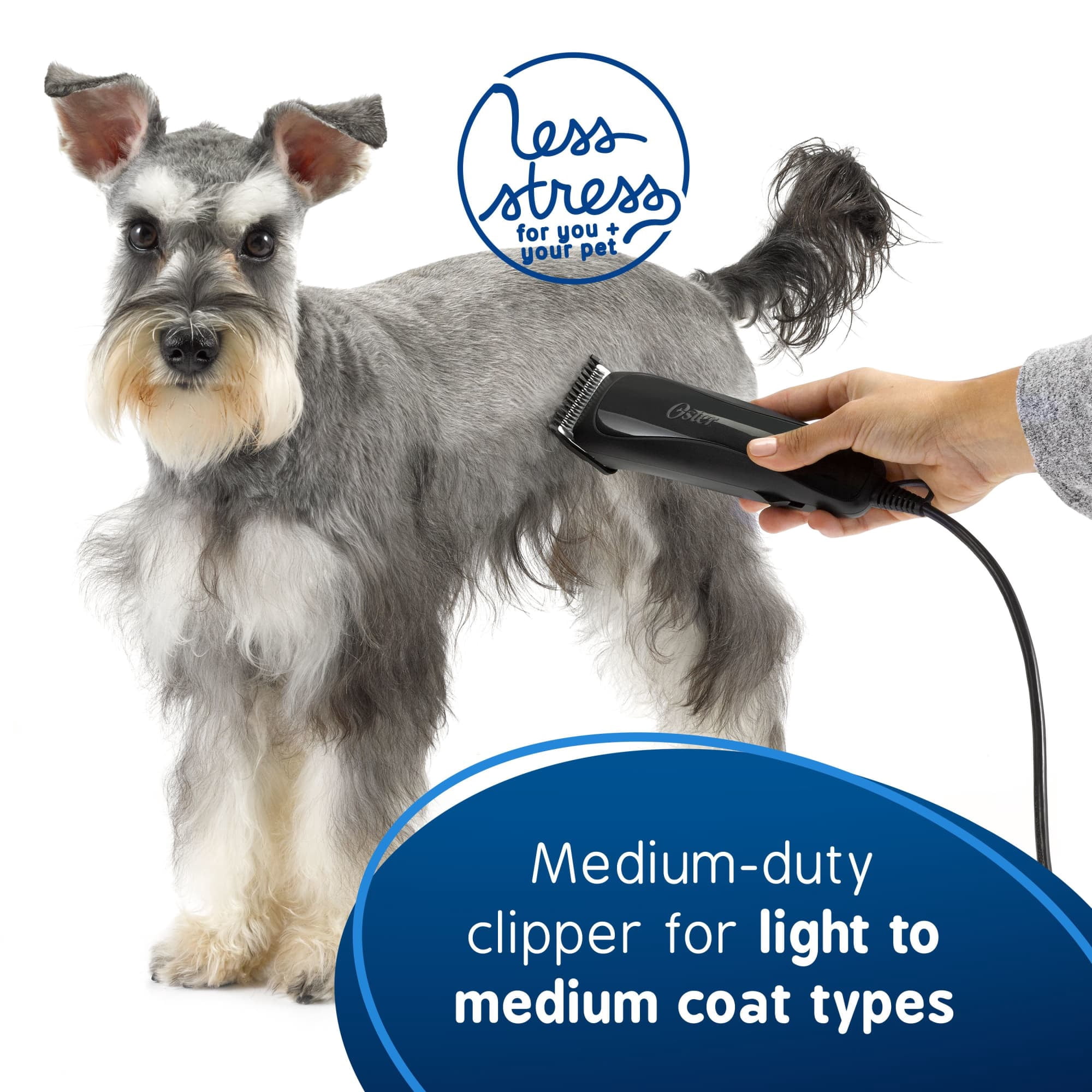 Oster Medium-duty clippers ideal for light to medium coat dogs and cats. Includes guide combs, lubricating oil and brush, and storage case Tug-Free blade for Yelp-Free clips Slim grip for better control Powerful pivot motor cuts through light to medium coats with ease Extended 8-foot cord length 1 year limited warranty 7.0 inches x 2.0 inches x 1.8 inches 0.9 lb