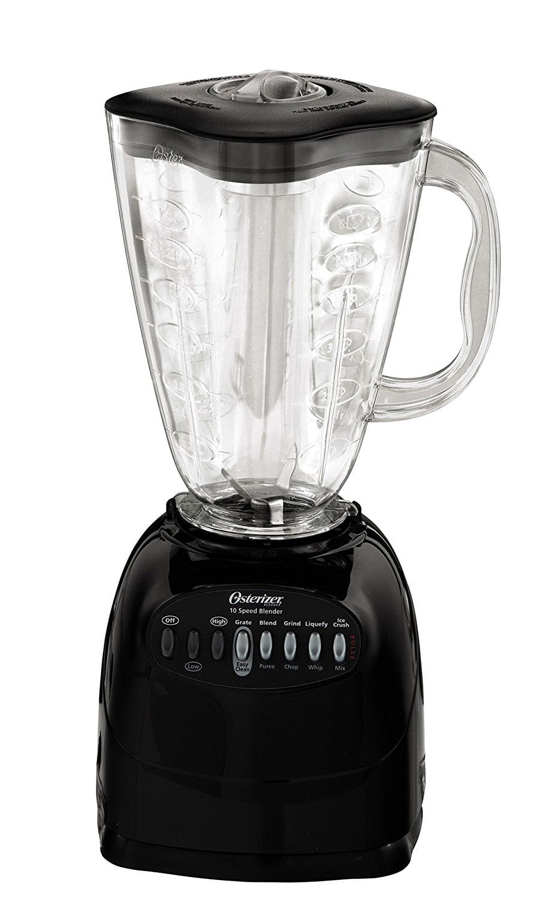 The Oster Cube 10-Speed Blender combines quality and simplicity for delicious drinks, sauces, and dips every time. Offering 10 speeds with simple push button functionality, this versatile kitchen blender makes it easy to crush, chop, and puree foods for meal preparation or to create delicious blended beverages. The new stainless steel blade pulverizes and chops with precision, while the 450-watt motor quickly crushes cubed ice for chunk-free blended drinks. The 6-cup plastic blending jar is BPA-free, dishwasher safe, and thermal shock tested, allowing you to use it directly out of the dishwasher without fear it will crack. The sides of the jar are marked for easy measuring, and the cap includes a built-in 2-ounce measuring cup, so you can easily follow along with recipes. The durable All-Metal Drive is designed to last and is backed by a 10-year warranty.