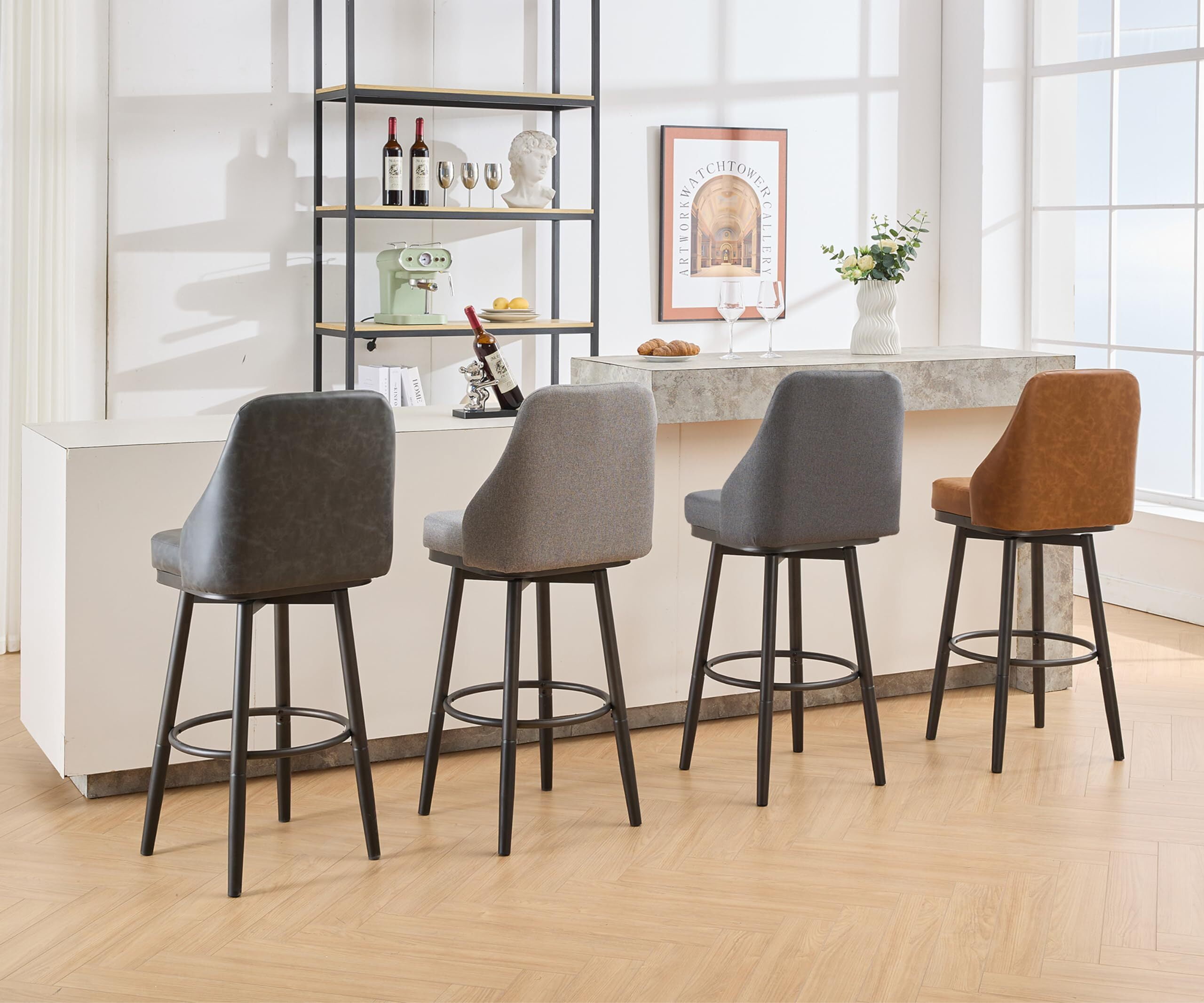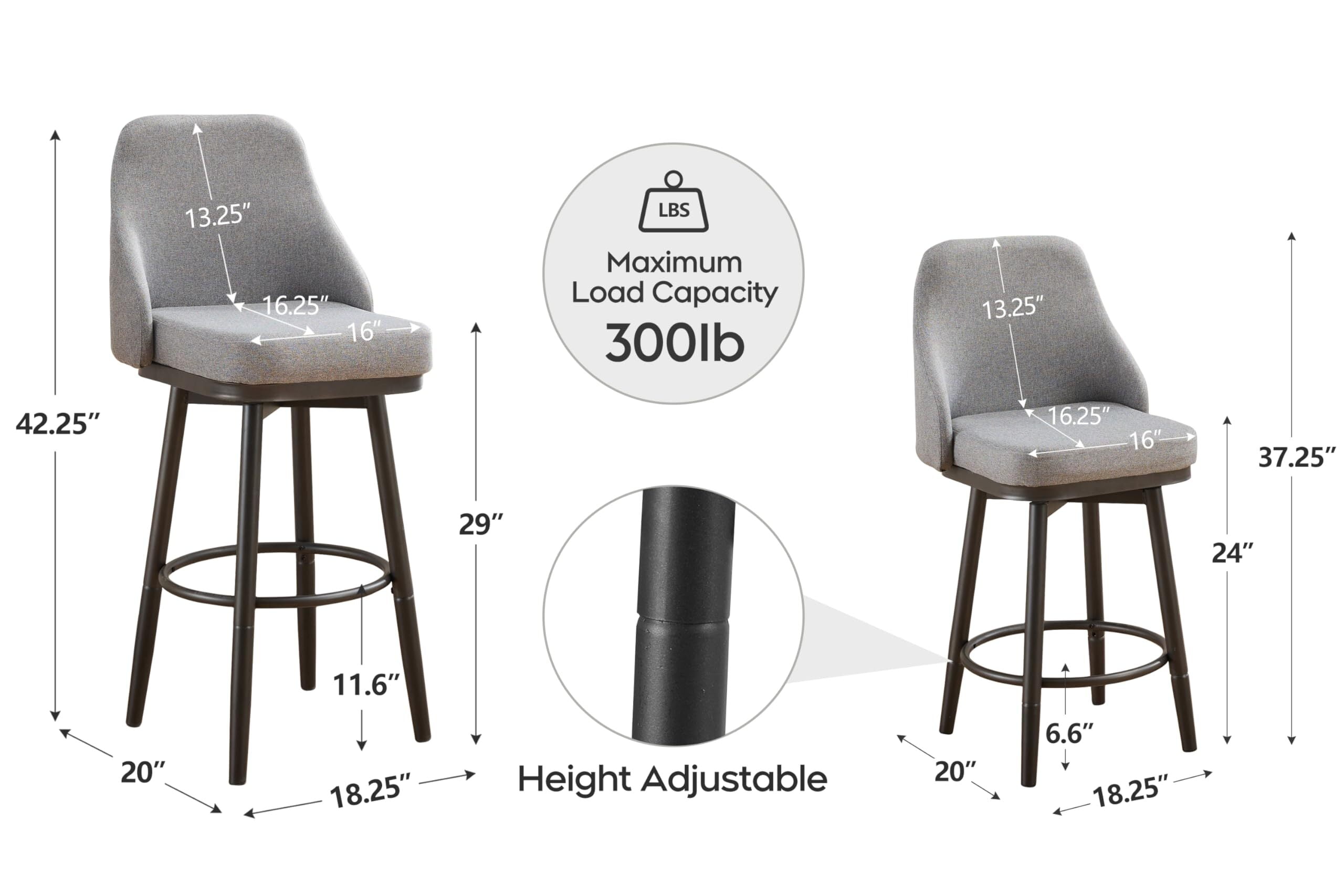 Premium PU Leather: The seat and backrest are upholstered in high-quality PU leather, providing a luxurious look and feel while ensuring easy maintenance and durability. 360-Degree Swivel: Enjoy the convenience of a full 360-degree swivel feature, allowing for easy movement and interaction in any space. Interchangeable Metal Legs: Customize the look and height of your stool with our interchangeable metal legs. Available in two sizes: 24 inches for lower counters and 29 inches for higher bar tops. Mid Back Design: The mid-back design offers optimal support and comfort, making it perfect for extended sitting periods. Foot Rest: Designed with an integrated footrest for added comfort and support, helping you maintain a relaxed posture. Sturdy Construction: Each stool can support up to 300 lbs, thanks to its robust metal frame and high-quality materials.