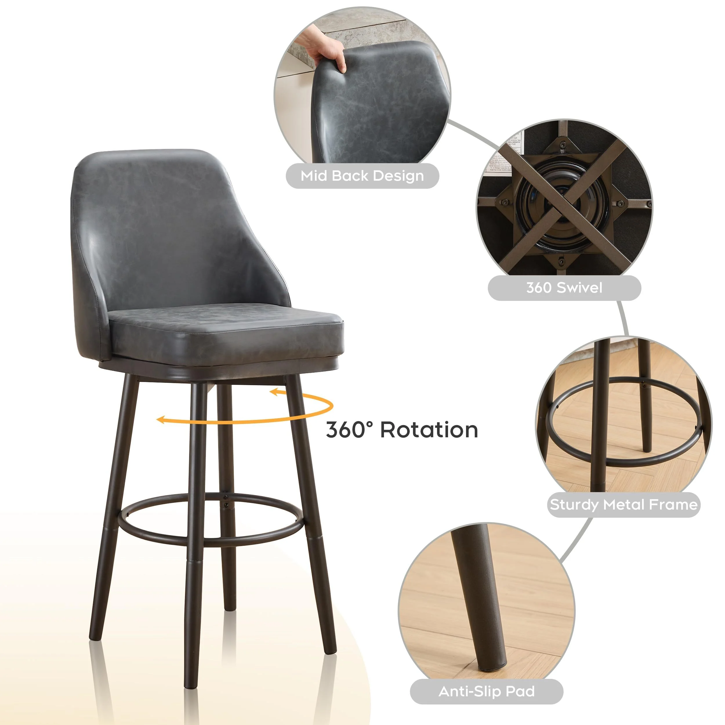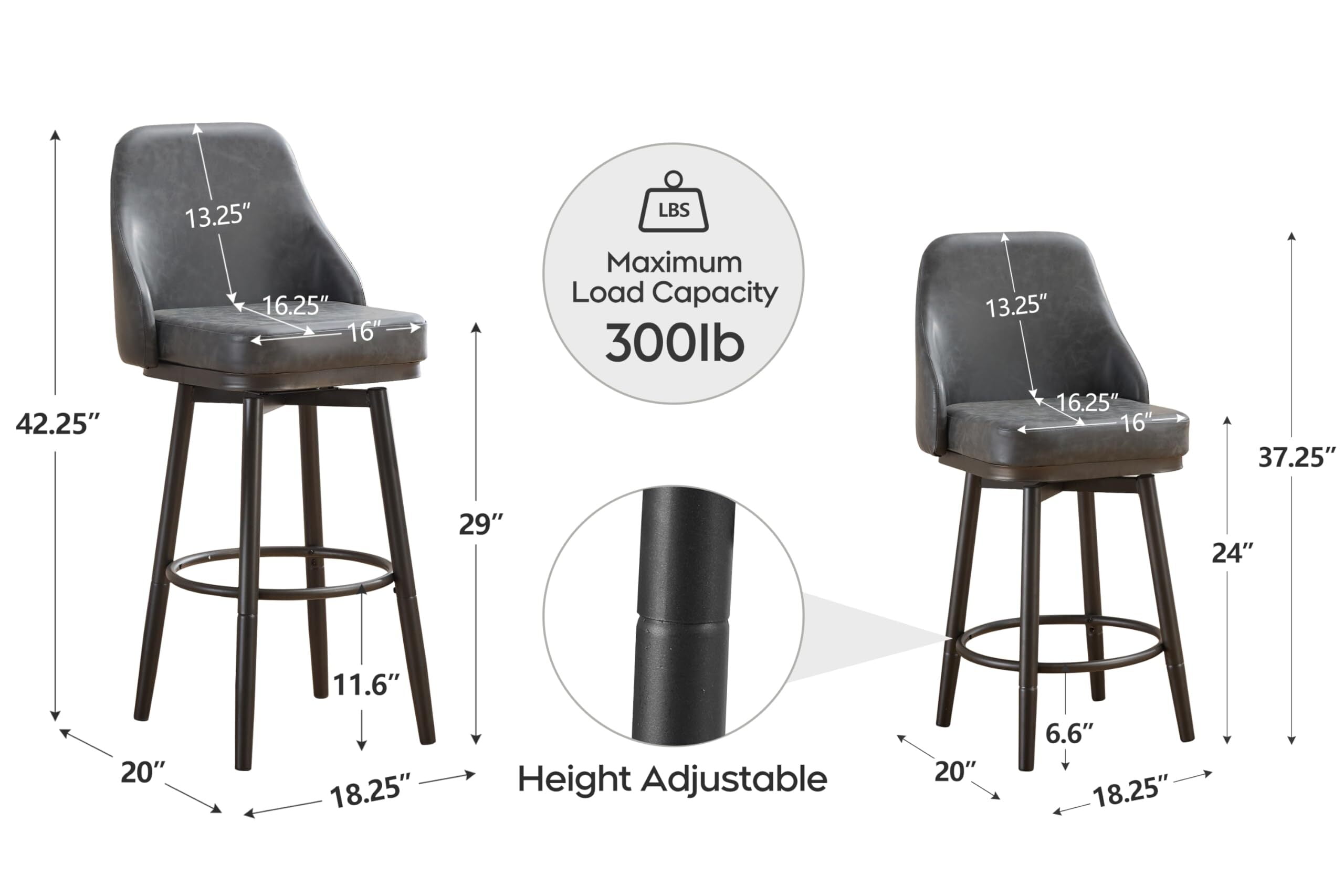 Premium PU Leather: The seat and backrest are upholstered in high-quality PU leather, providing a luxurious look and feel while ensuring easy maintenance and durability. 360-Degree Swivel: Enjoy the convenience of a full 360-degree swivel feature, allowing for easy movement and interaction in any space. Interchangeable Metal Legs: Customize the look and height of your stool with our interchangeable metal legs. Available in two sizes: 24 inches for lower counters and 29 inches for higher bar tops. Mid Back Design: The mid-back design offers optimal support and comfort, making it perfect for extended sitting periods. Foot Rest: Designed with an integrated footrest for added comfort and support, helping you maintain a relaxed posture. Sturdy Construction: Each stool can support up to 300 lbs, thanks to its robust metal frame and high-quality materials.